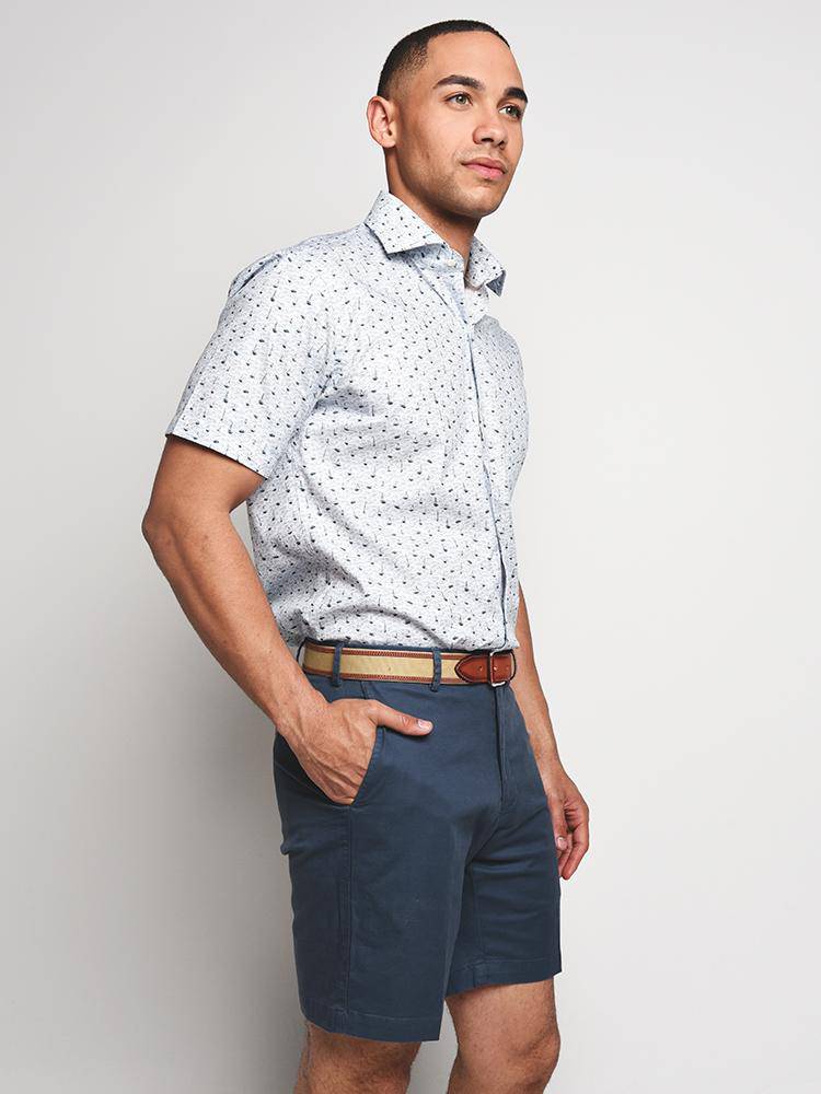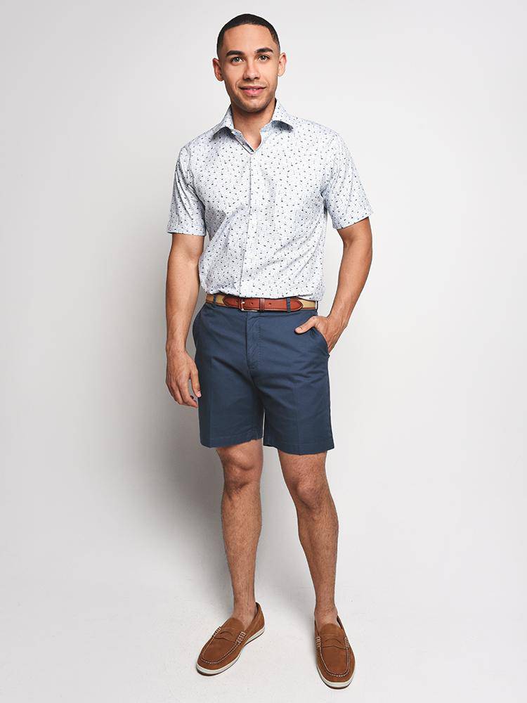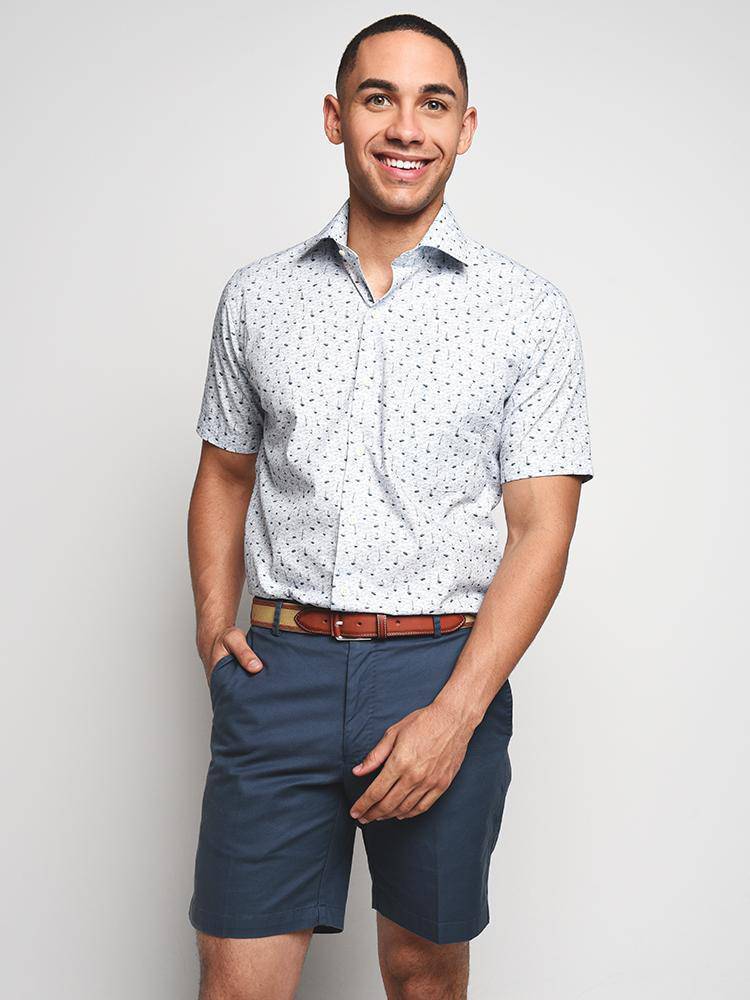 - Styled with Peter Millar shorts Style # MC0B13 and shoes Style # MS18F02. Model is wearing size medium shirt and size 32 short.