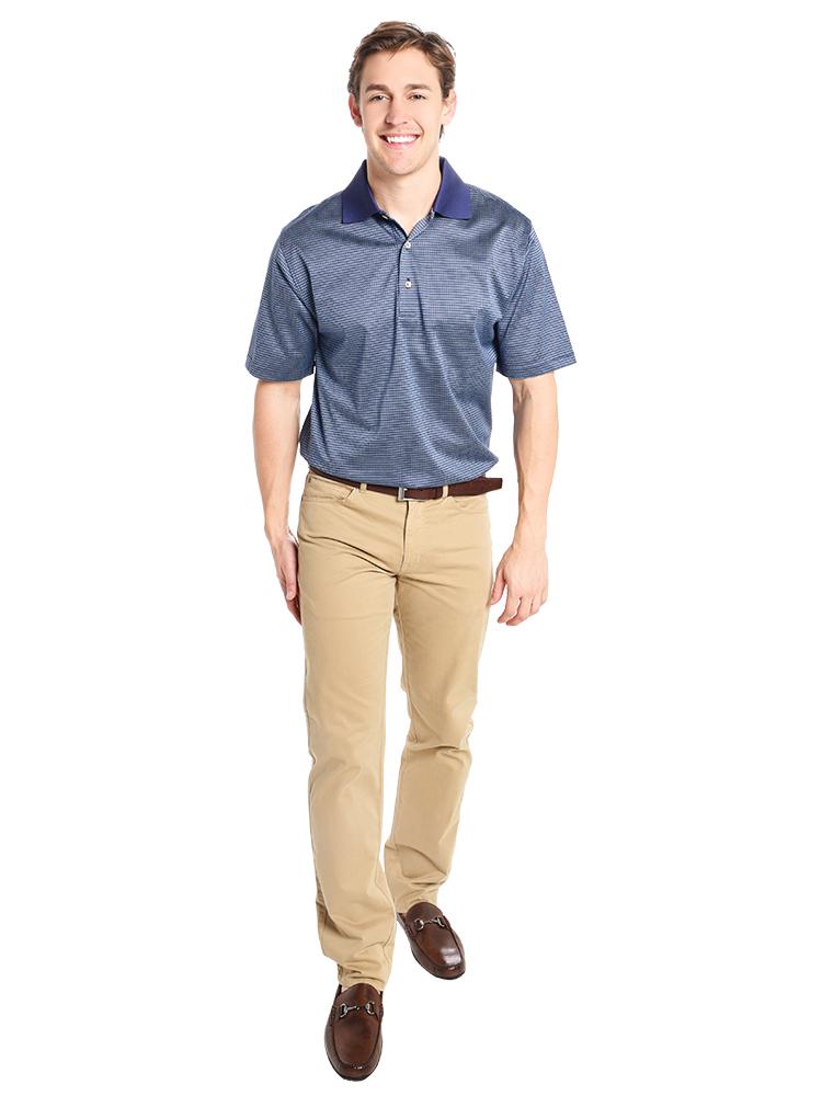- Styled with Peter Millar Style #MS17B93 and Peter Millar Loafer Style # MC0F40. Model is wearing Medium Shirt and size 32 Pant.