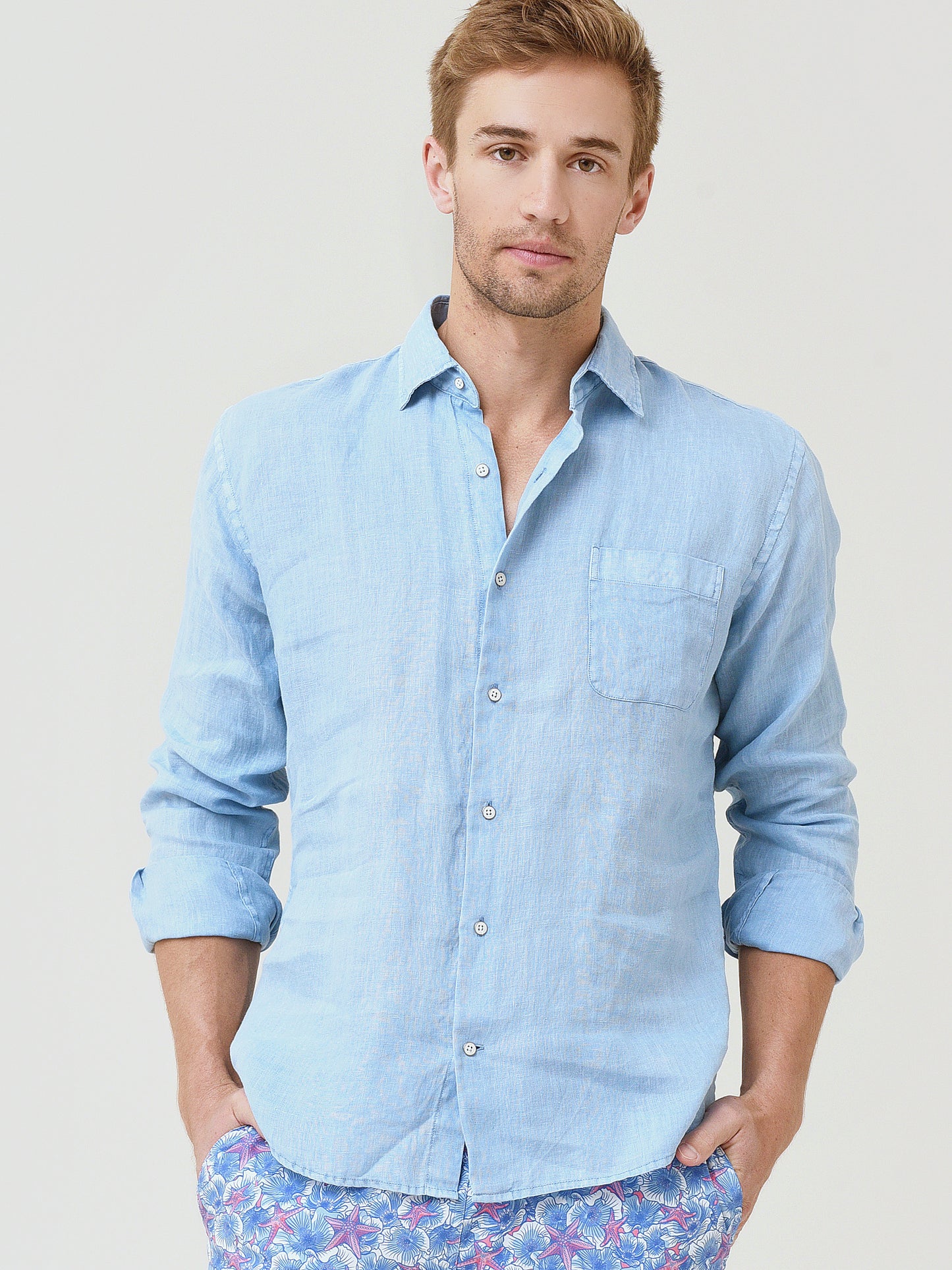 Garment-dyed linen button-down sport shirt in lightweight fabrication.