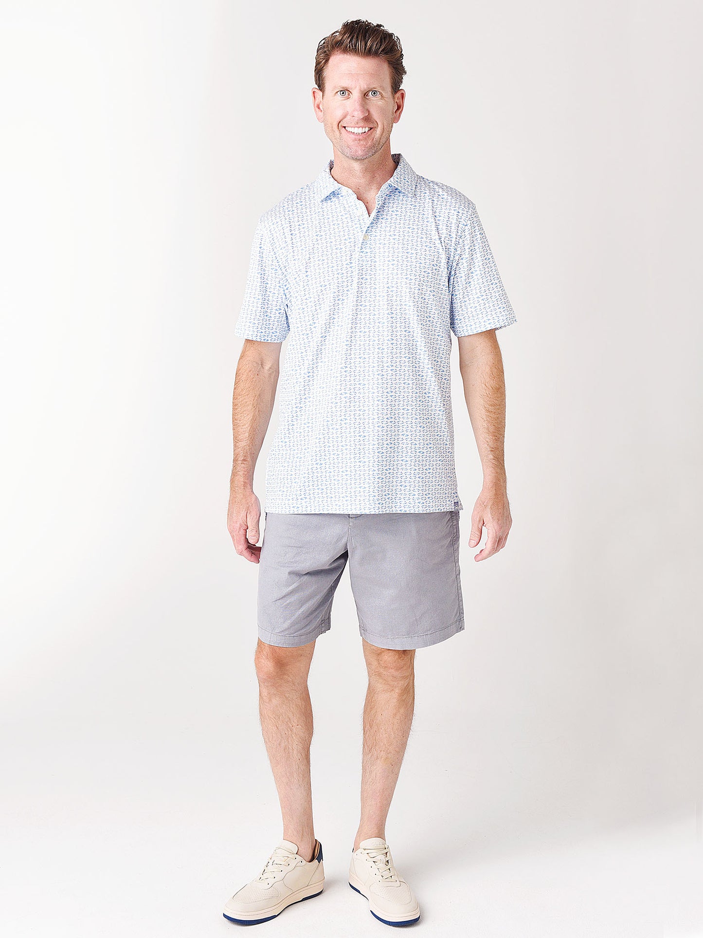 - Model is wearing size Medium polo.