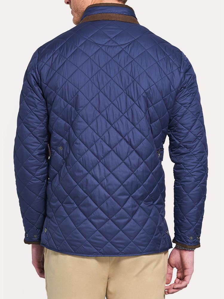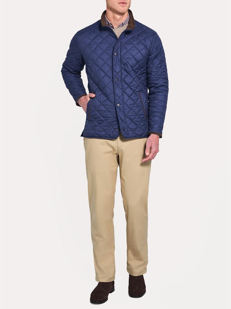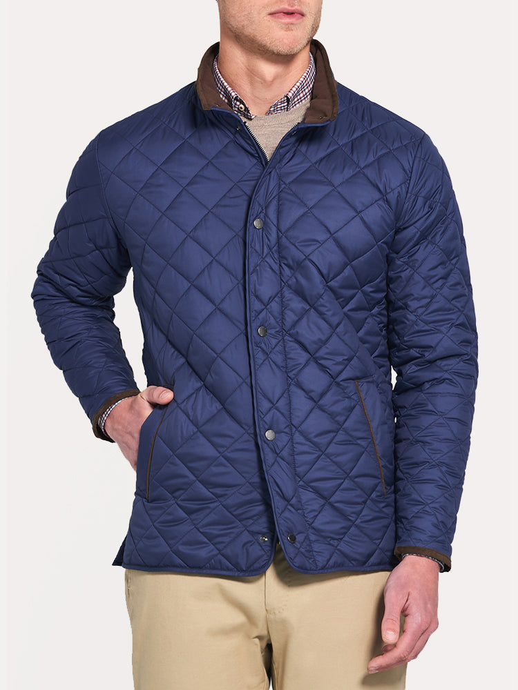 The Suffolk Car Coat was developed for fall and winter excursions into the countryside. This style is constructed from quilted lightweight cotton poplin that is infused with a combination of wax polymers for the ultimate weather-resistant wearing experience. Detailed with poly-plaited interior for easy layering over sweaters and sport shirts. Styled with a stand up collar, hidden zip-front, snap-button placket and side pockets.