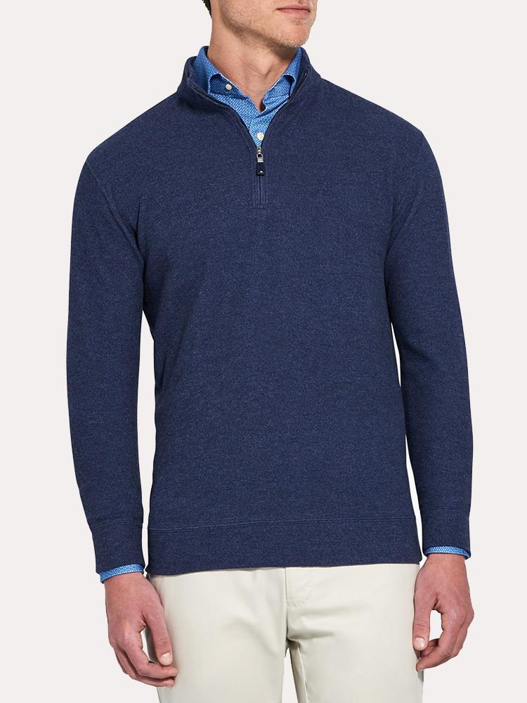 Tri-Blend Mélange Fleece Quarter-Zip is expertly crafted from a super-soft rayon, poly and cotton-blend Interlock fabric. This style features a peached finish and loft insulation. Finished with rib-knit cuffs and hem. Wear yours all fall and winter with Peter Millar sport shirts and trousers.