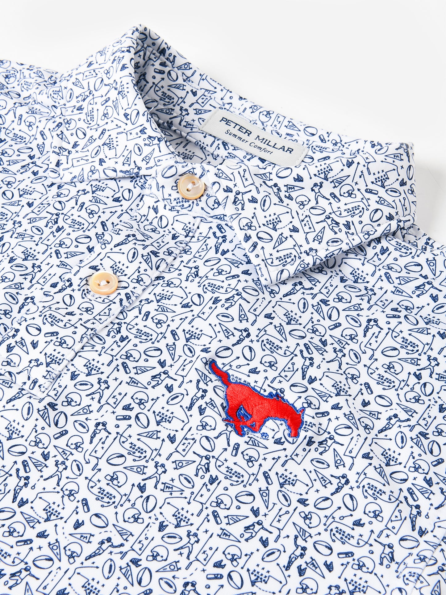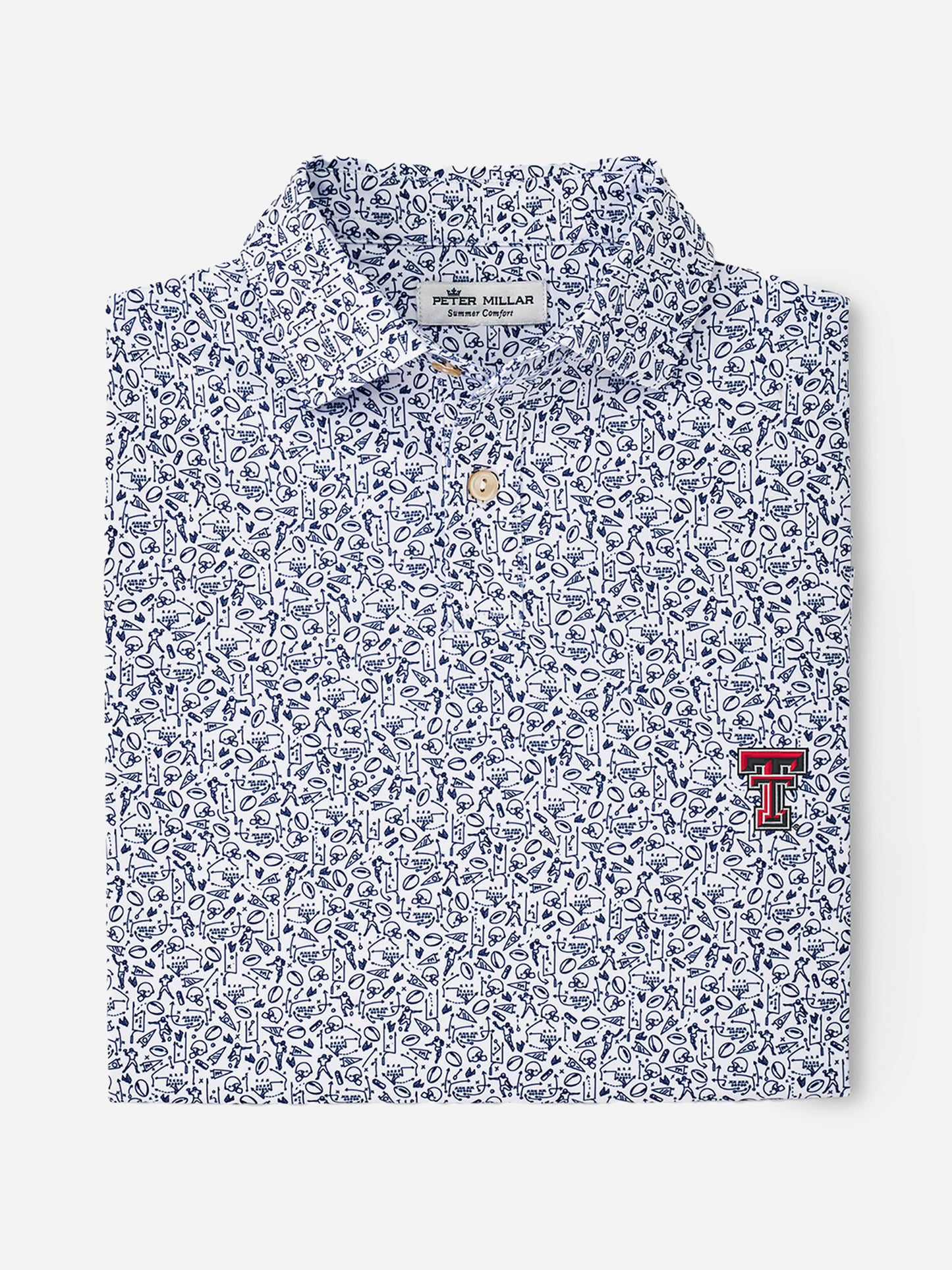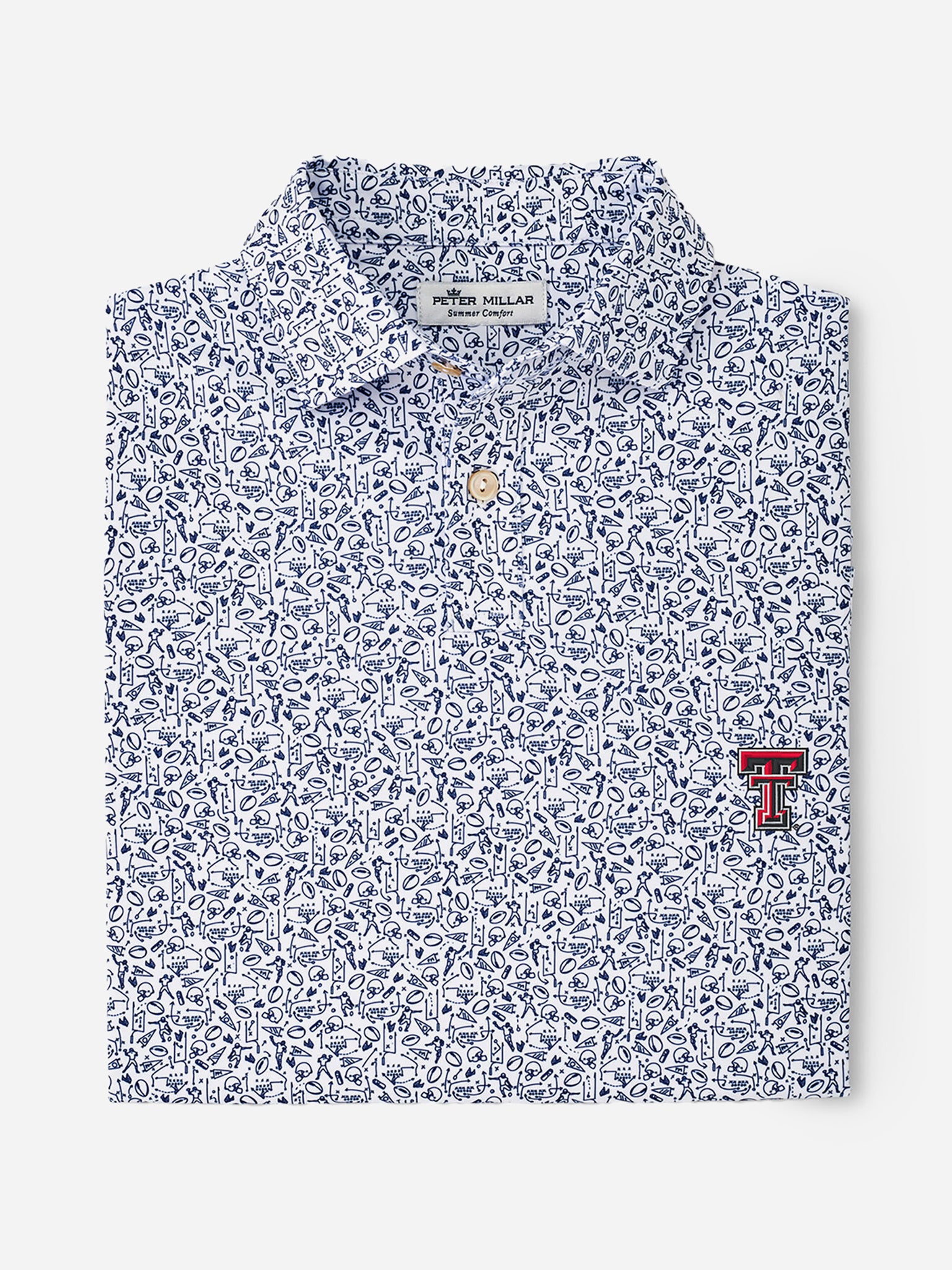 Collegiate gameday performance polo with comfortable stretch and sun protection technology.