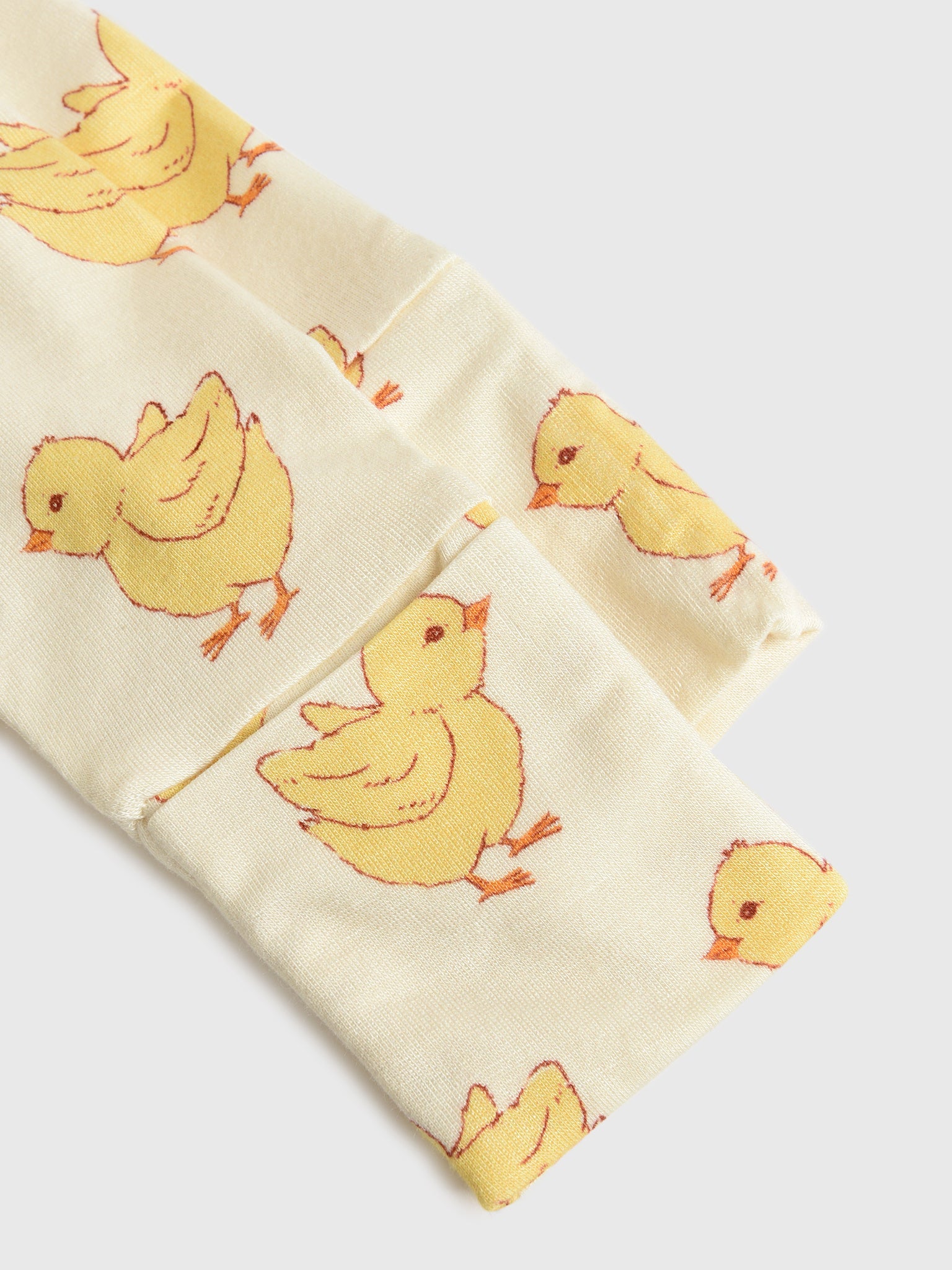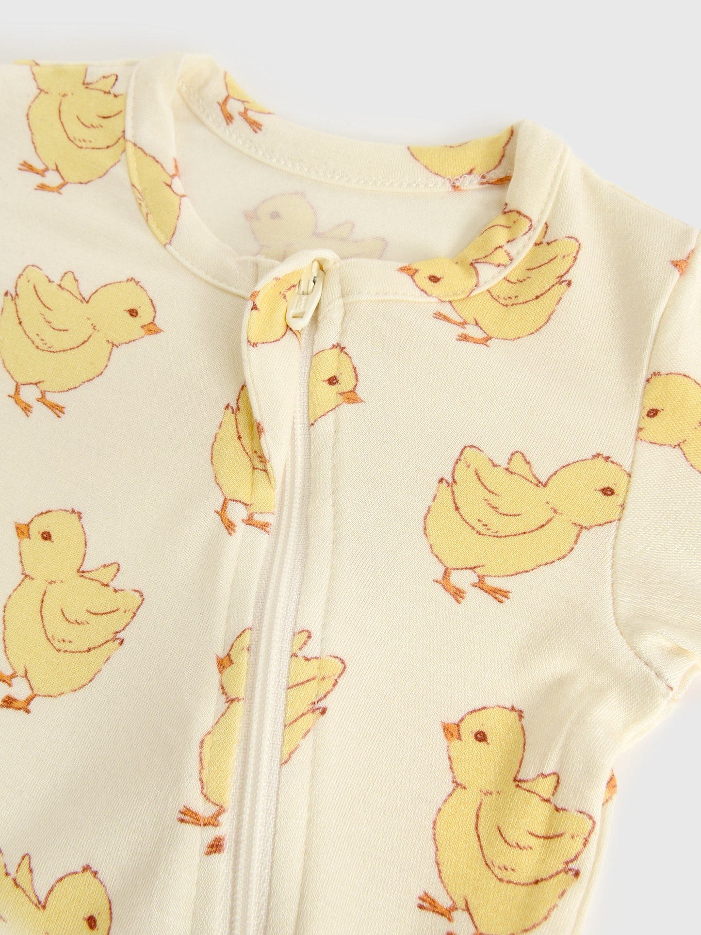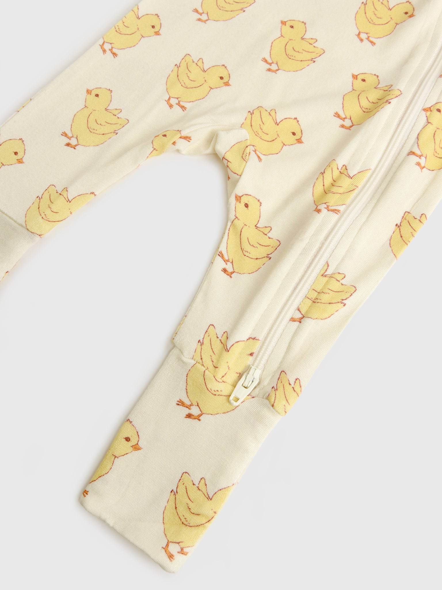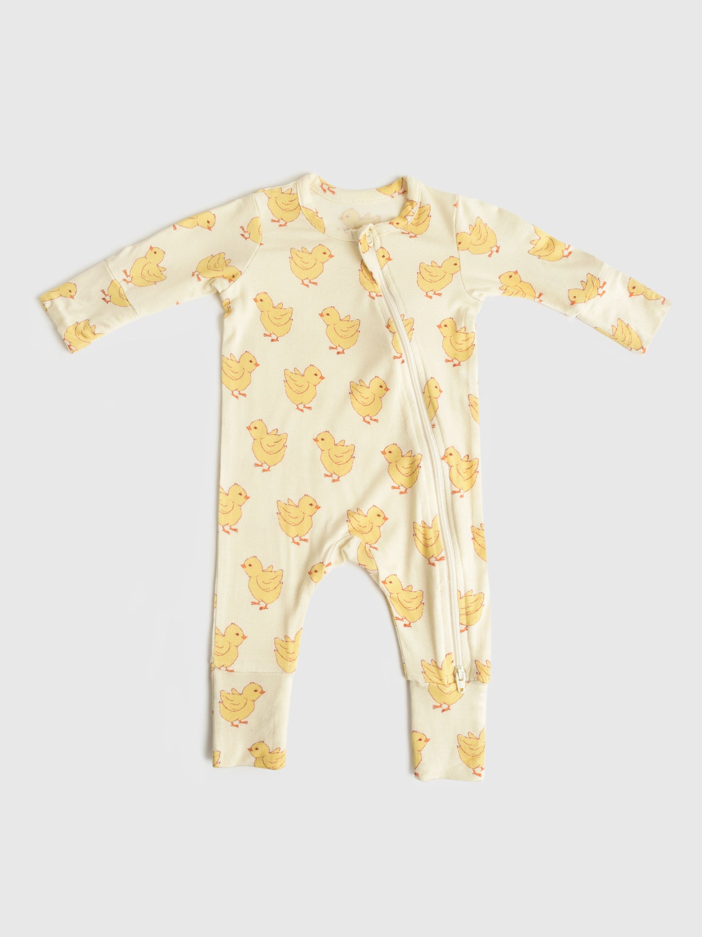 An incredibly soft onesie made from bamboo fabric with a custom baby chick print.