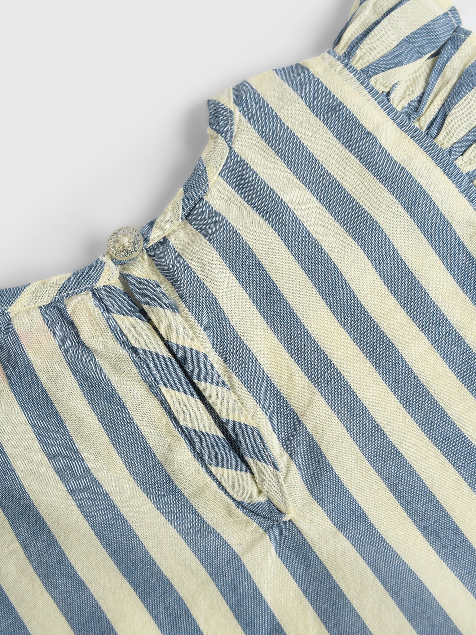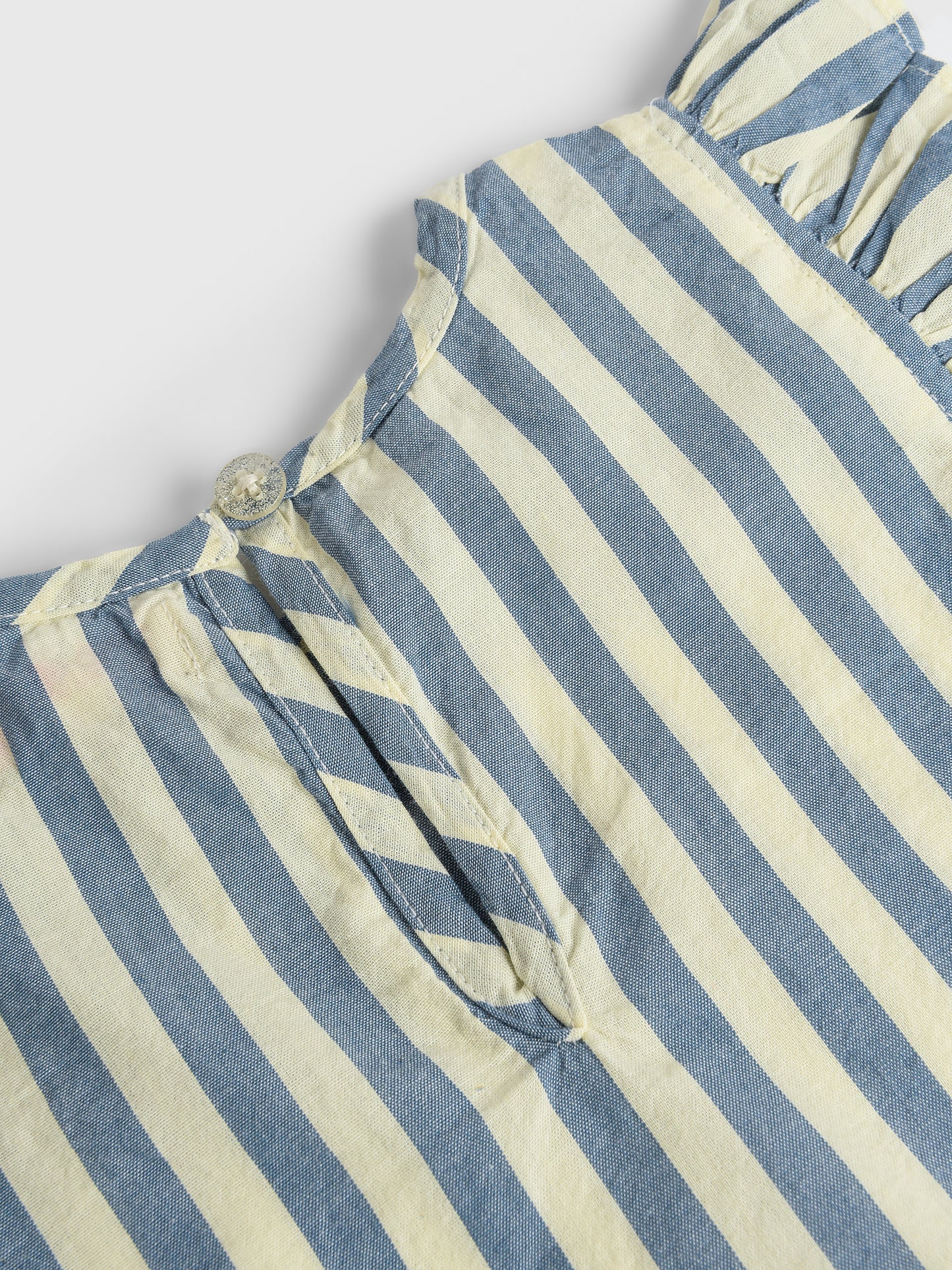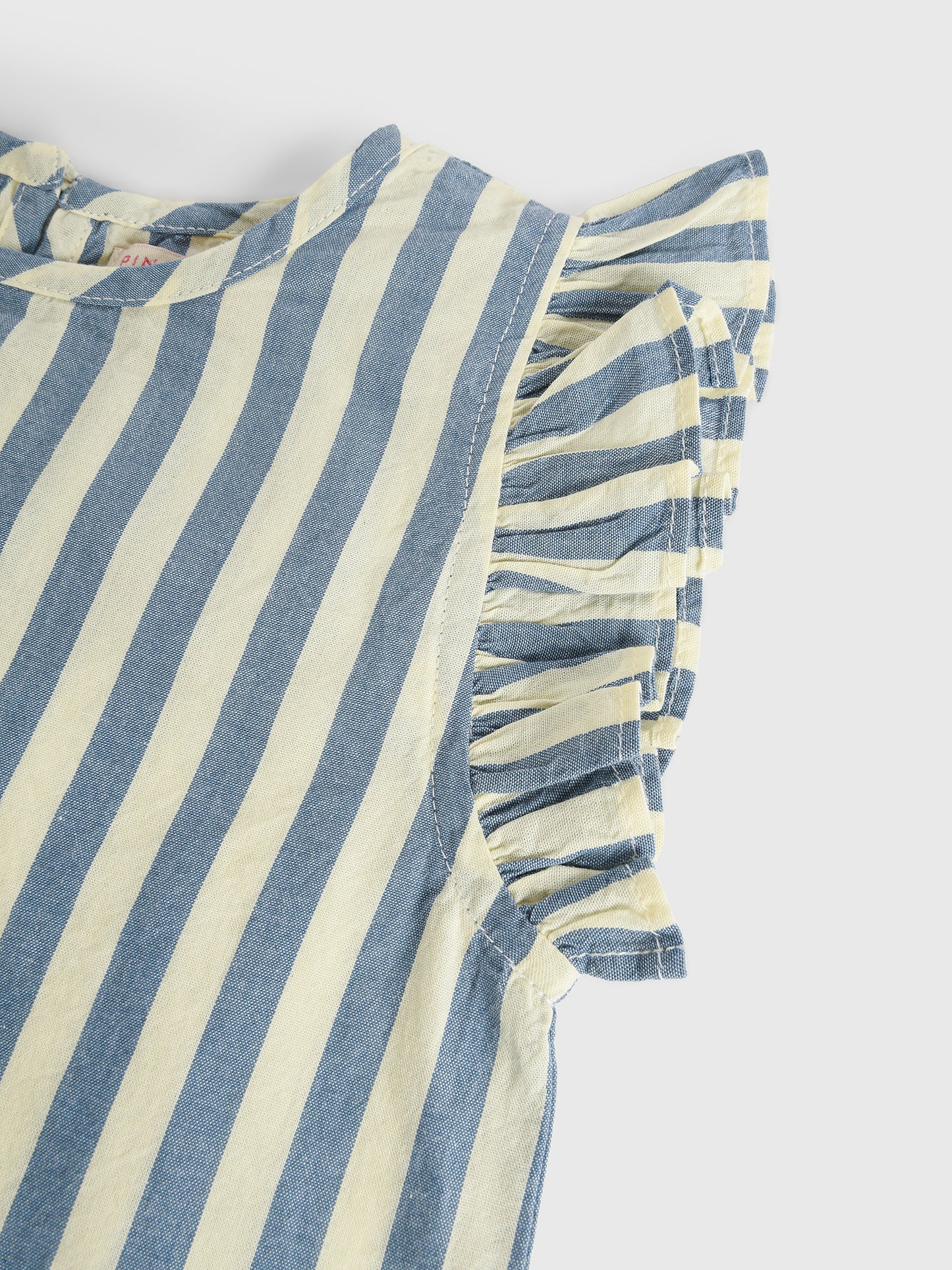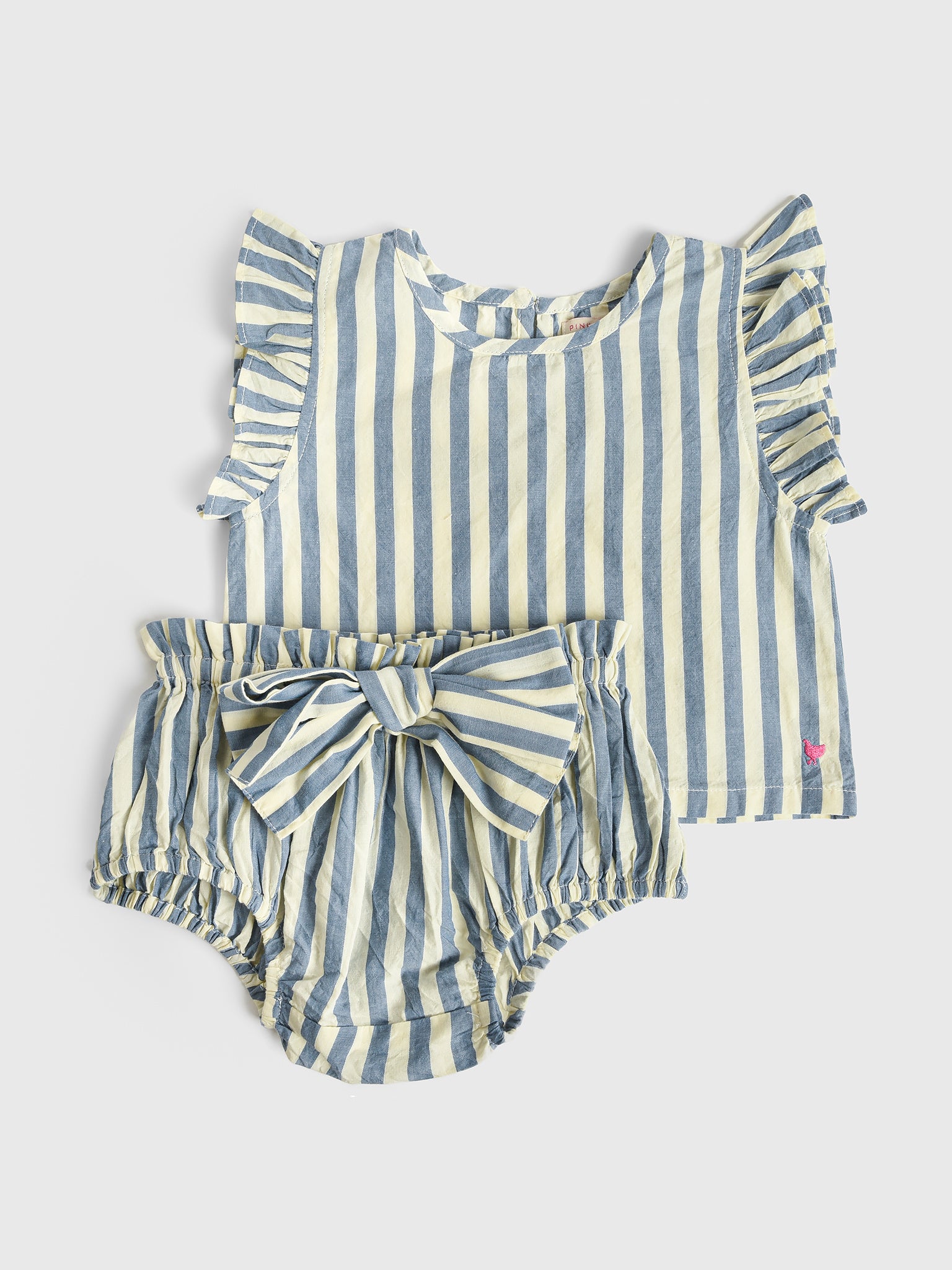 This stylish set is made from soft cotton fabric with a classic stripe print. It features ruffle sleeves and a fixed oversized bow on the elastic waist bottom.