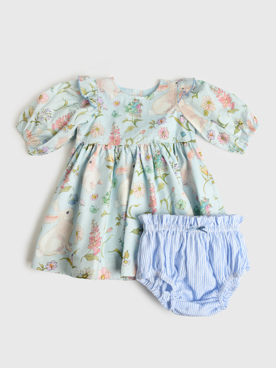 A lightweight cotton dress and diaper cover set featuring a custom watercolor bunny print.