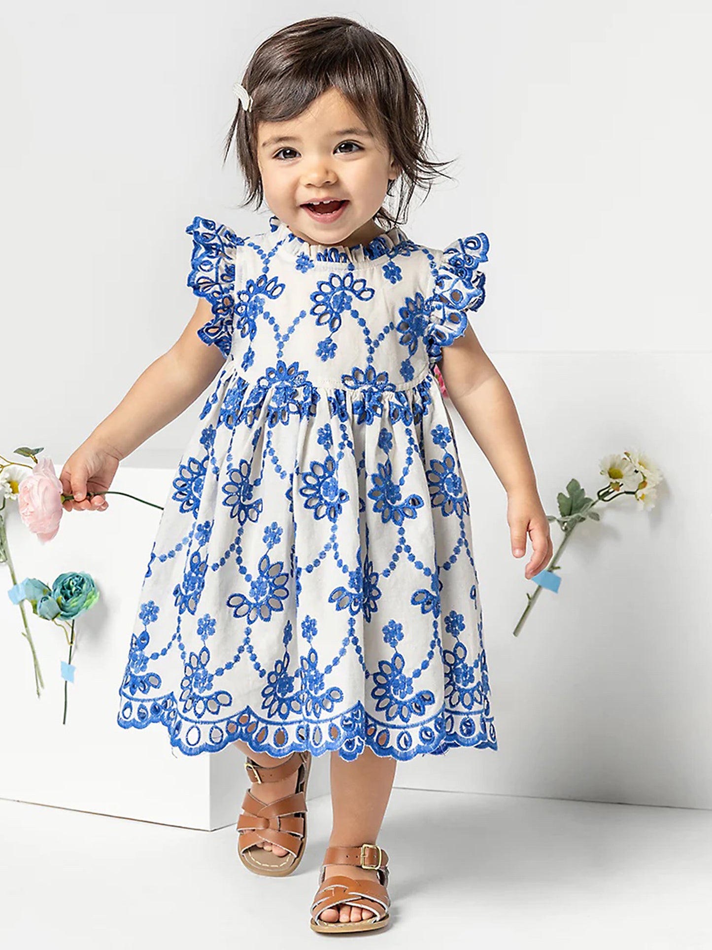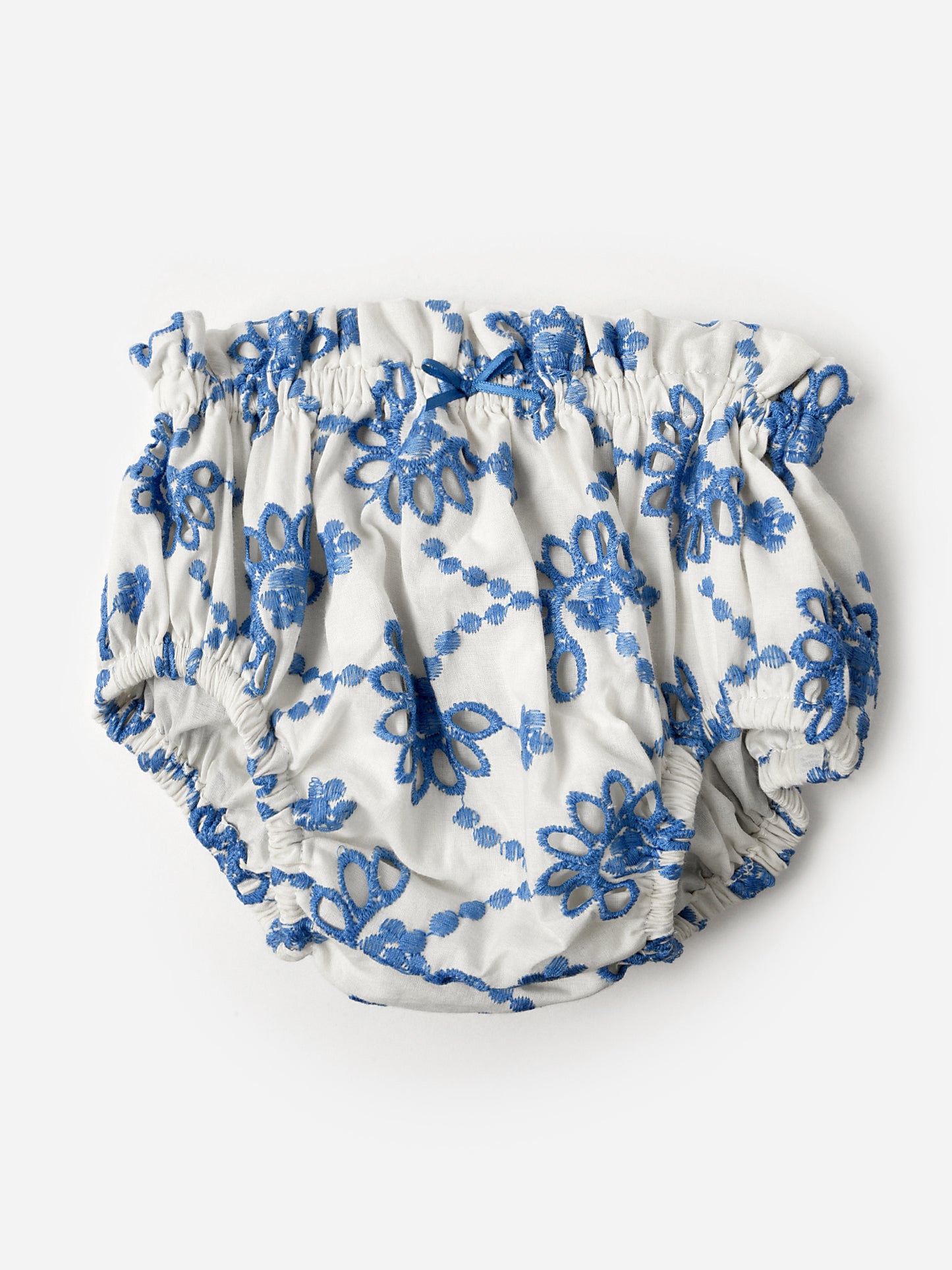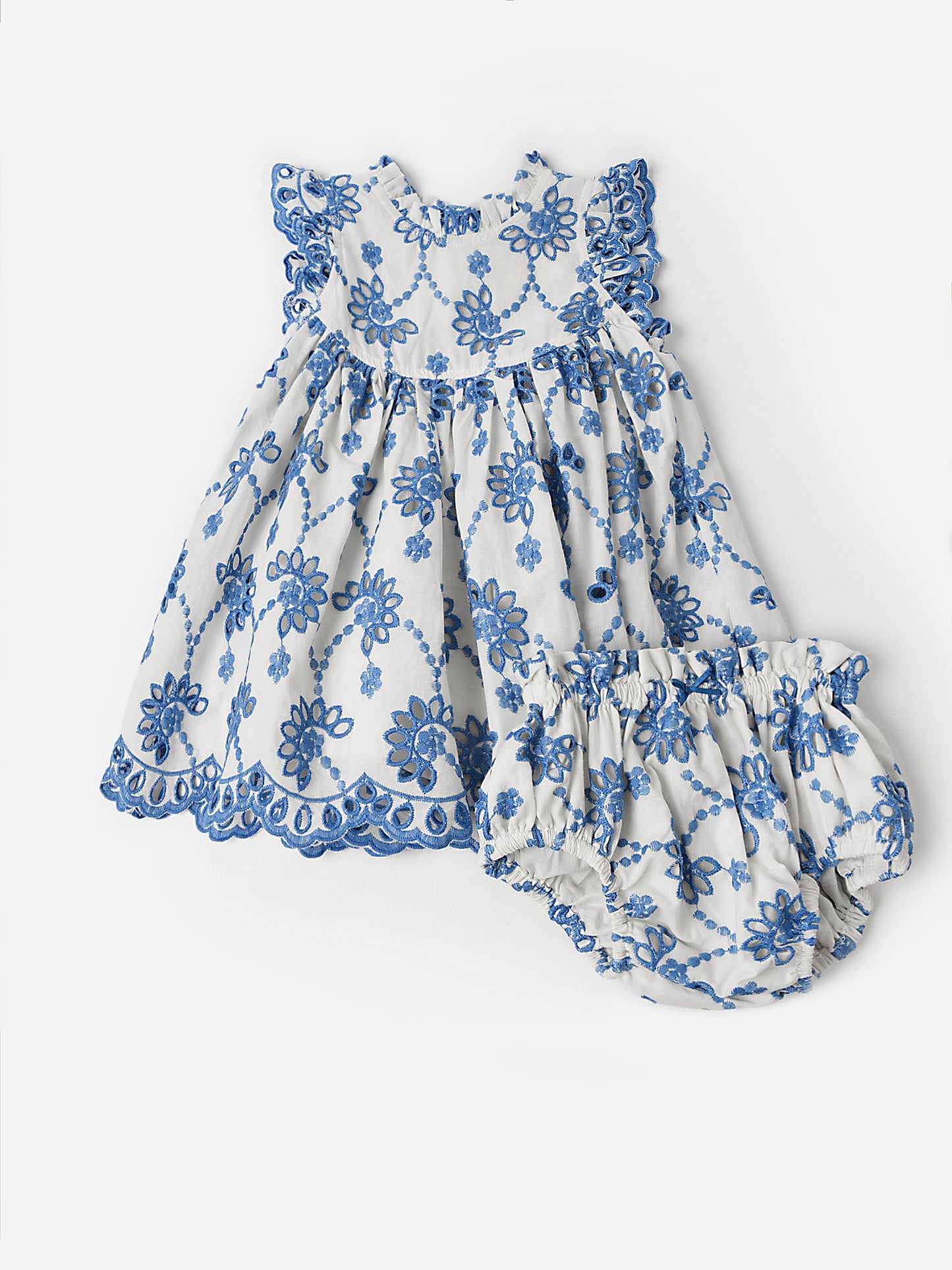 A beautiful dress and diaper cover set made from lightweight cotton with lovely blue eyelet embroidery.