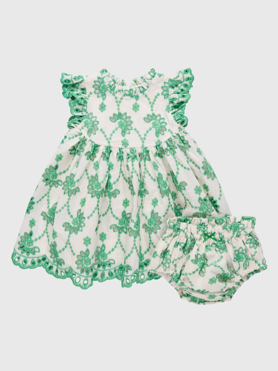 Ruffle Neckline Flutter Sleeves Gathered Skirt Scalloped Trims Eyelet Embroidery Matching Diaper Cover 100% Cotton Classic Fit
