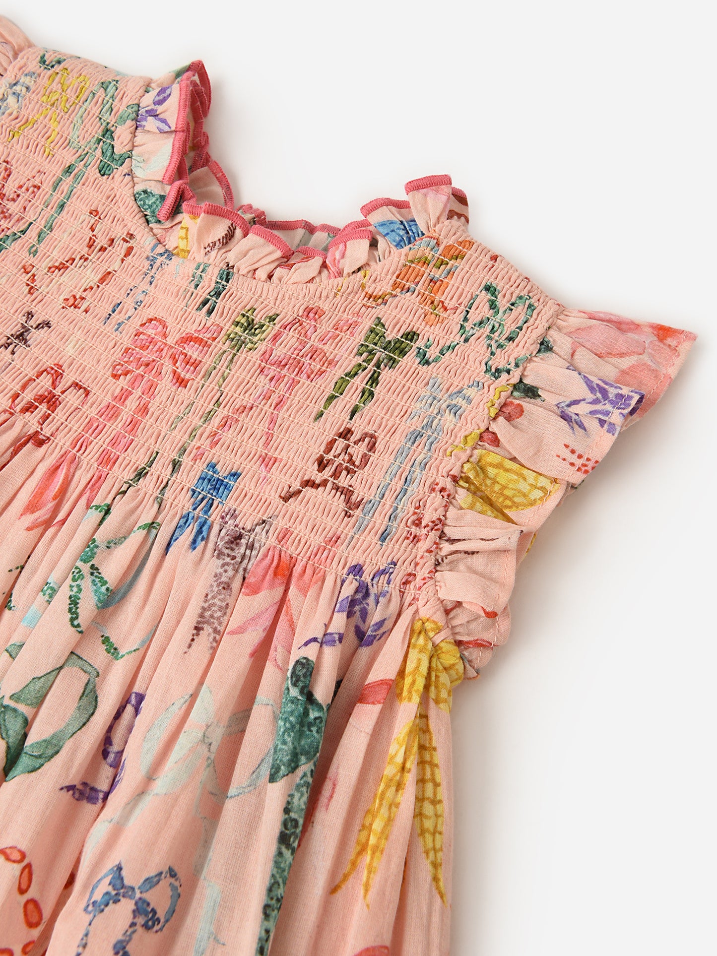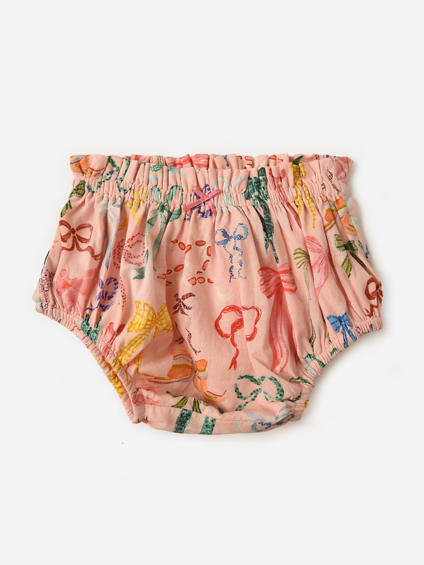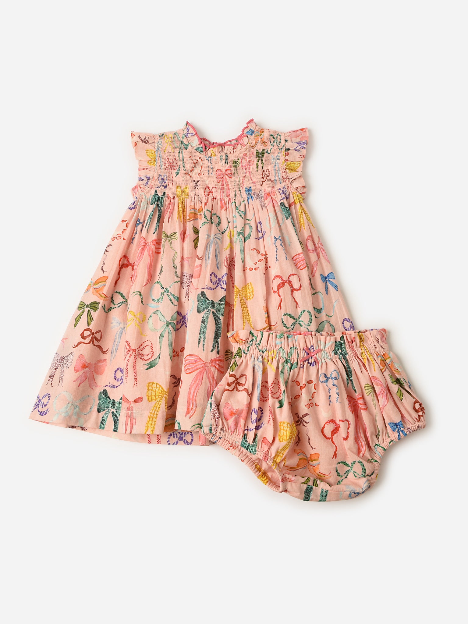 A dress and diaper cover set made from lightweight cotton with a custom watercolor bow print.