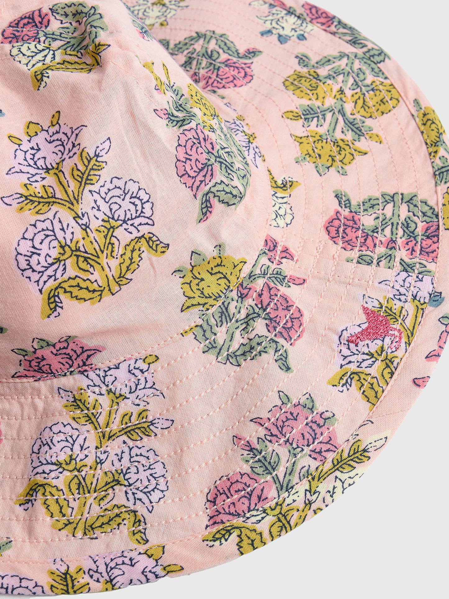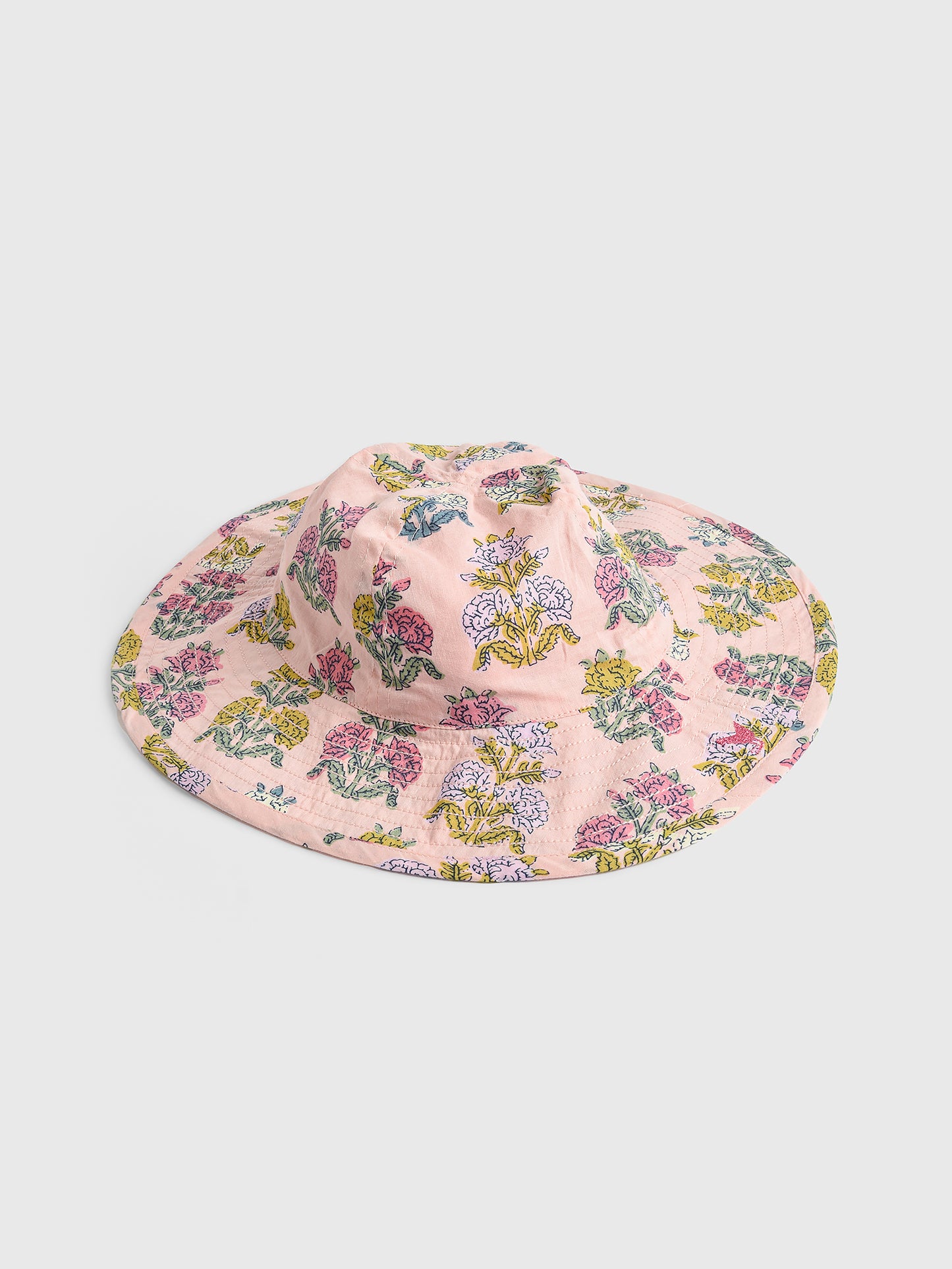 An adorable sun hat made from soft cotton fabric with a colorful floral print.