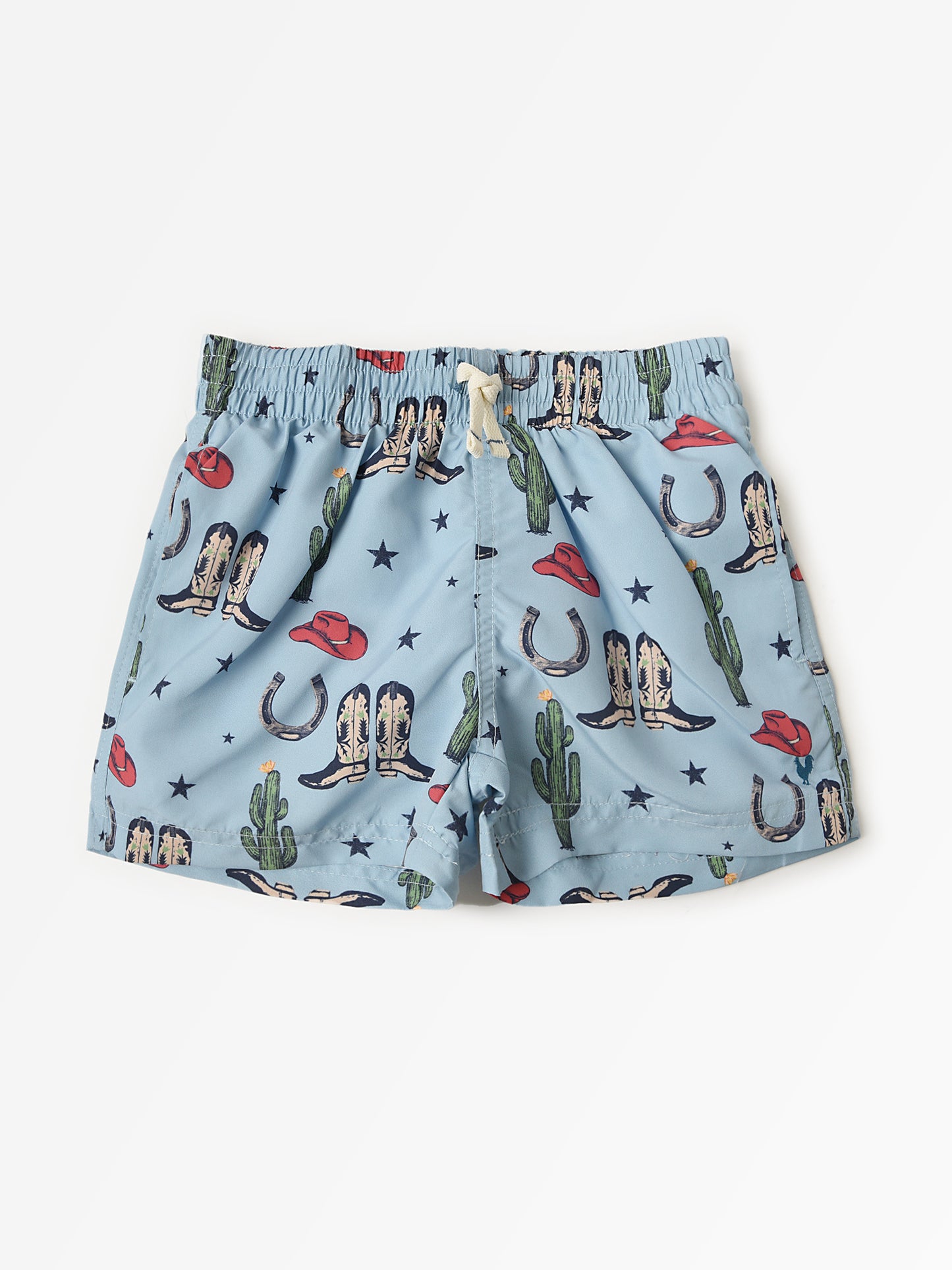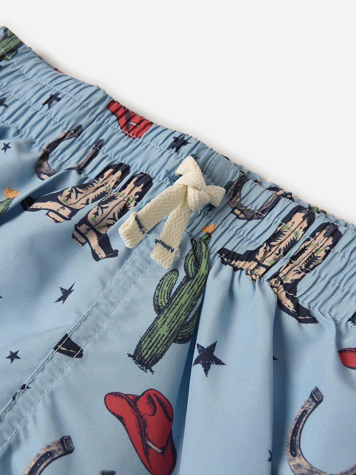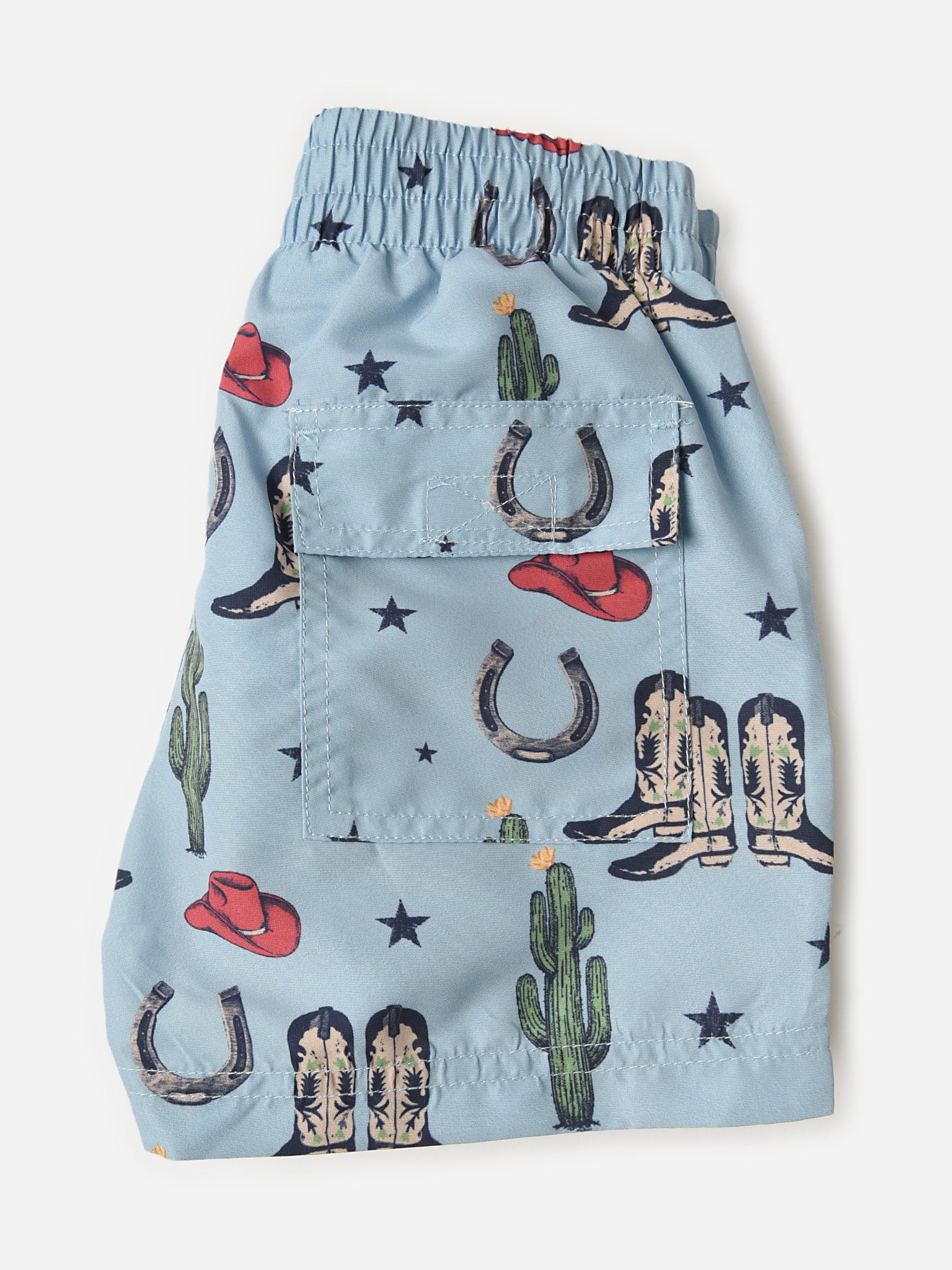 A quick-drying swim trunk with a mesh lining and custom rodeo print.