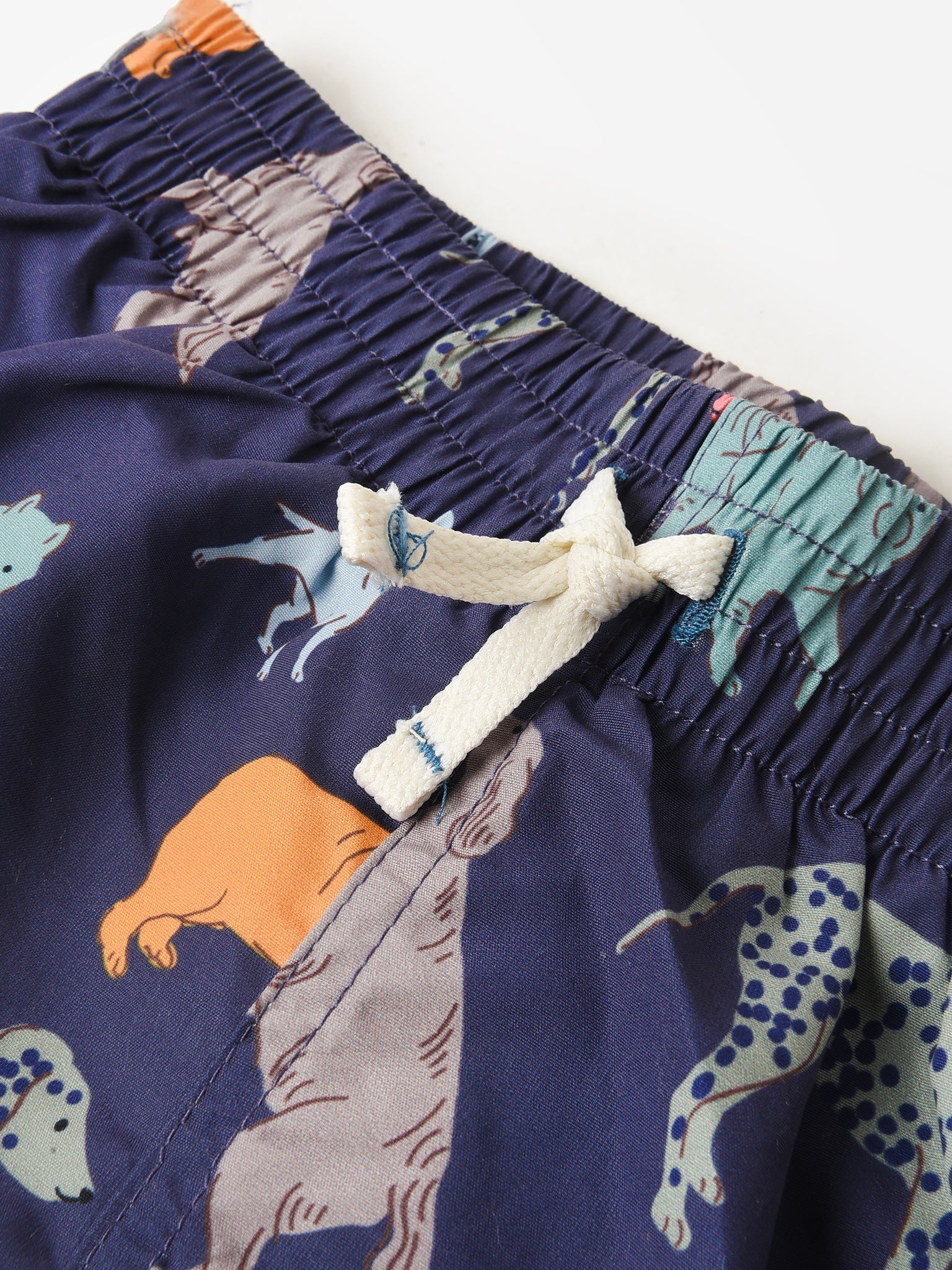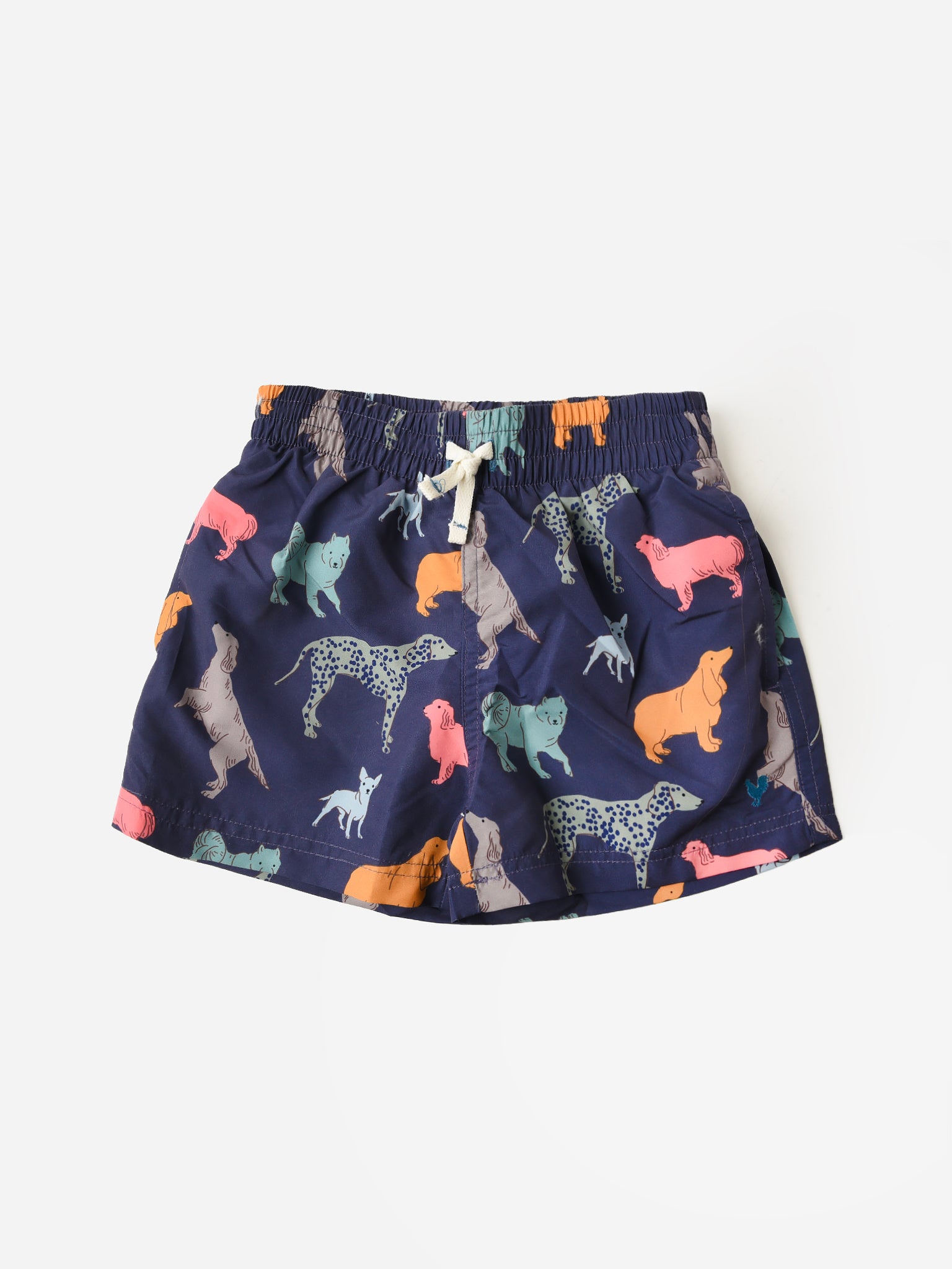 A breathable swim trunk with a comfortable mesh liner and a custom dog print.