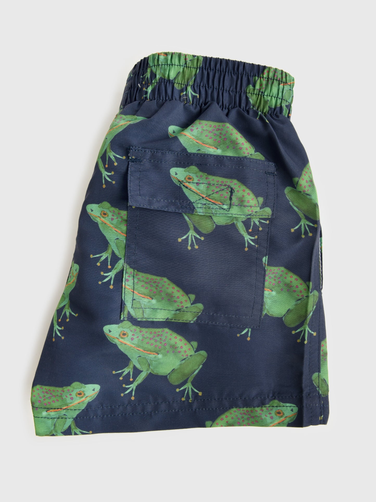 A lightweight swim trunk made from breathable fabric with a mesh lining and custom frog print.