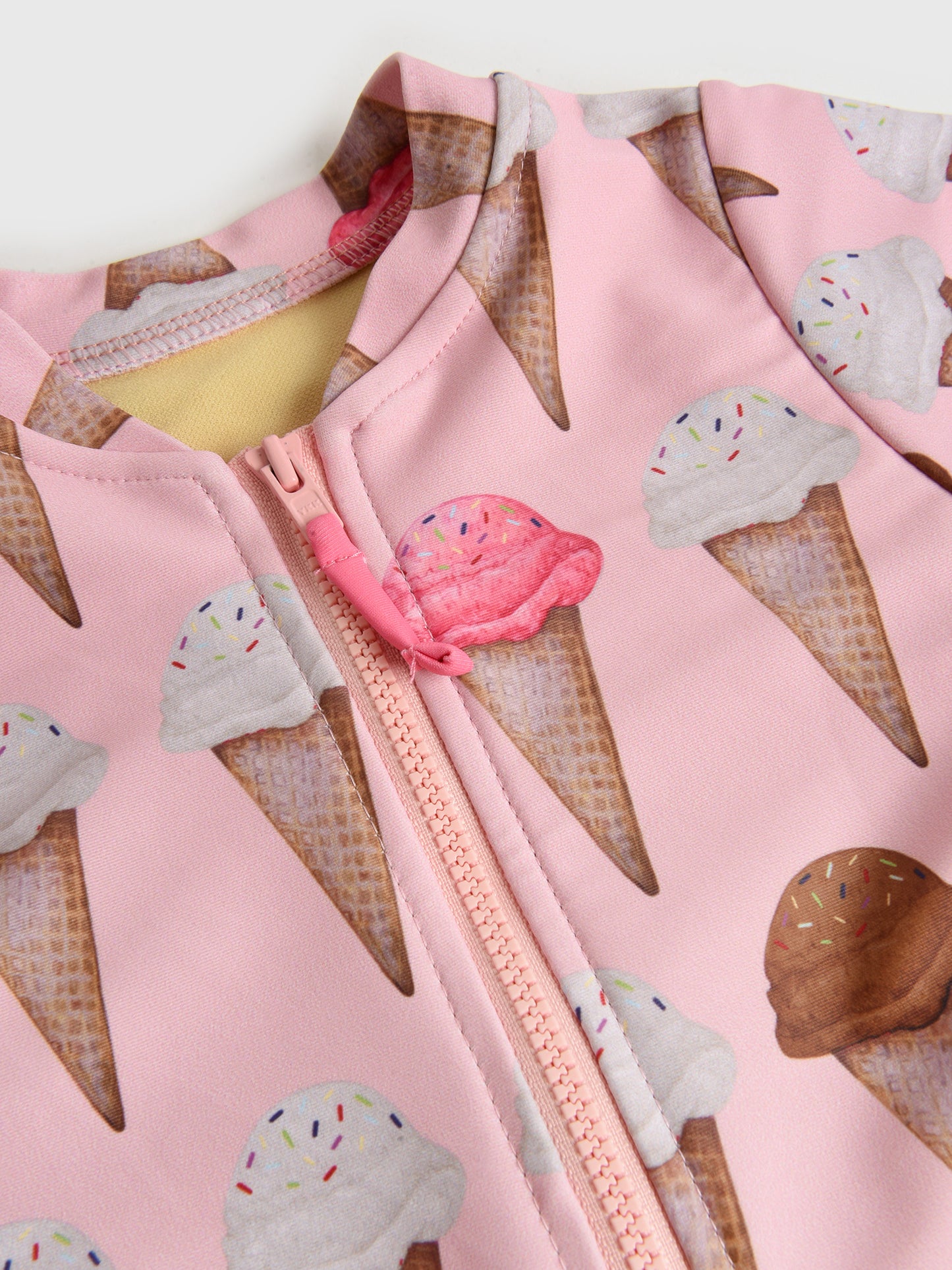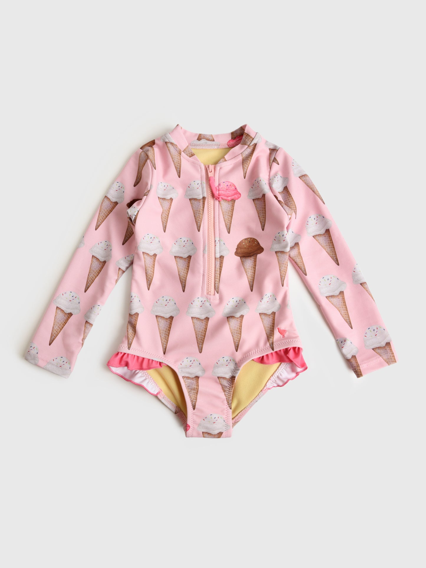 This long-sleeve swimsuit offers a full-coverage design and features a fun ice cream cone print.