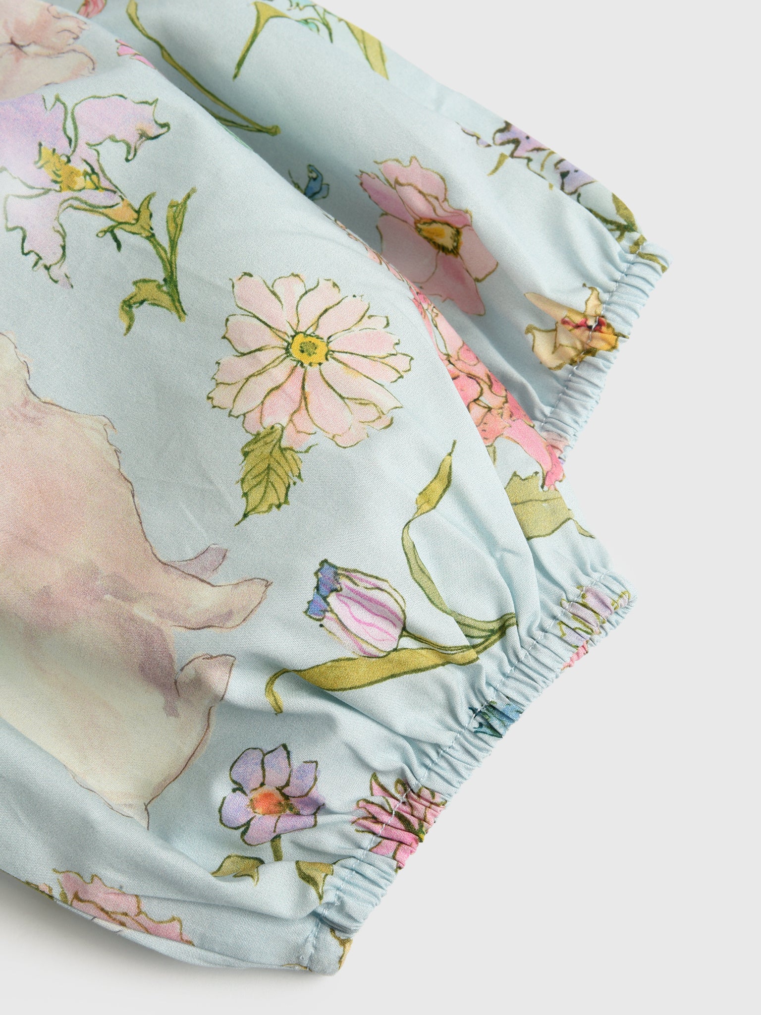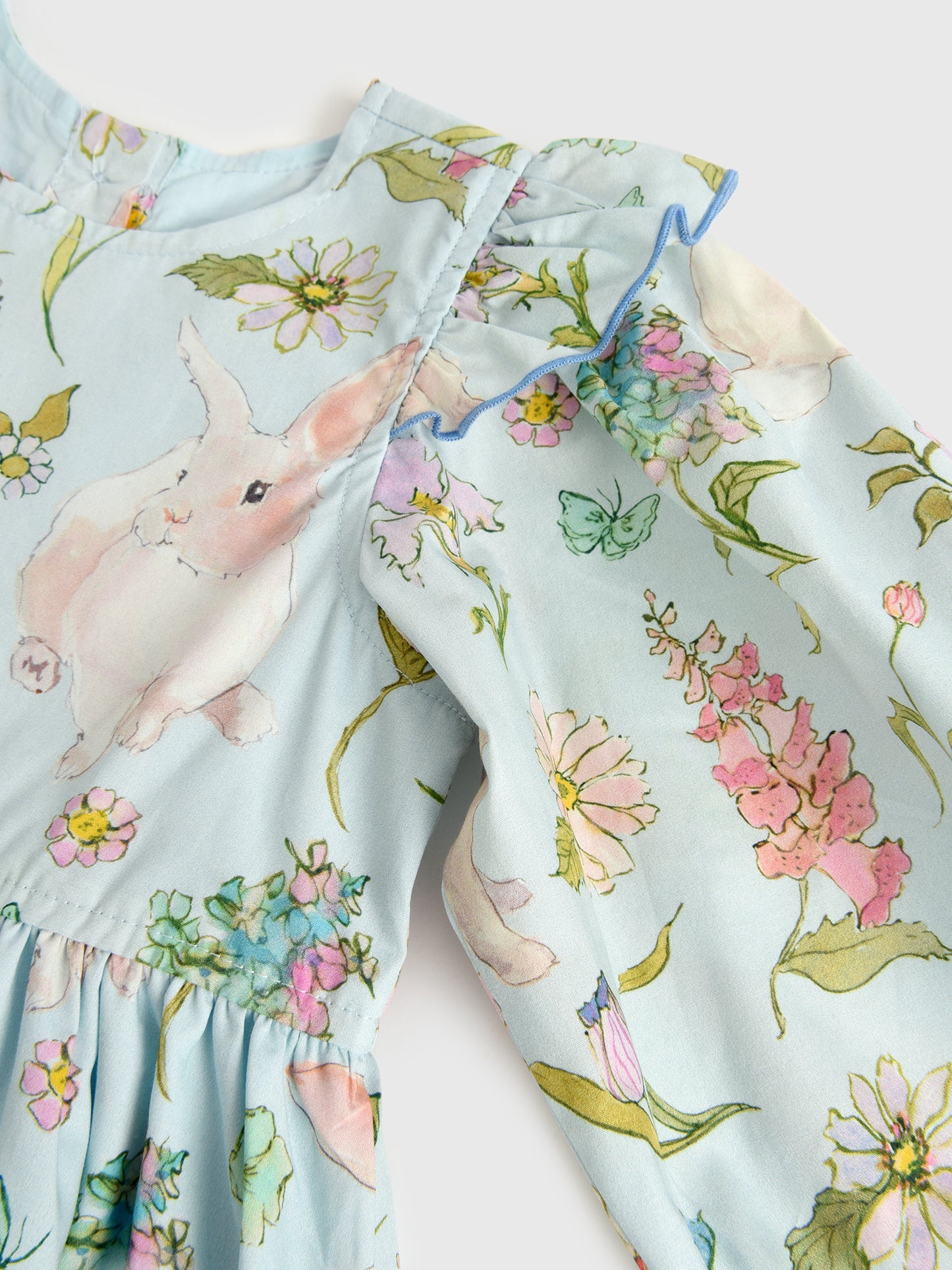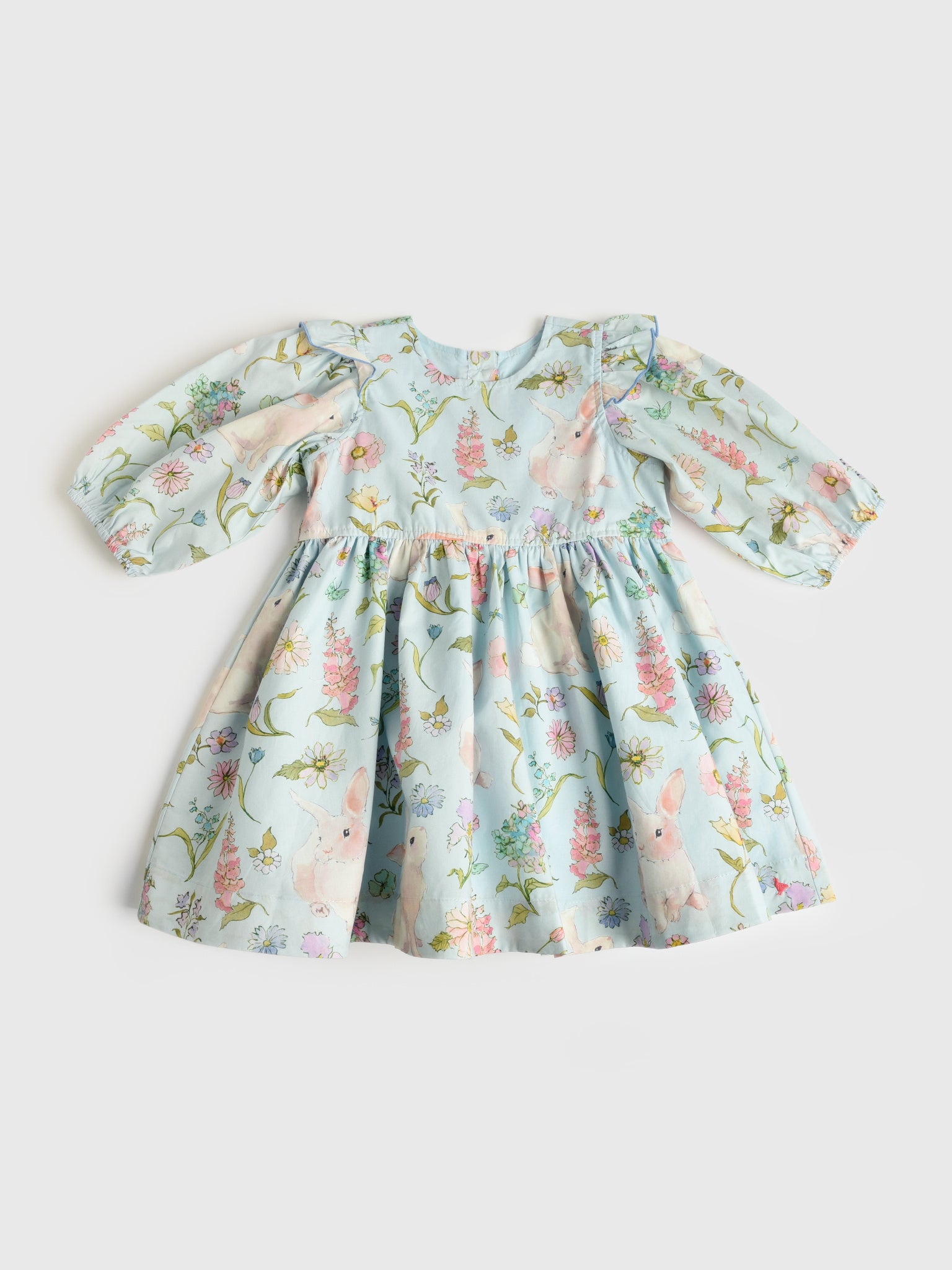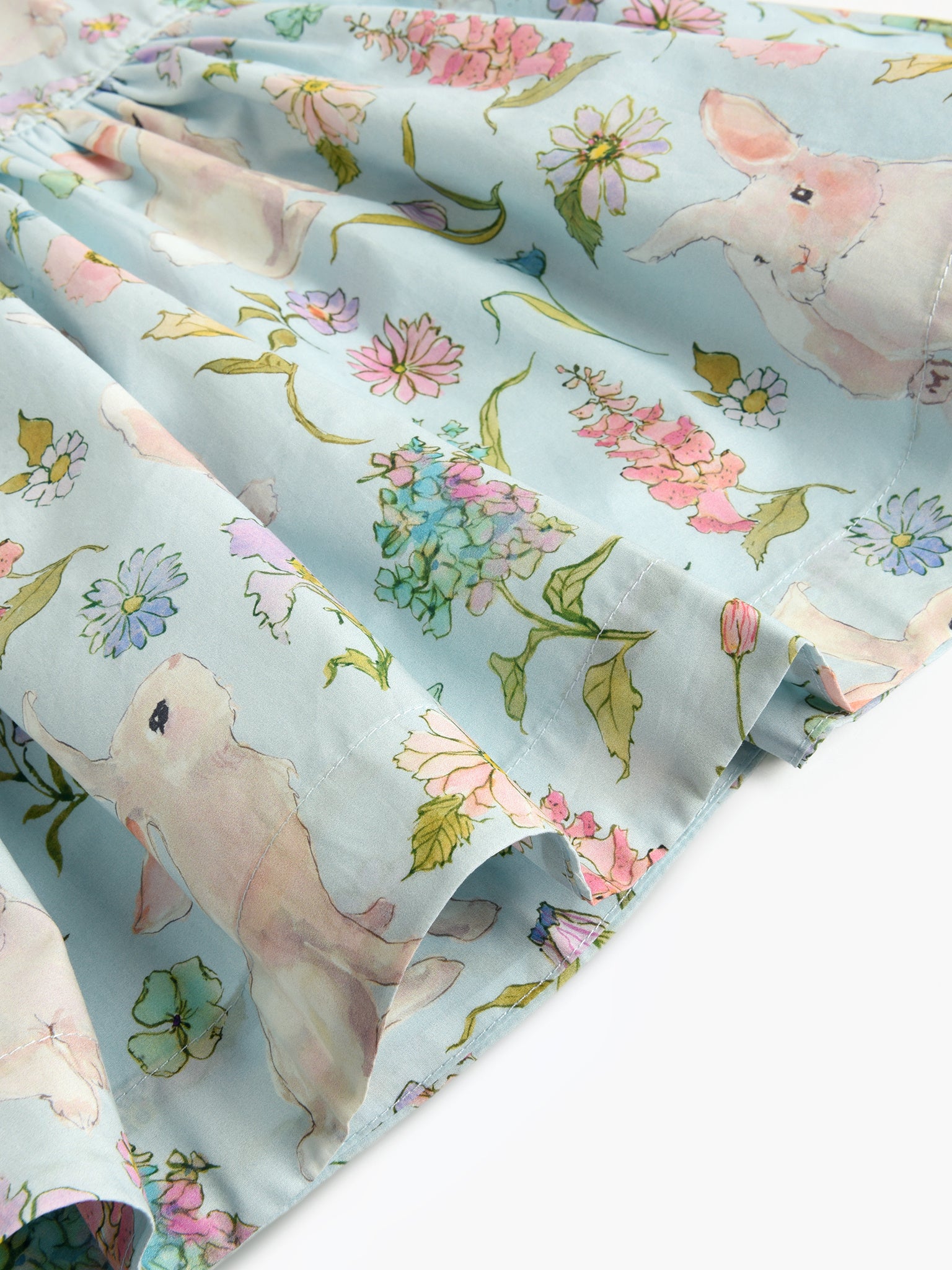 A lightweight dress made from crisp cotton poplin featuring a custom watercolor bunny print.