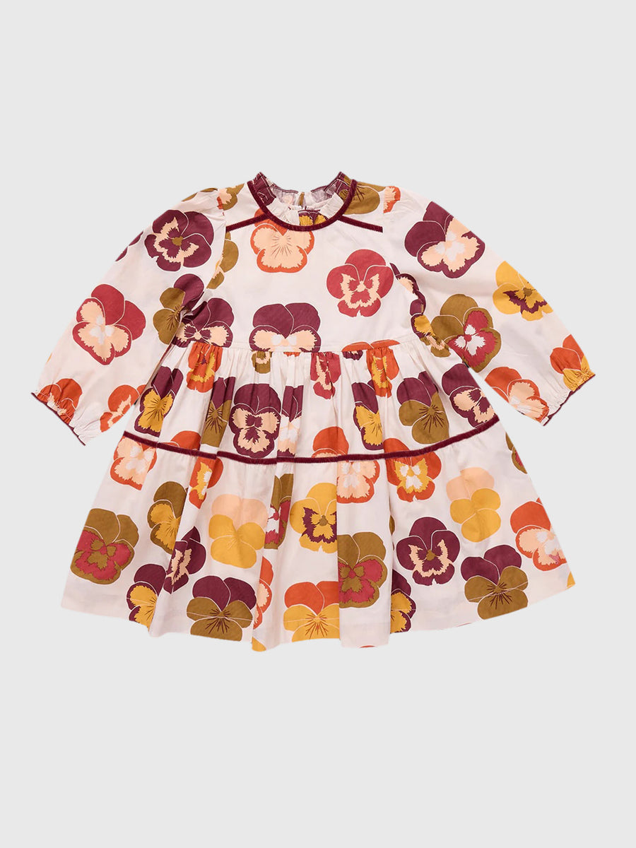 The Charlie Dress glows with an eye-catching Autumn Pansies print, featuring oversized blooms in warm jewel tones on a cream background. This dress has long sleeves and a tiered silhouette, making it a perfect choice for fall.