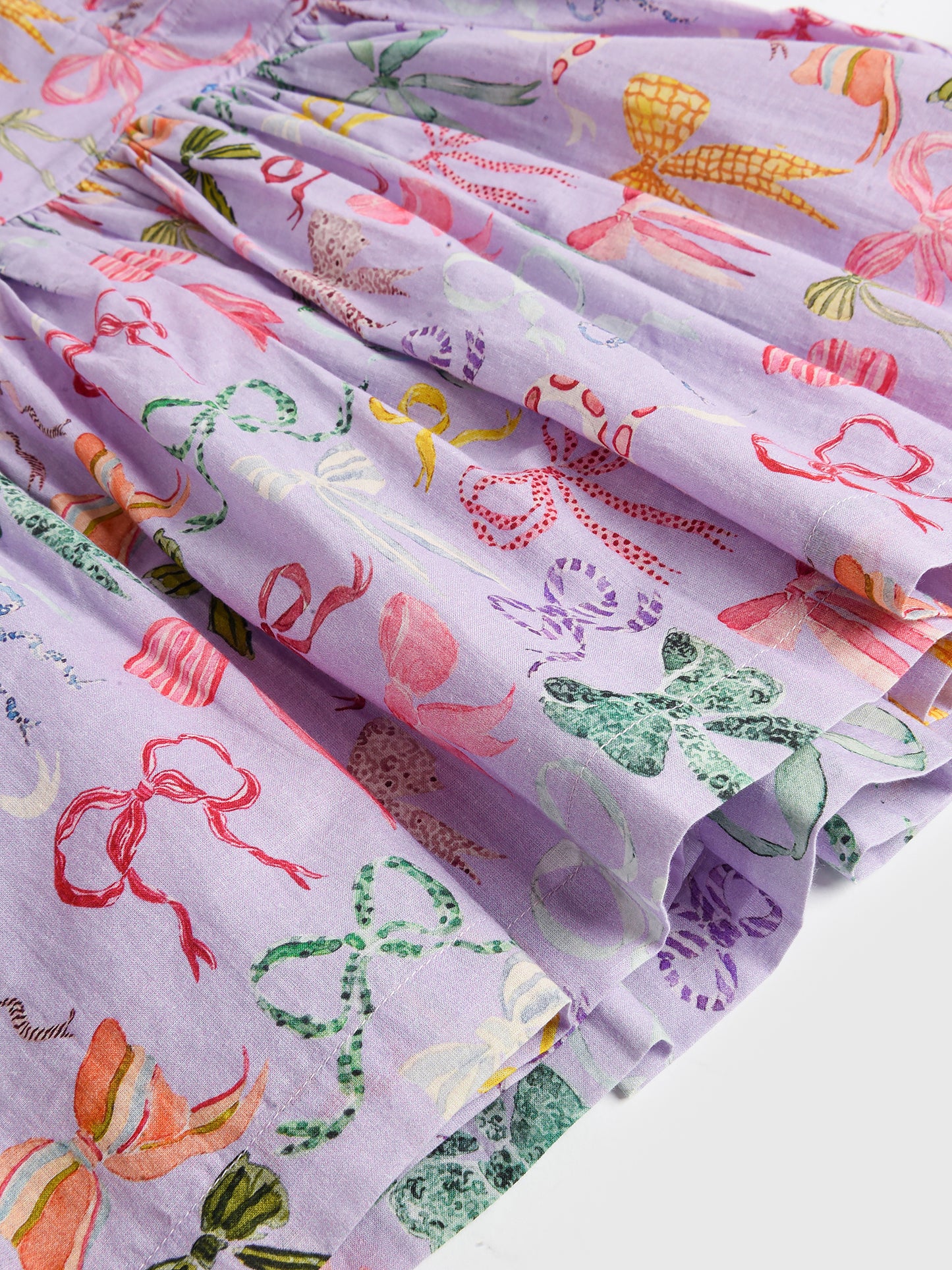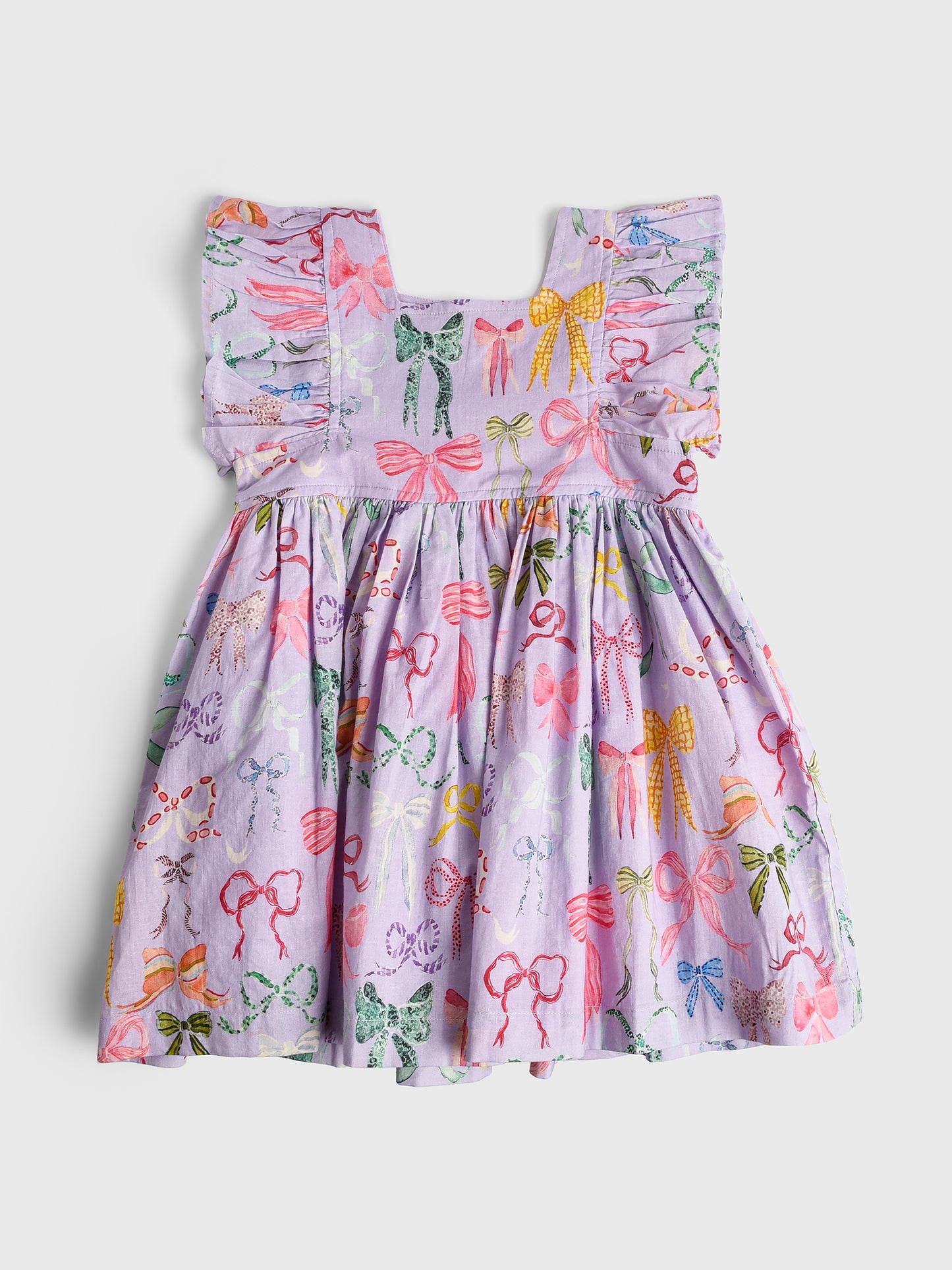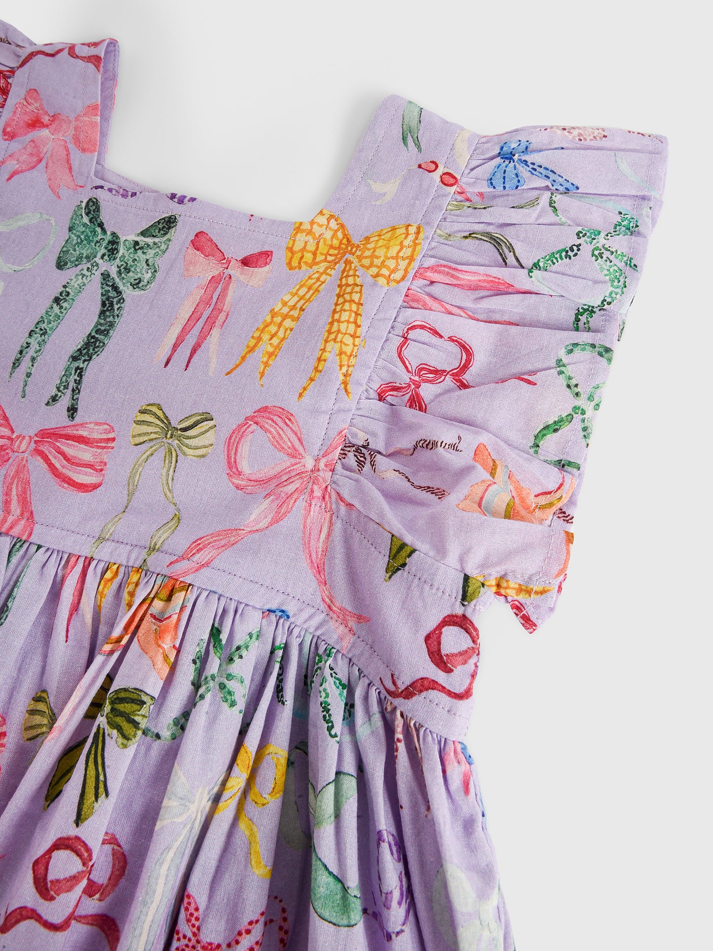 A pretty lavender dress made from lightweight cotton with a colorful bow print and frilly ruffle sleeves.