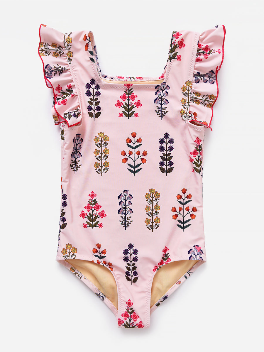 A one-piece swimsuit with colorful floral-themed block prints and a comfortable stretch.