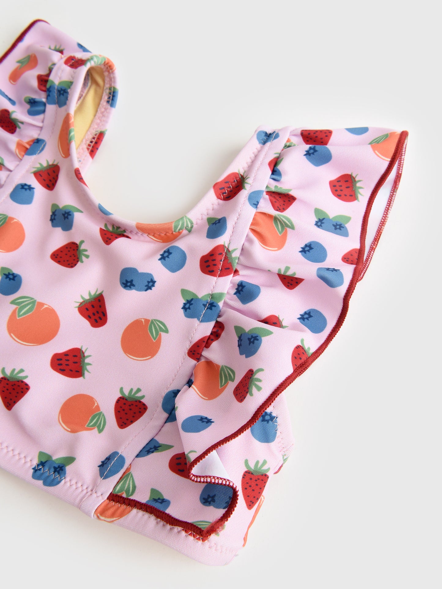 This bikini set features a colorful fruit print and dainty ruffle trim details.