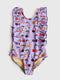 A full-coverage one-piece swimsuit with ruffle trims and a custom cherry print.