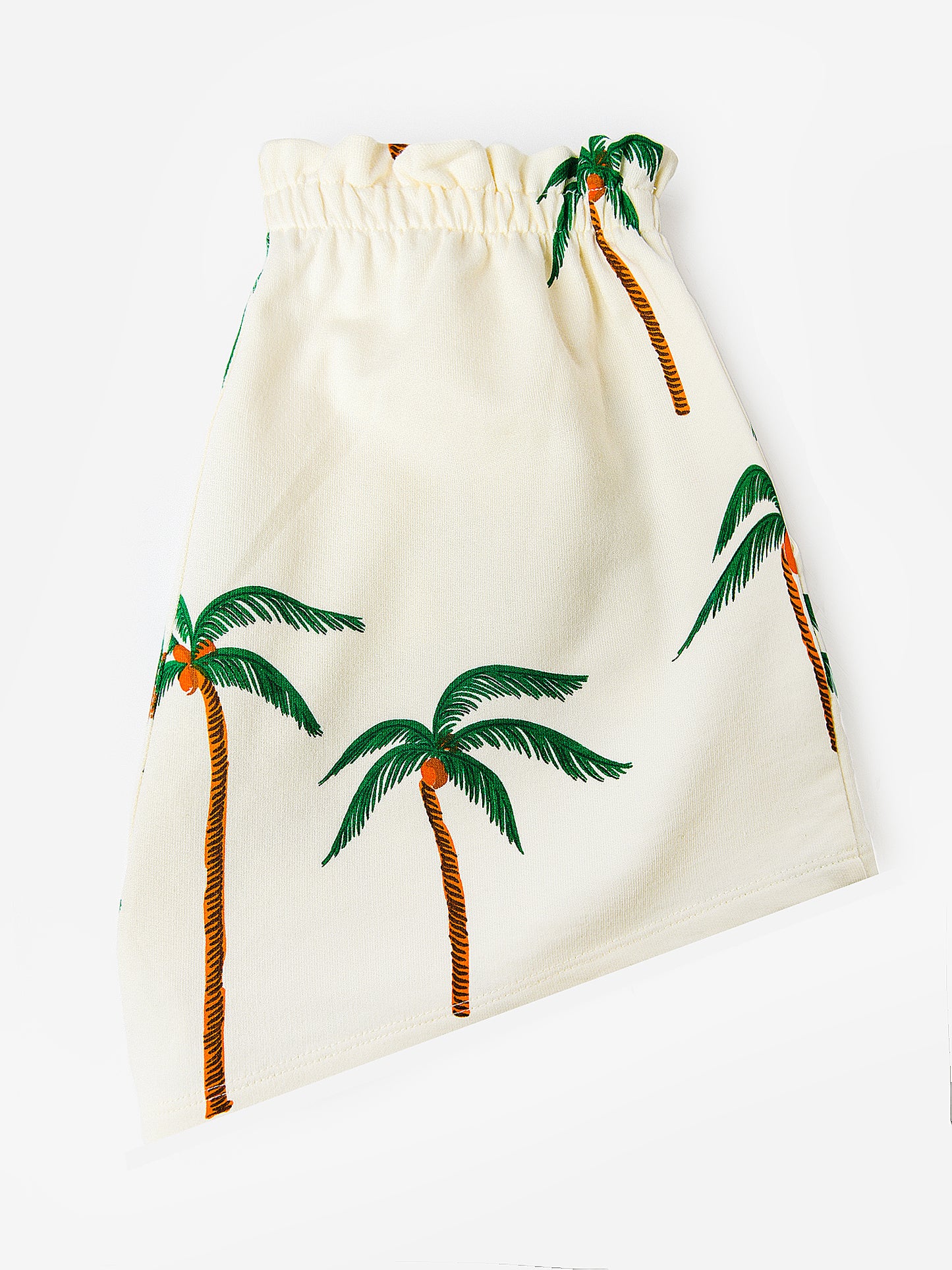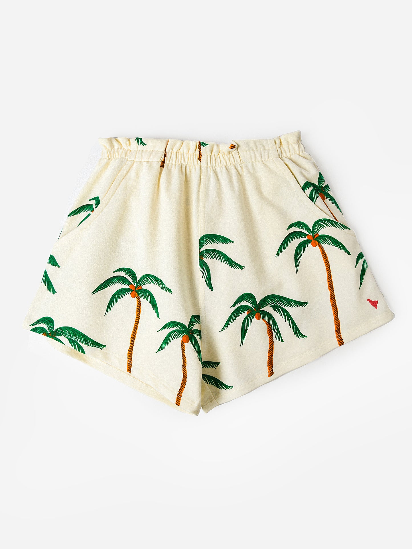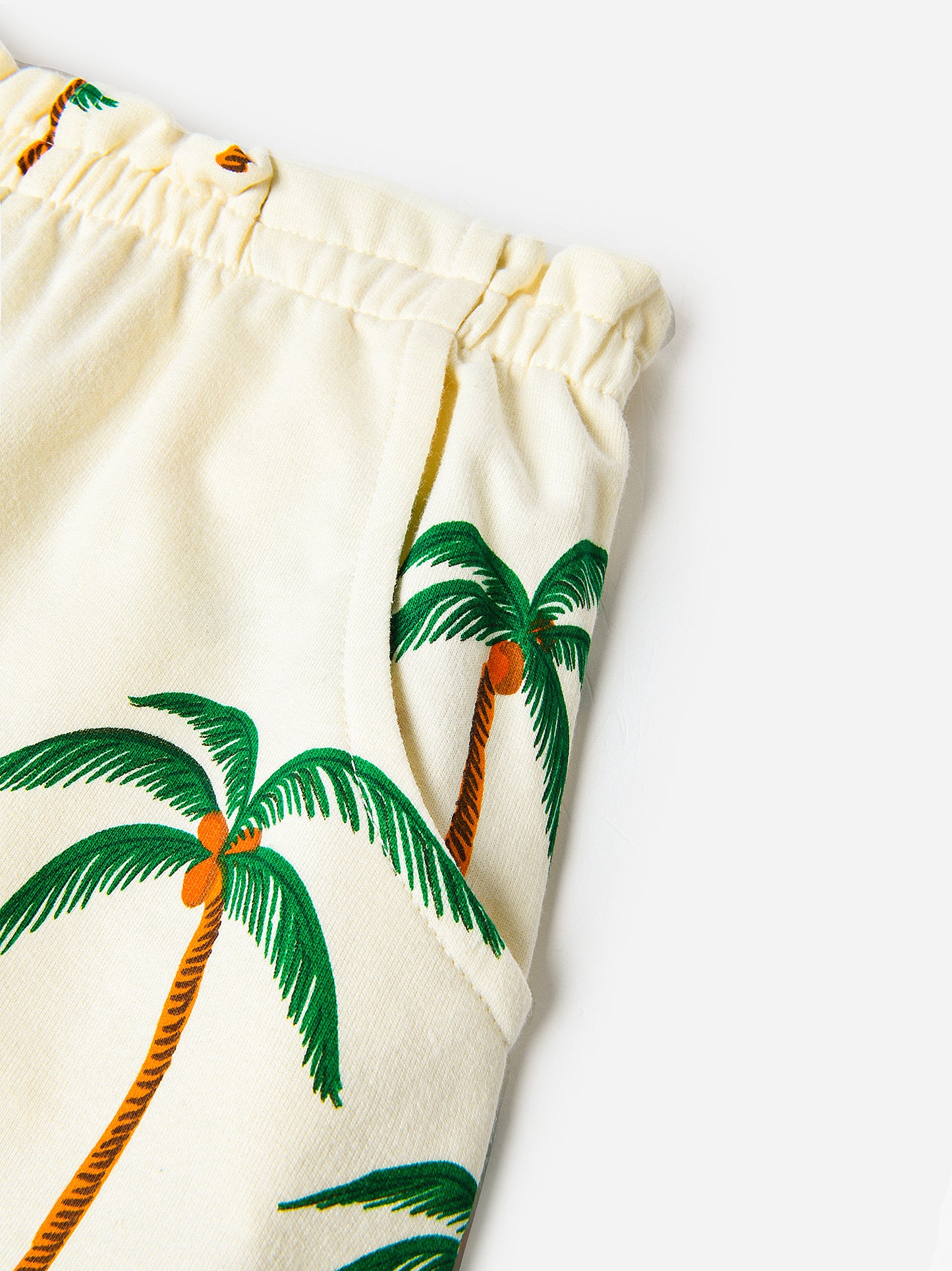 Soft organic french terry pull-on short with a novelty palm tree print.
