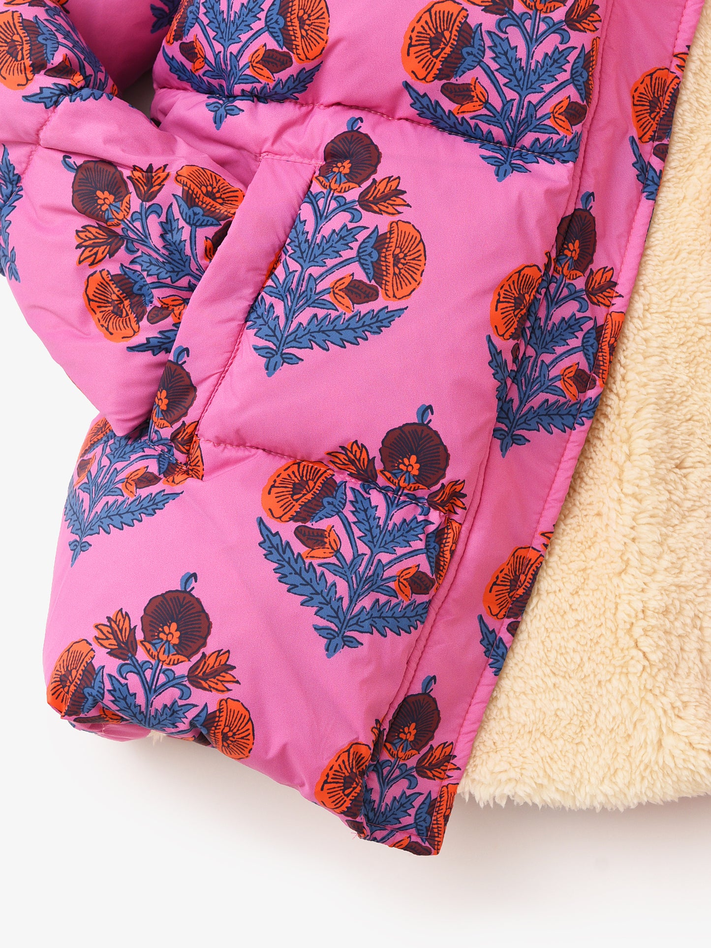 Insulated puffer jacket with a colorful print.