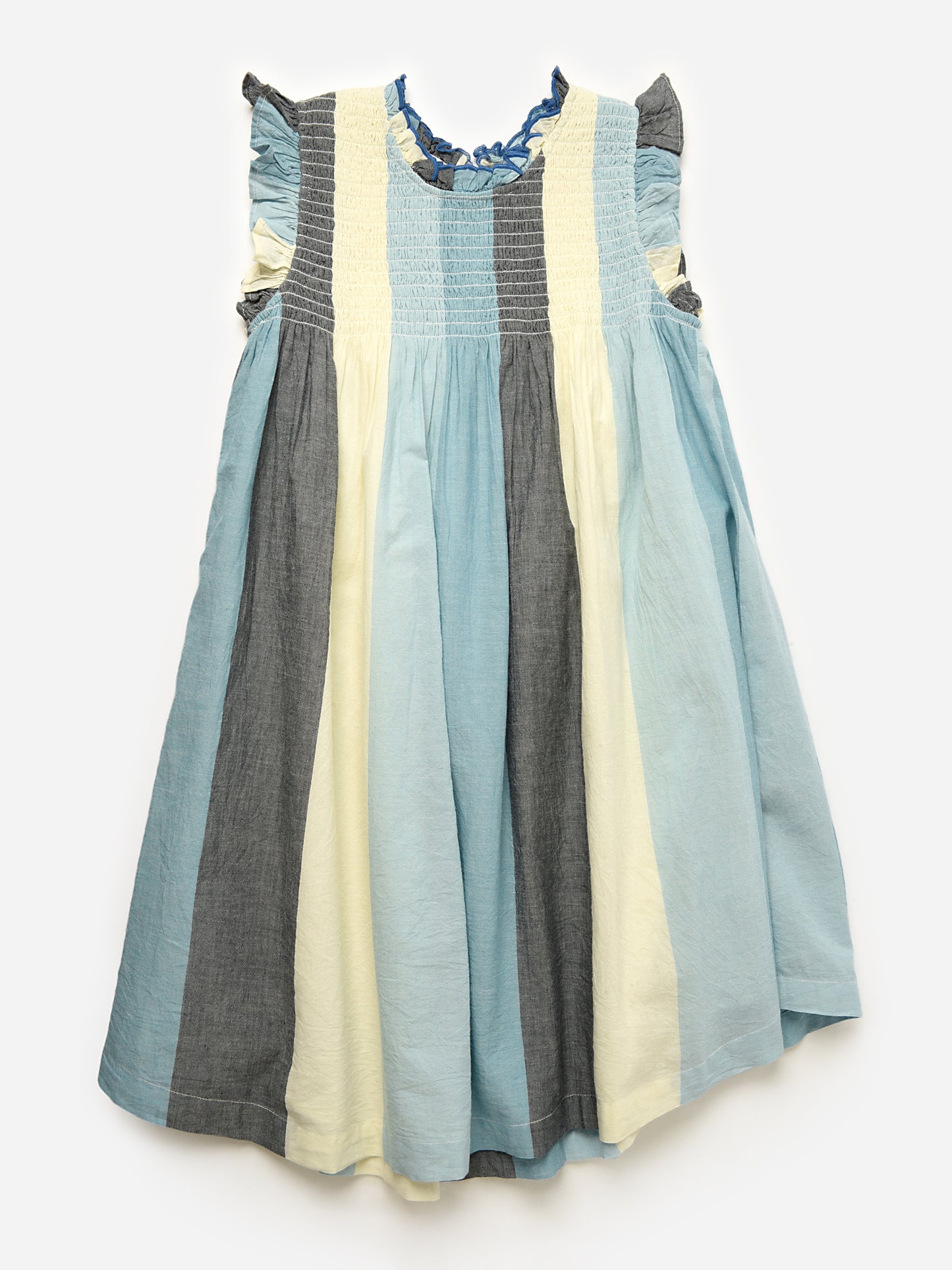 A ruffle-trimmed cotton dress with a smocked yoke and a multi-colored stripe print.