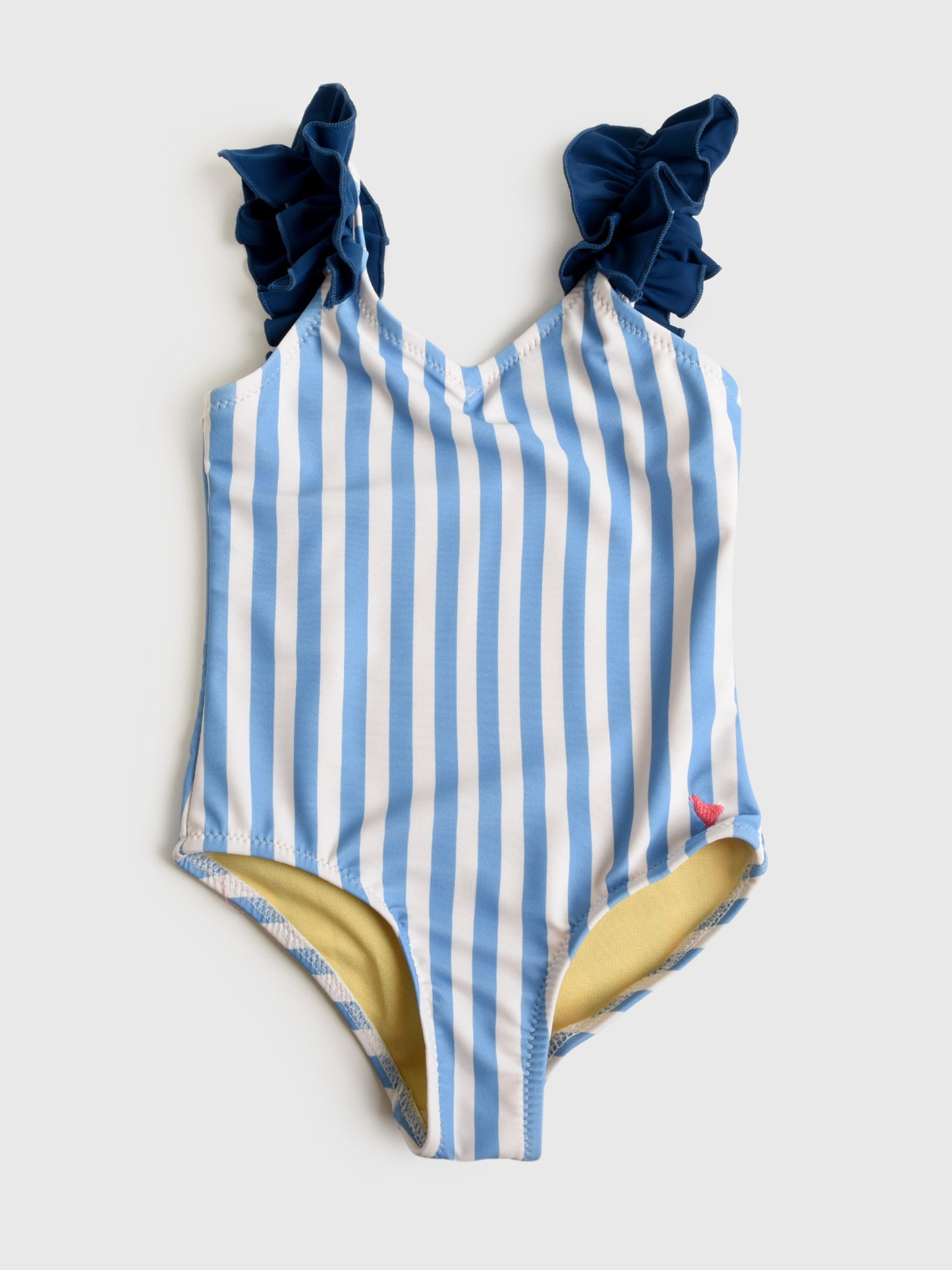 A blue and white striped one-piece swimsuit featuring large ruffle straps.