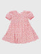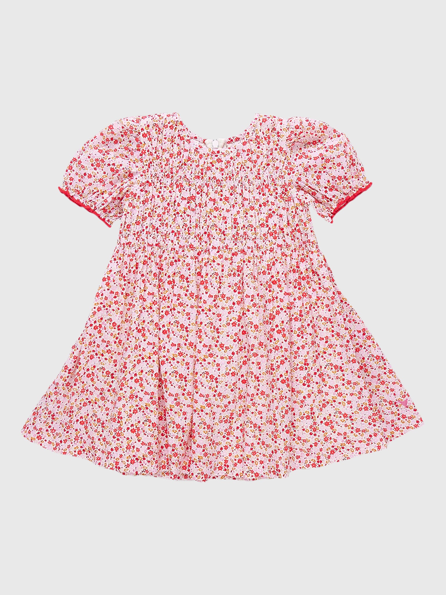 A lightweight cotton dress with a ditsy floral print, puff sleeves, and ruched detailing.
