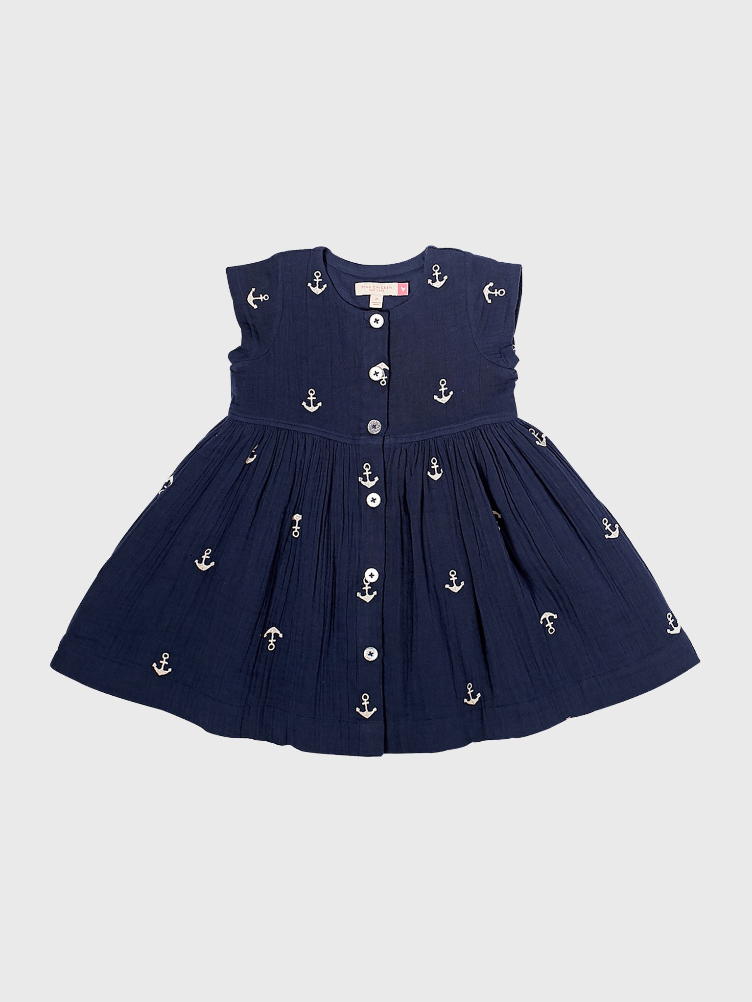 A nautical take on gathers and gauze, she'll be camera ready in the Pink Chicken Girls' Winnie Dress.