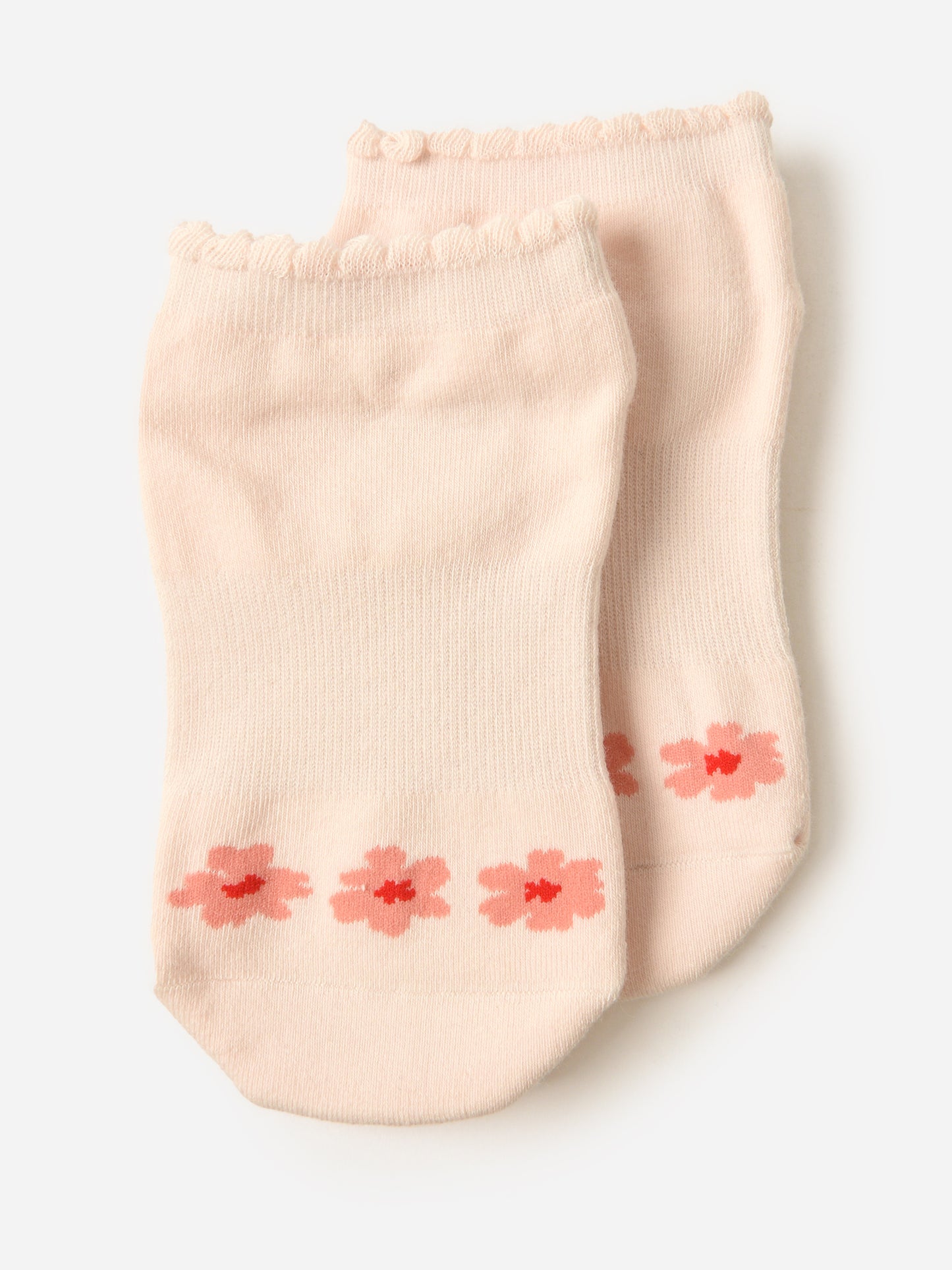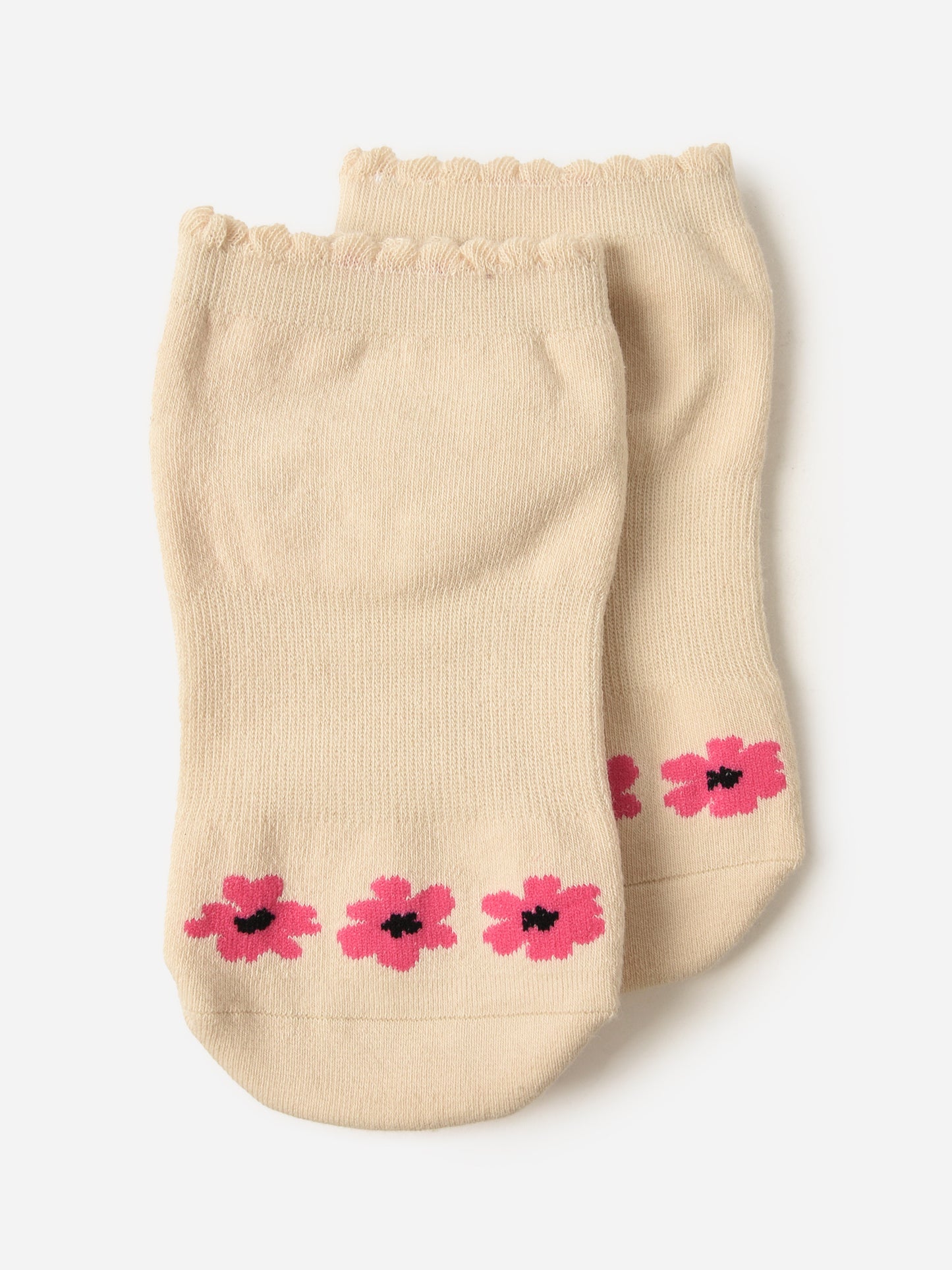 A pair of cushioned grip socks with a ruffle trim and floral design.