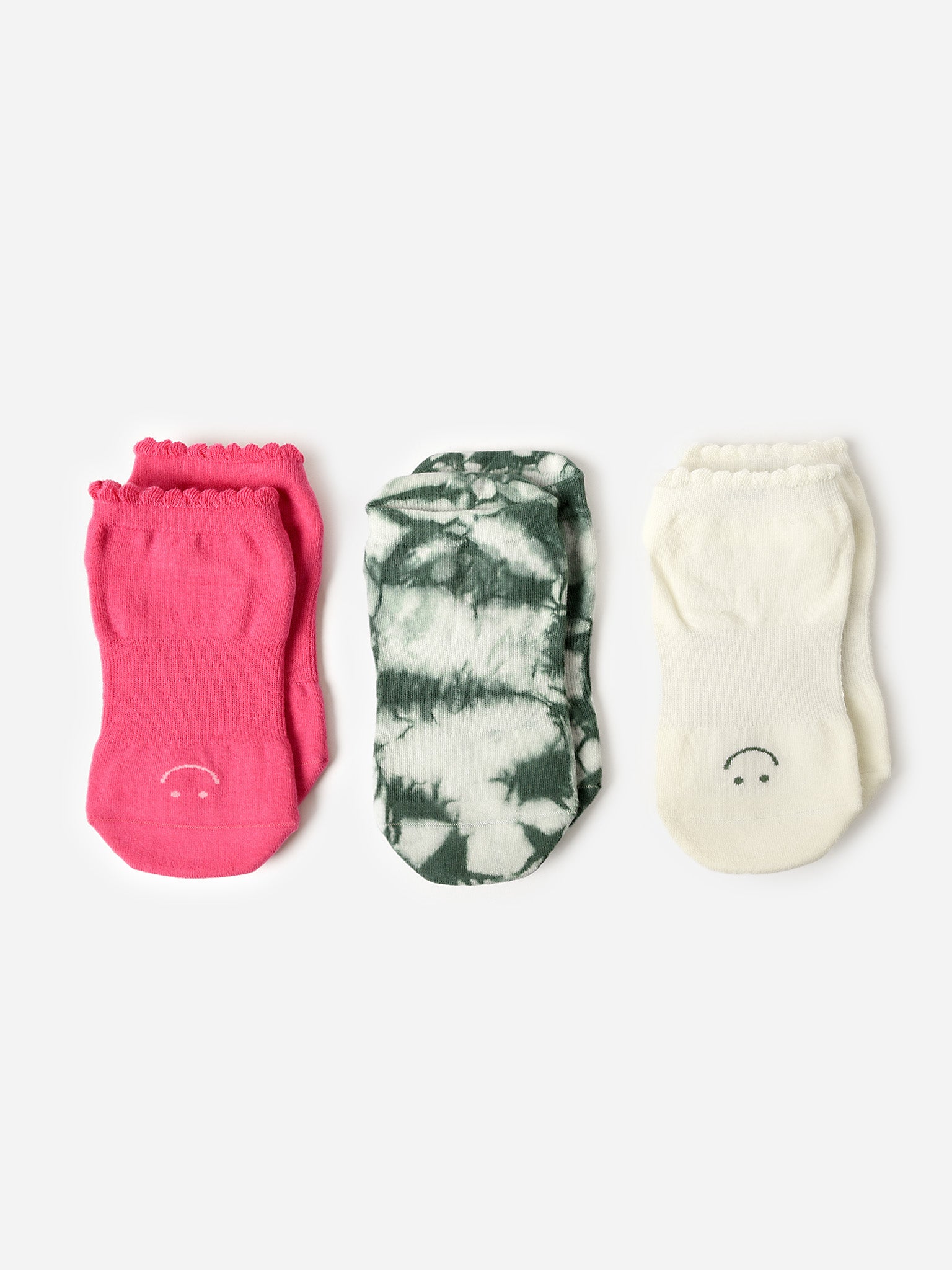 A pack of three ankle-length grip socks with assorted colors and designs.