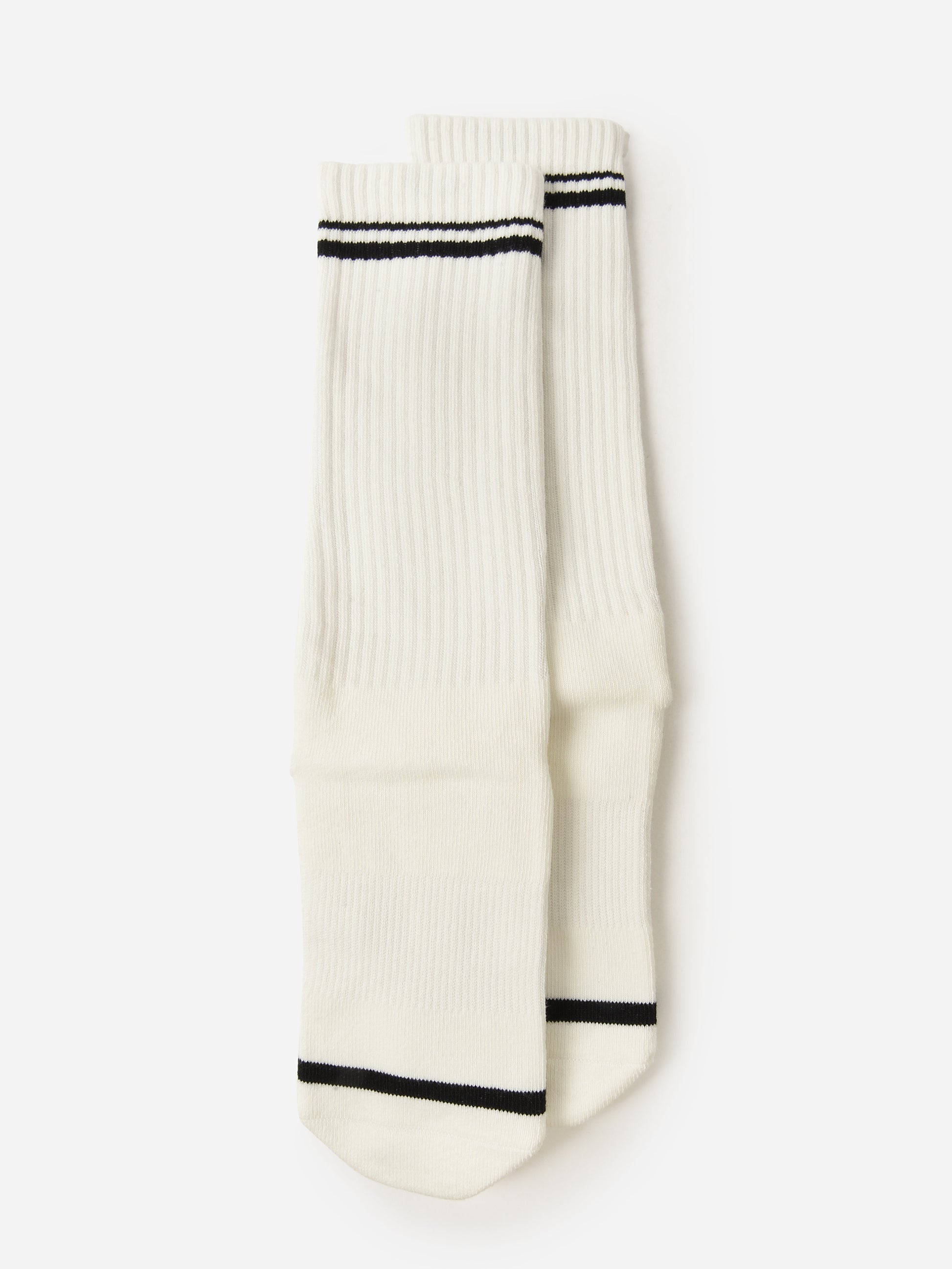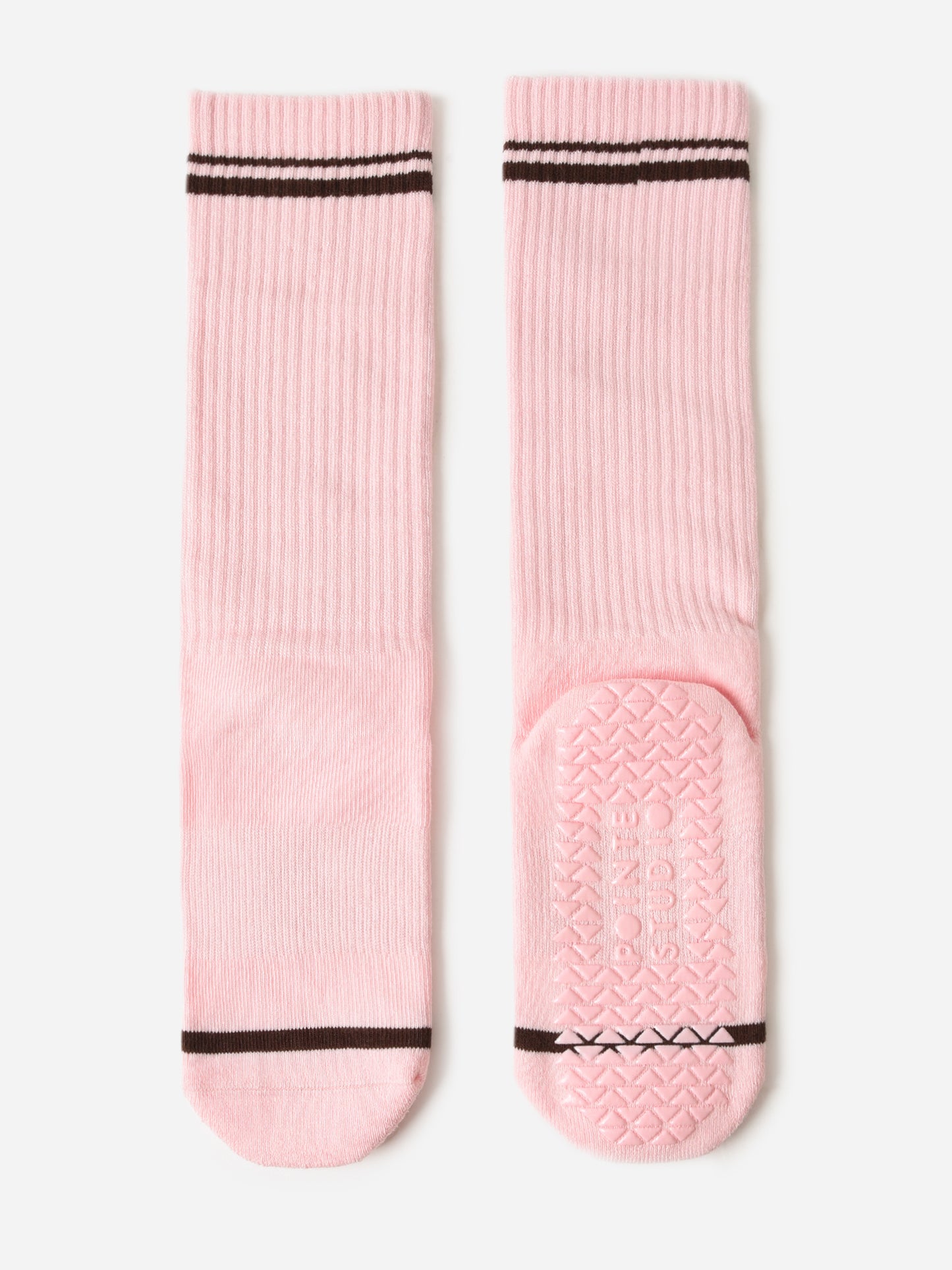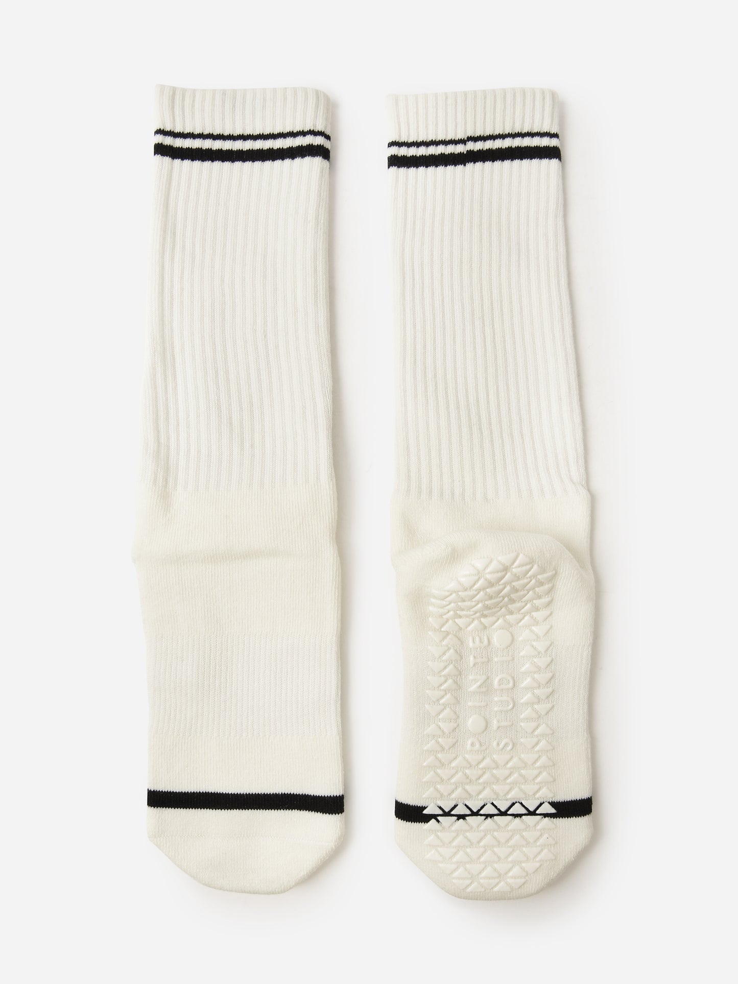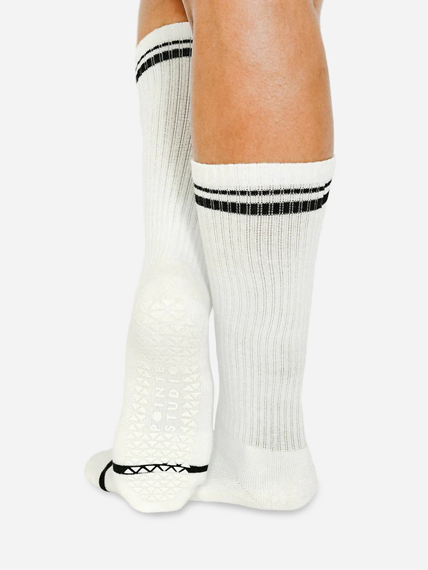 A pair of varsity-style crew socks with a non-slip sole and compression support.