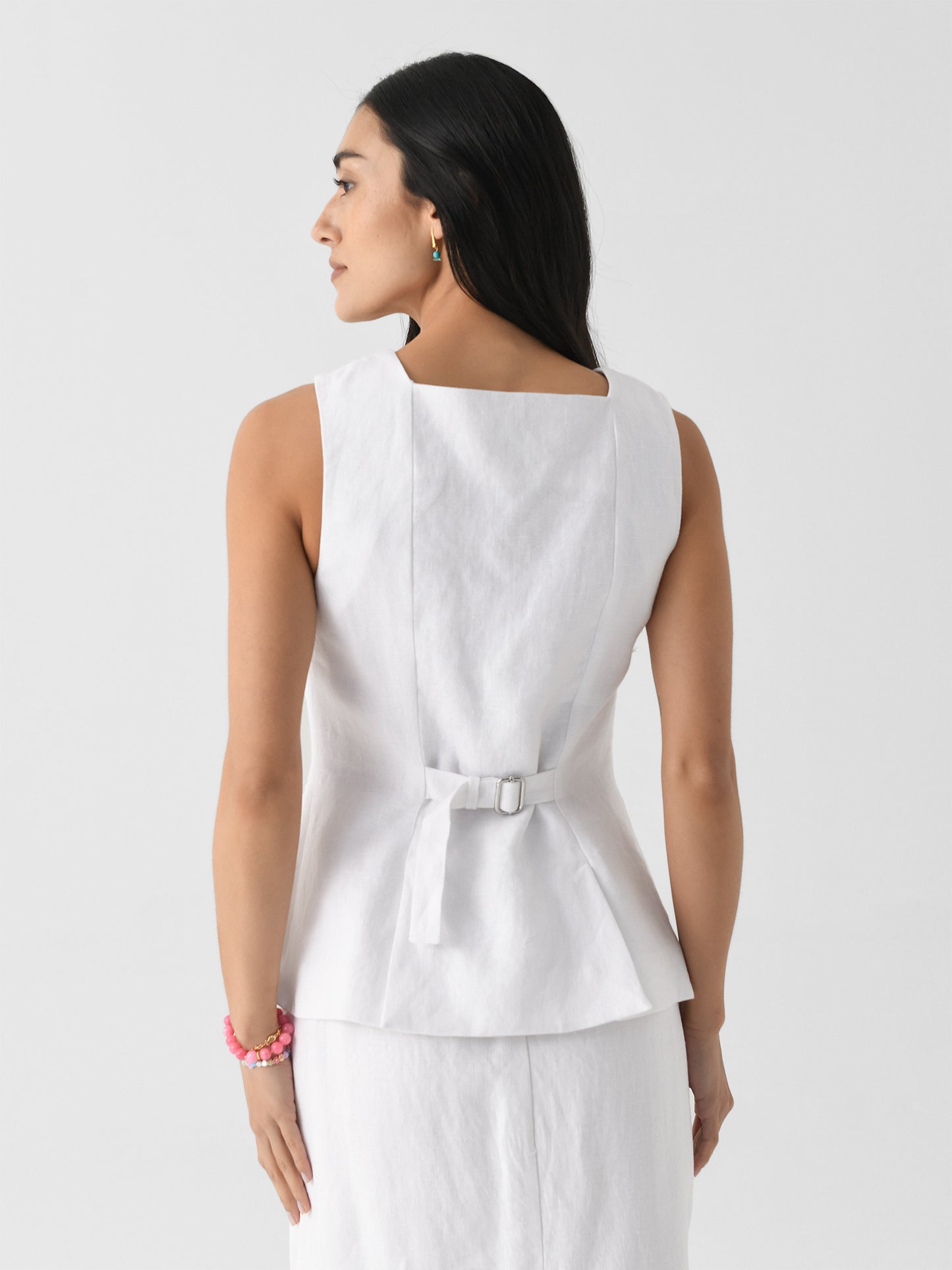 Sophisticated and chic, this piece is tailored from mid-weight linen and features a high square neckline, wide straps, and a flattering fitted silhouette.