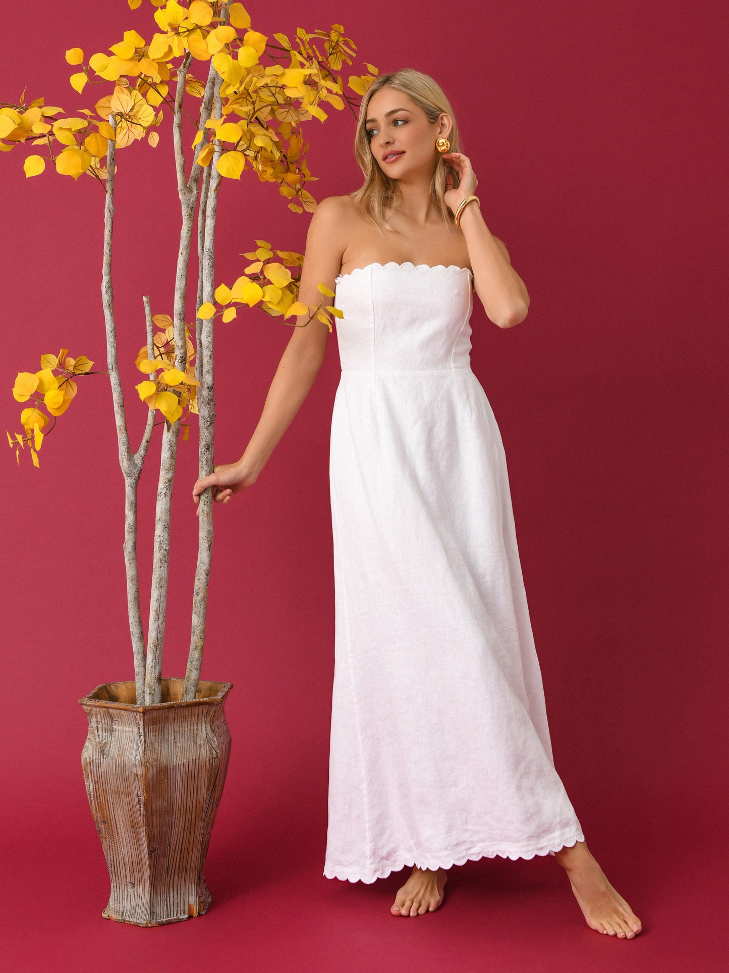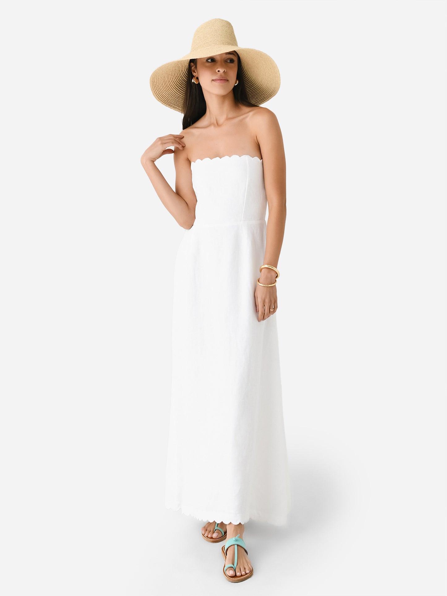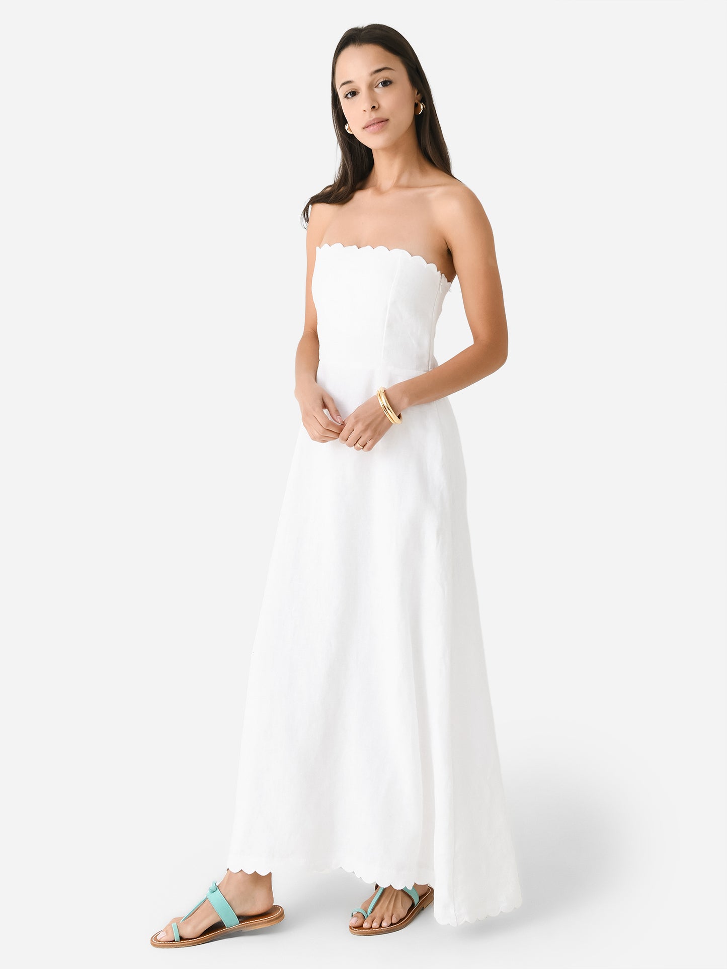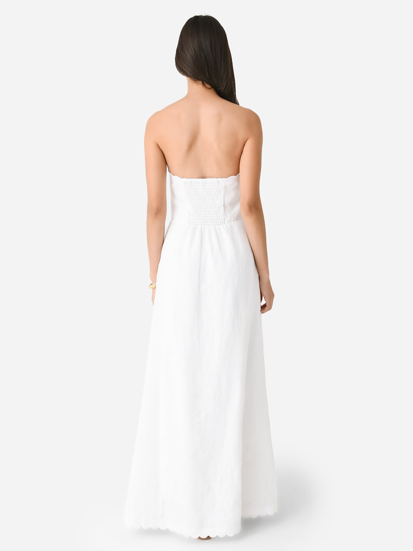 A maxi-length strapless dress made from lightweight linen with a strapless design and scallop trims.