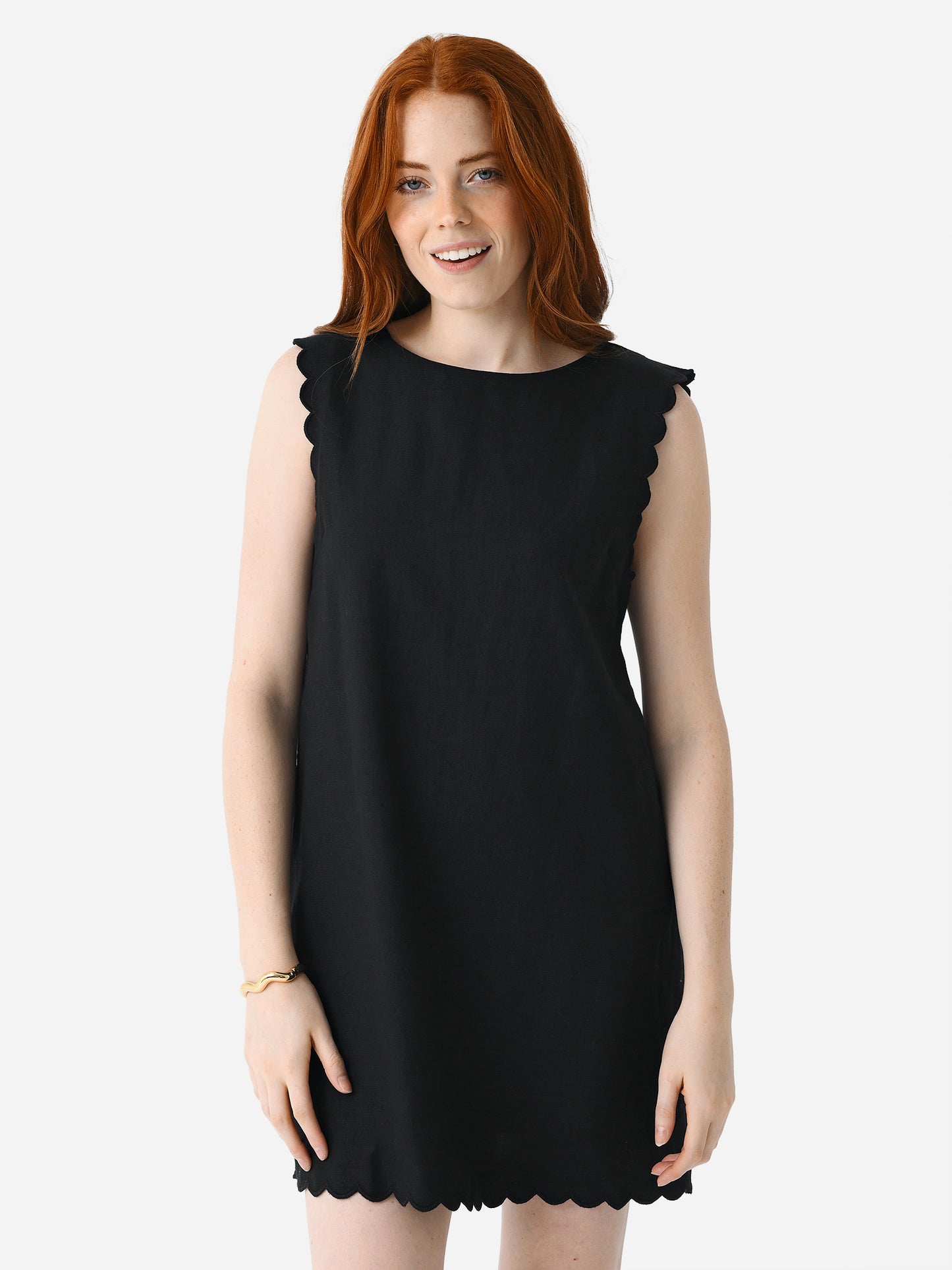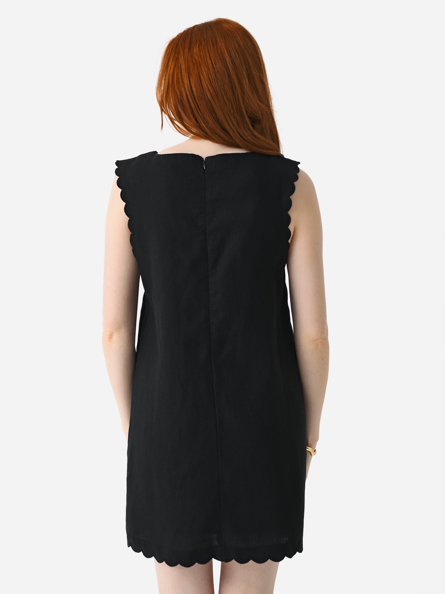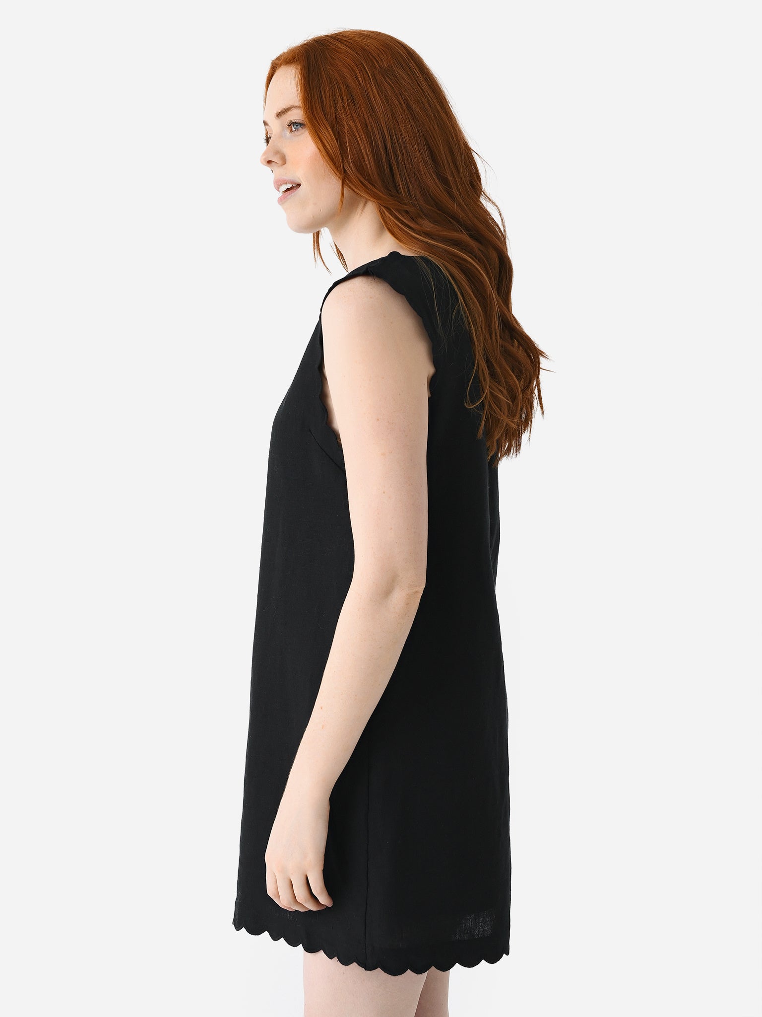 A shift-style dress made from lightweight linen with scallop trims.