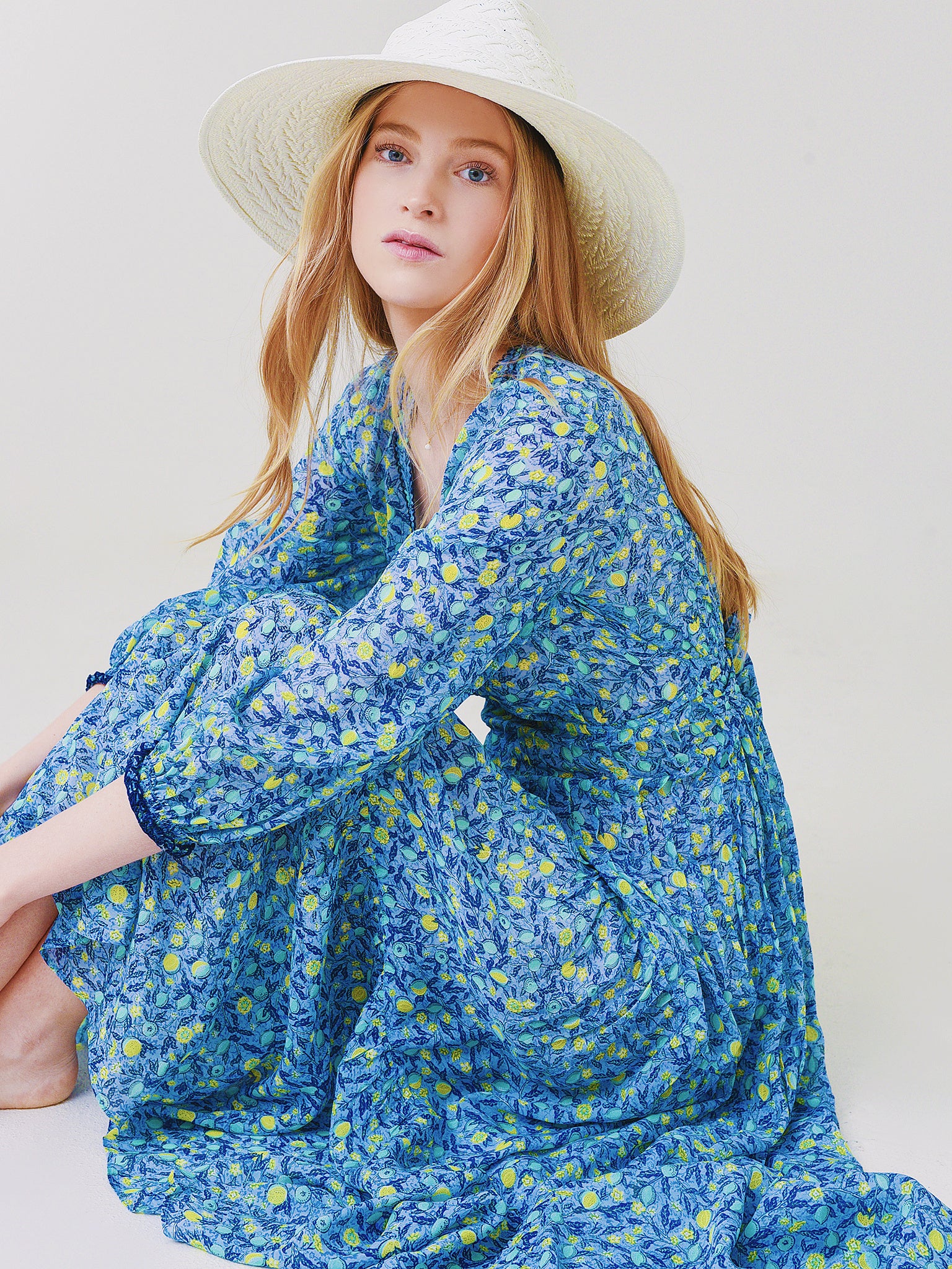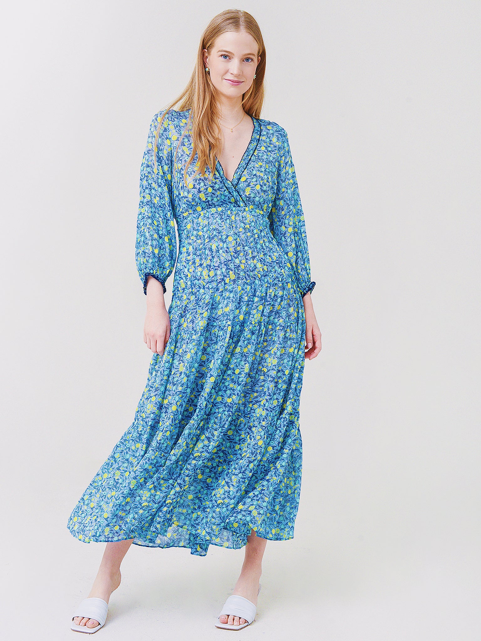 Maxi-length printed dress with long puff sleeves and contrast stitching.