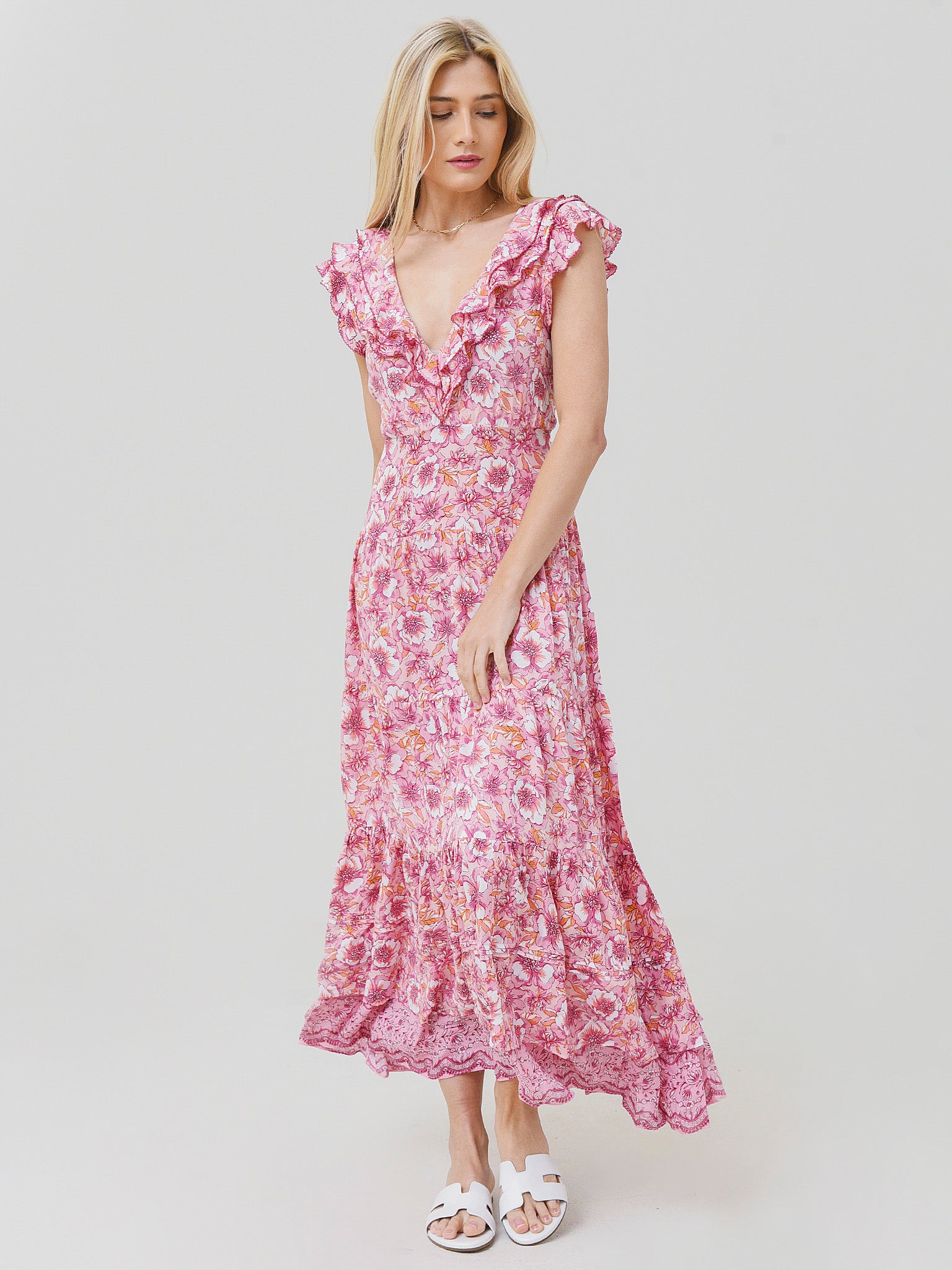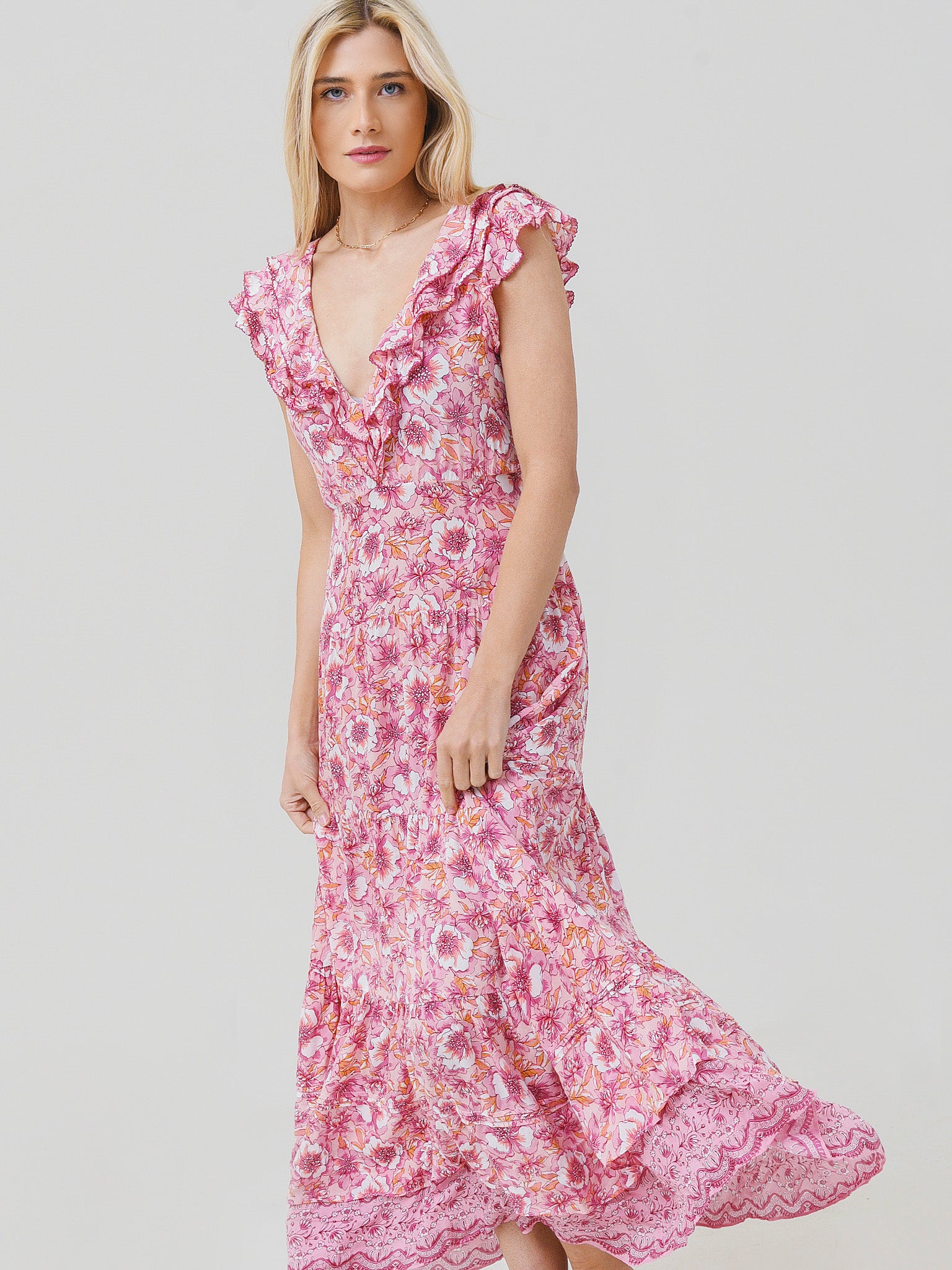 Floral maxi dress with ruffle details and a tiered skirt.