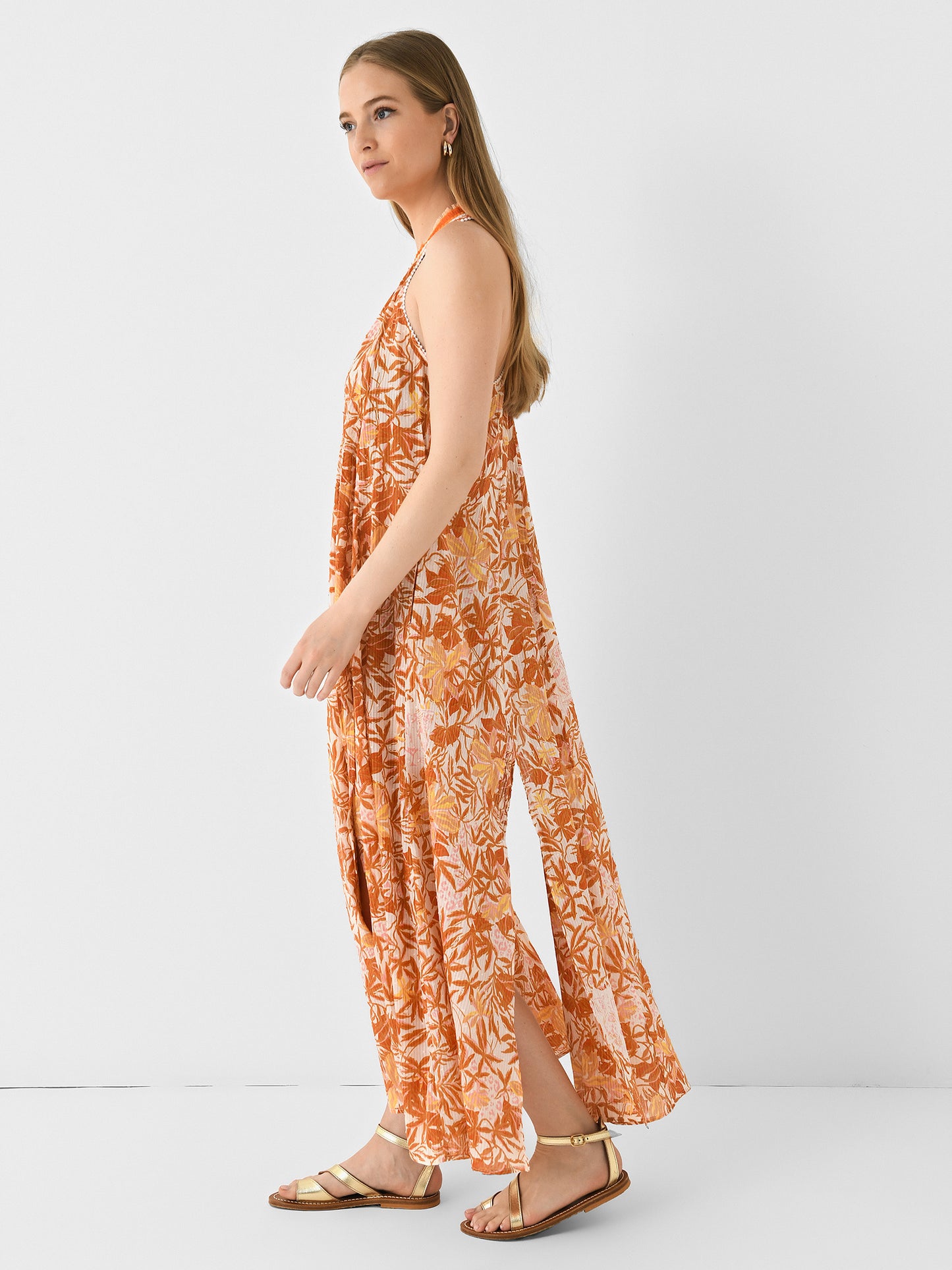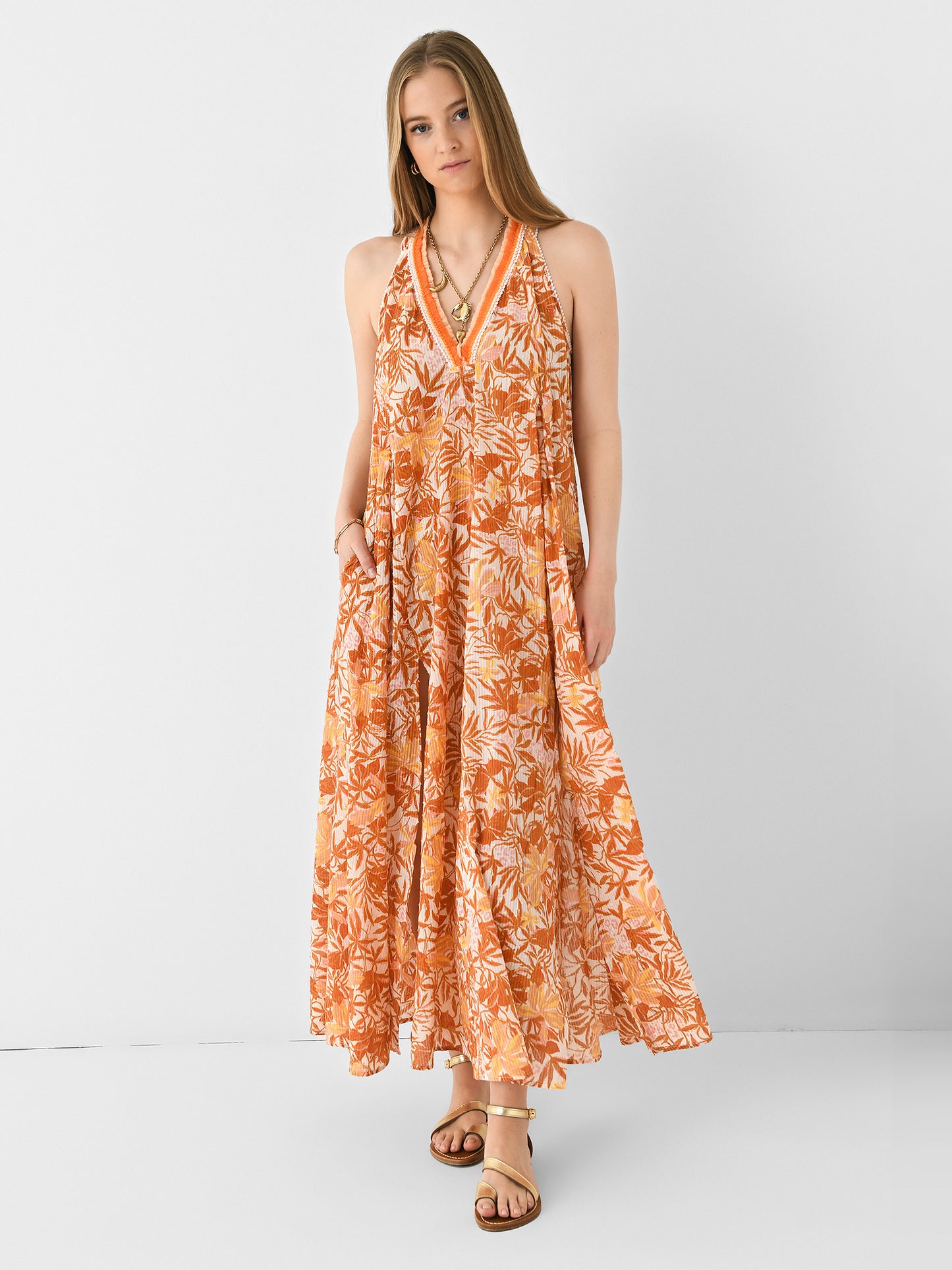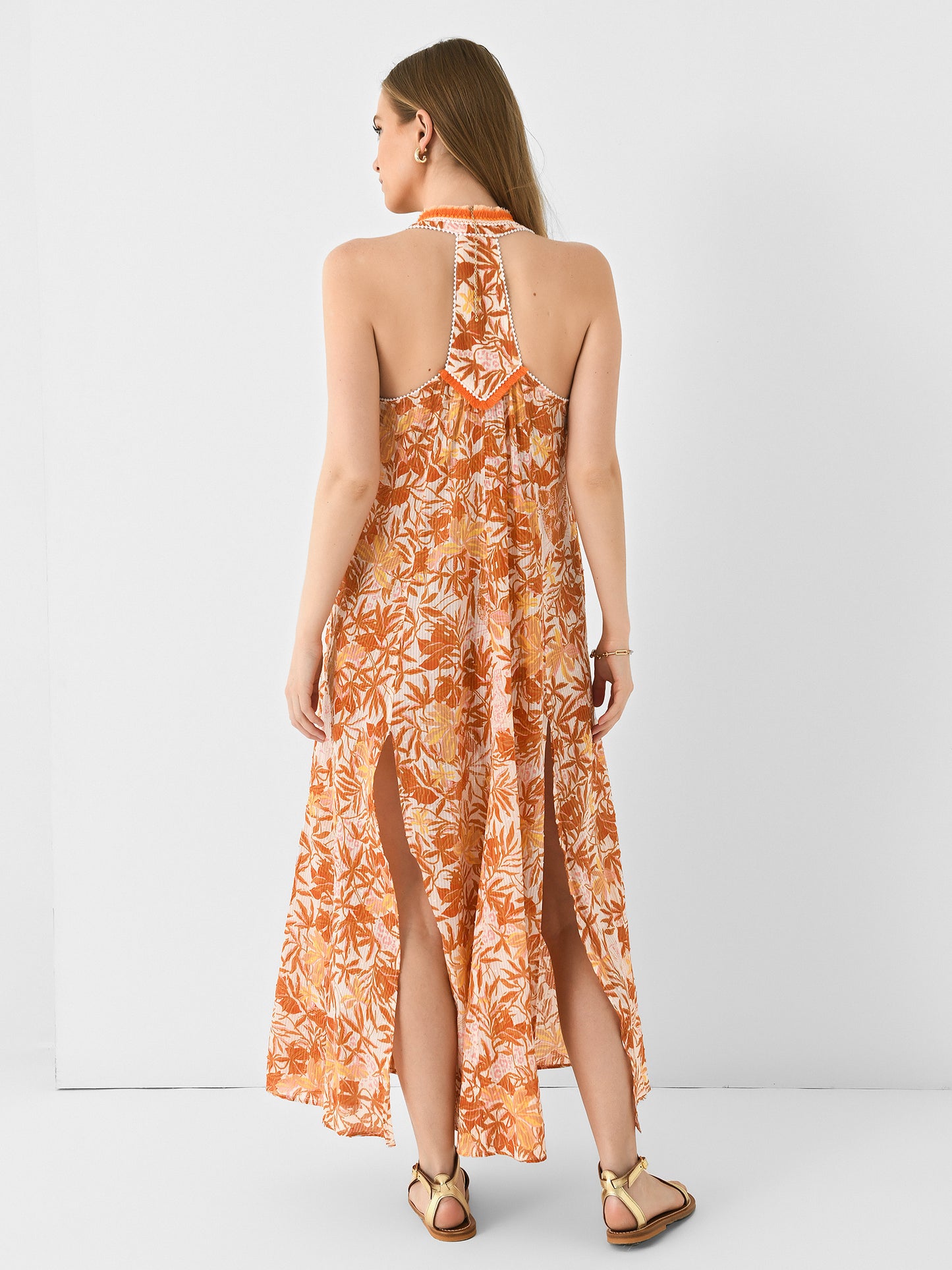 Sleeveless maxi dress featuring a fringe neckline and a flared empire shape with large side slits for an airy design.