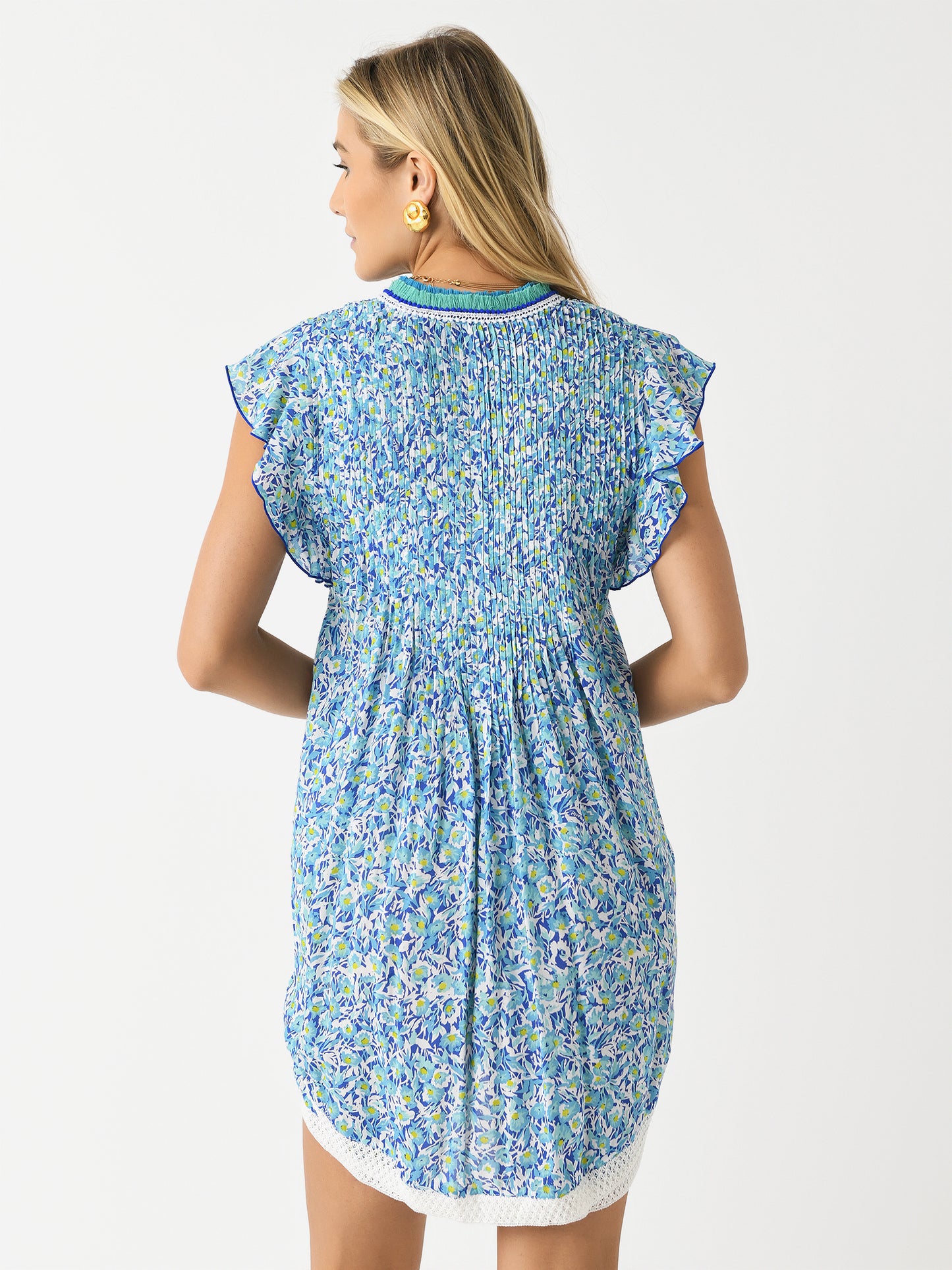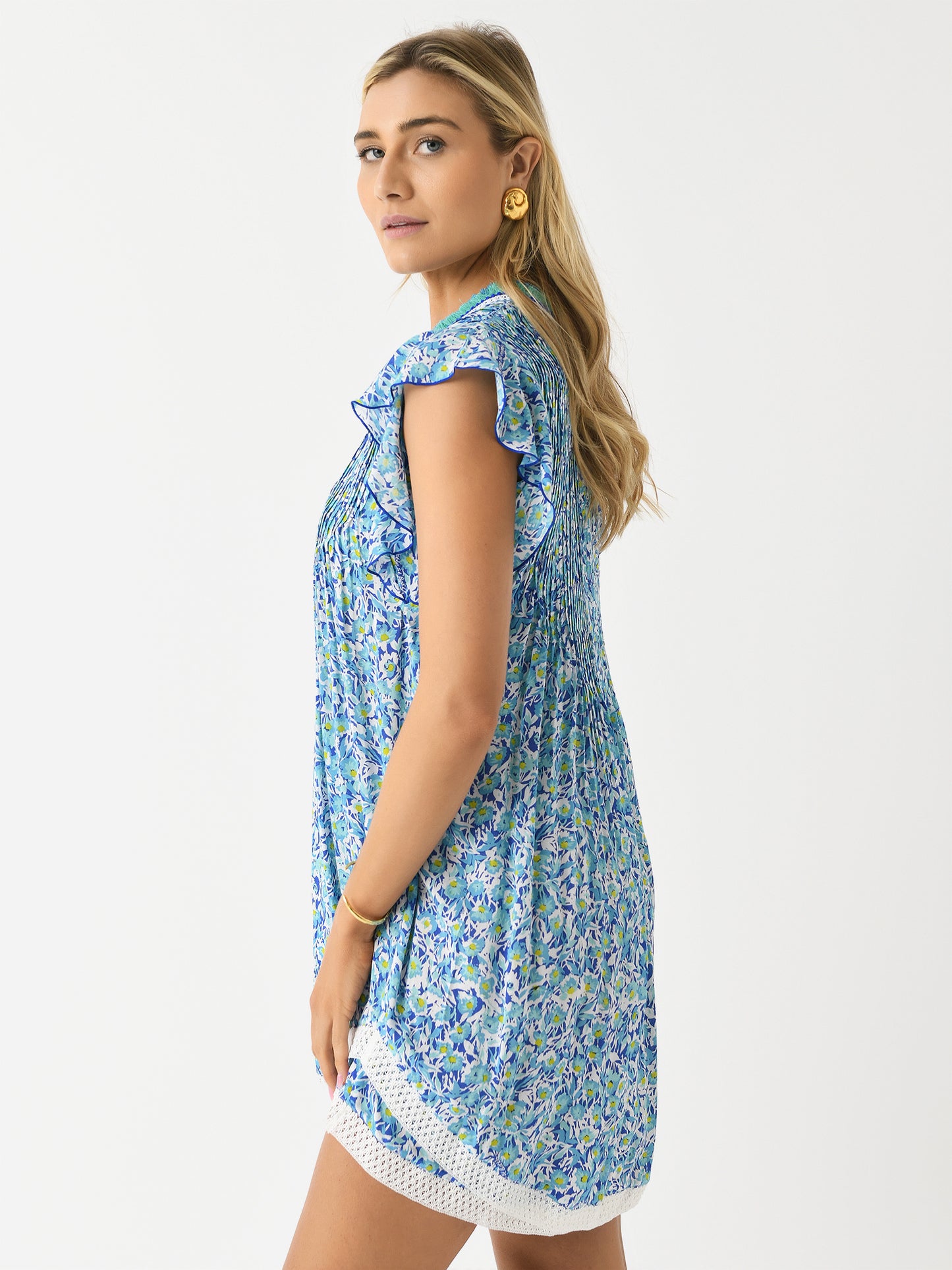 A trapeze-style dress with a fringe neckline, flutter sleeves, and a tonal floral print.