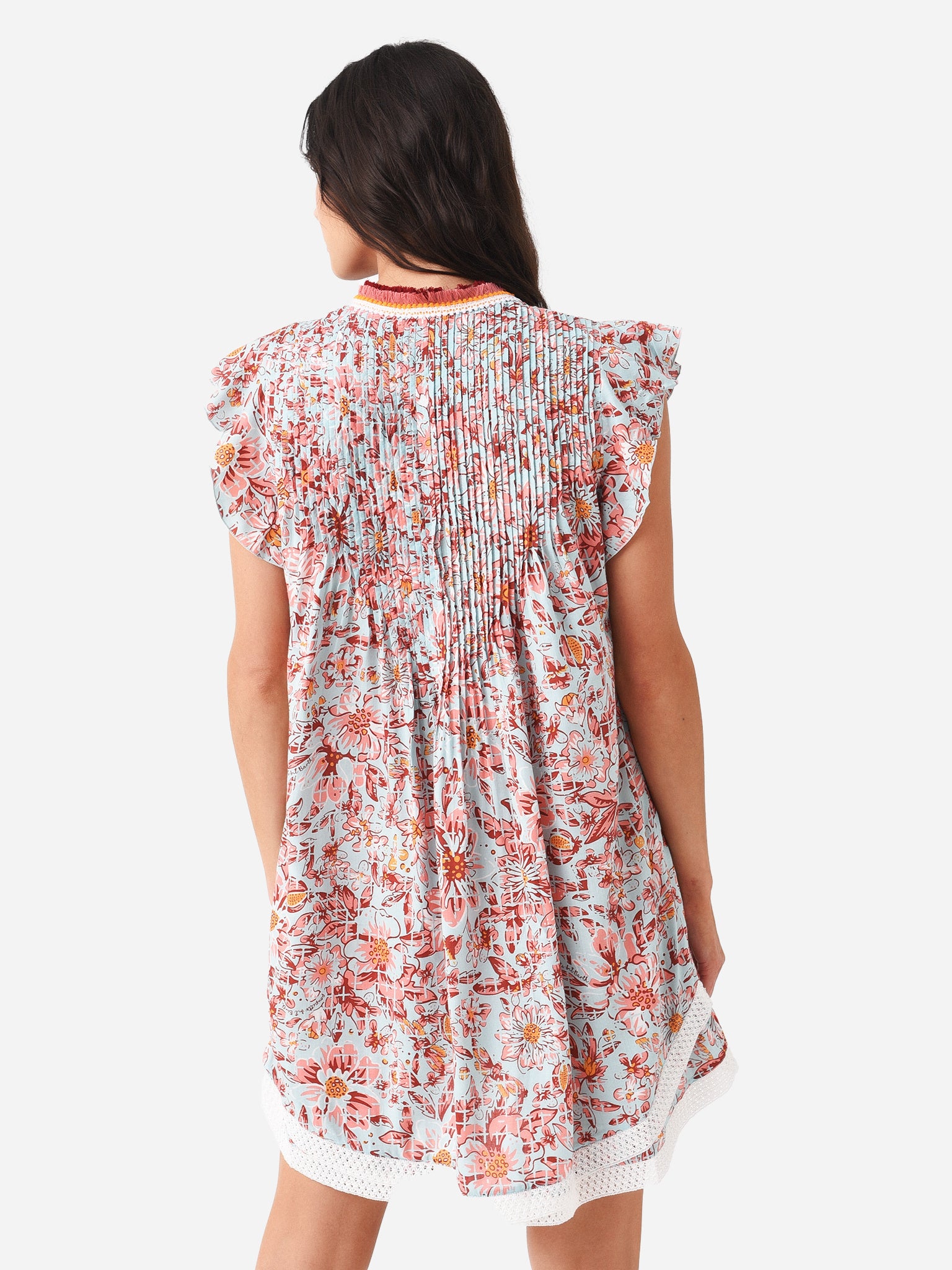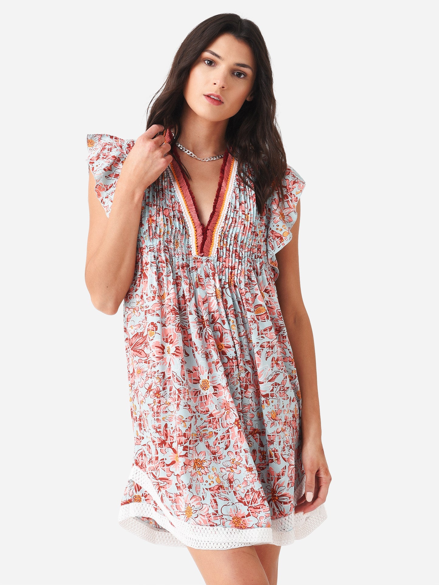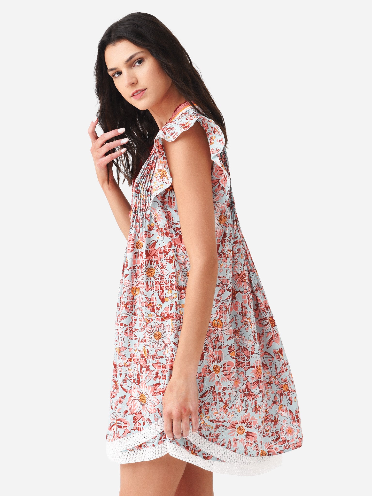 Mini dress with crocheted trim and a flared silhouette.