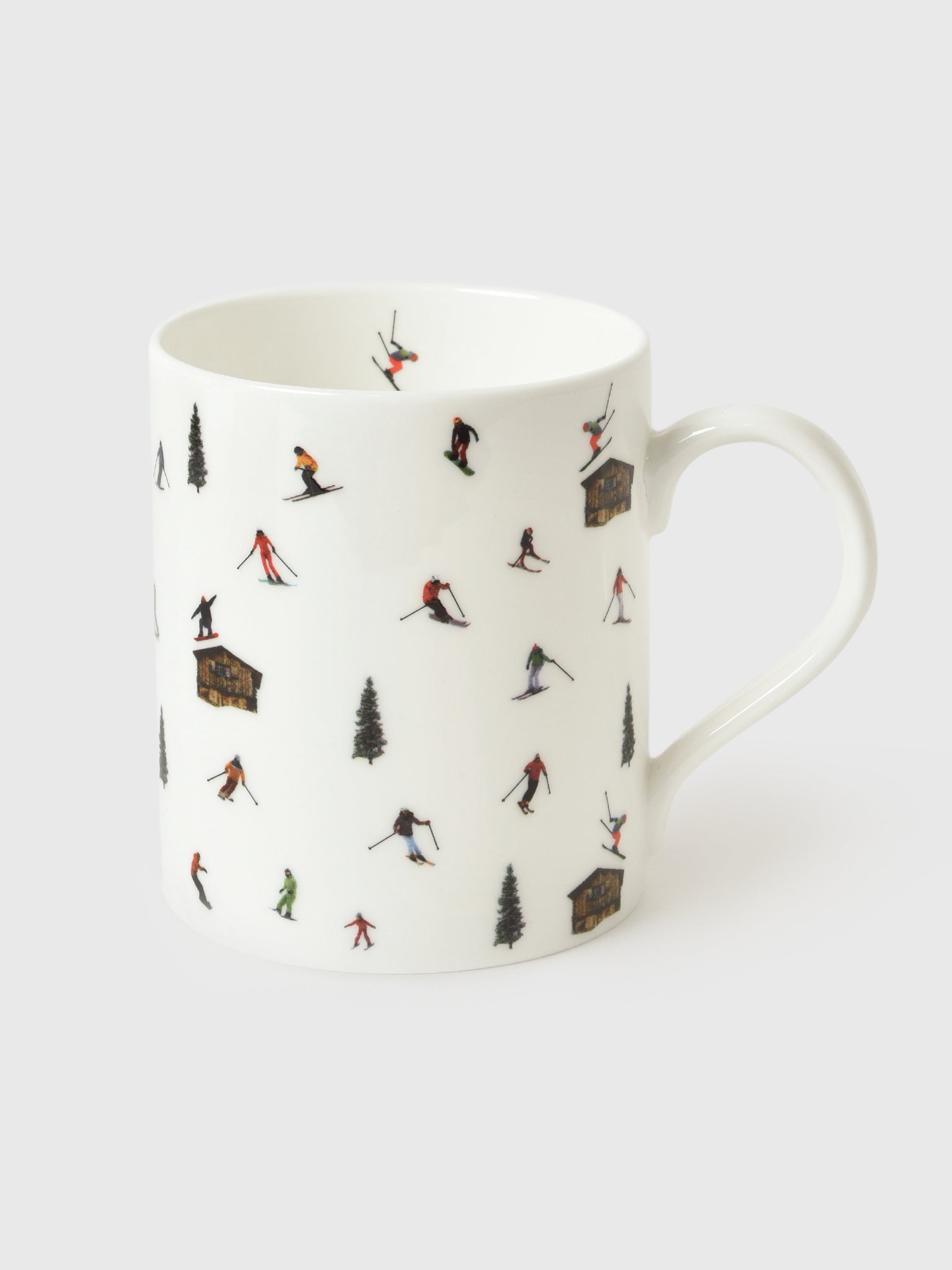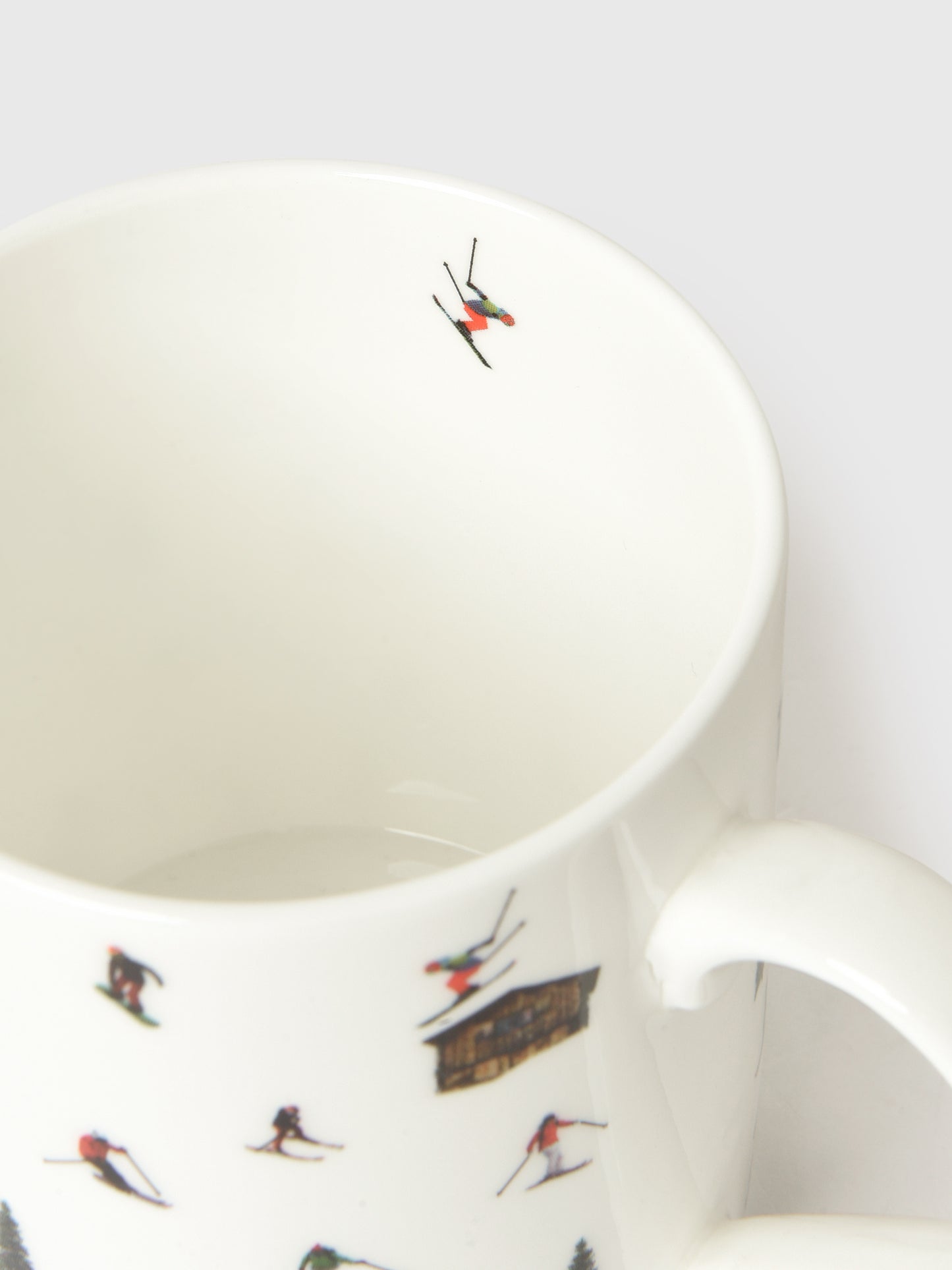 This mug features a lively design of skiers and snowboarders carving down the mountain, past cozy huts and snow-covered trees.