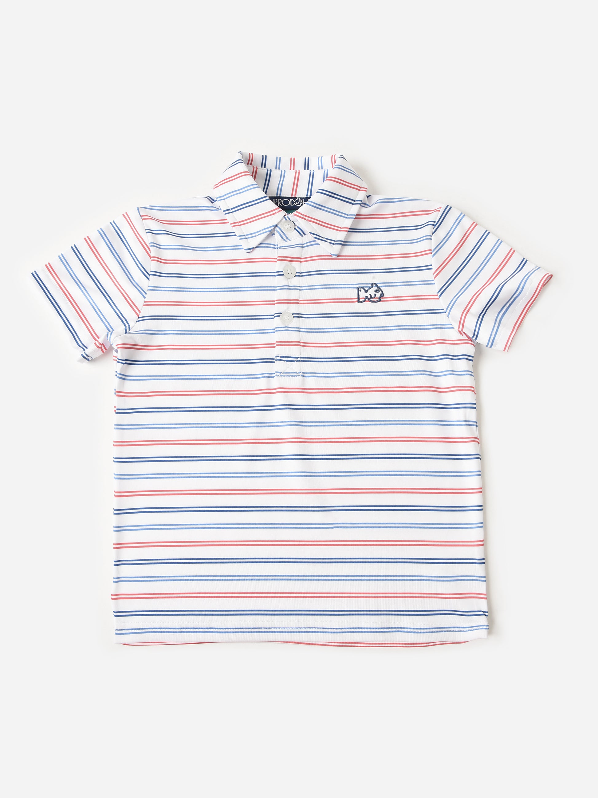 A lightweight polo made from breathable performance fabric with a three-button placket and stripe print.