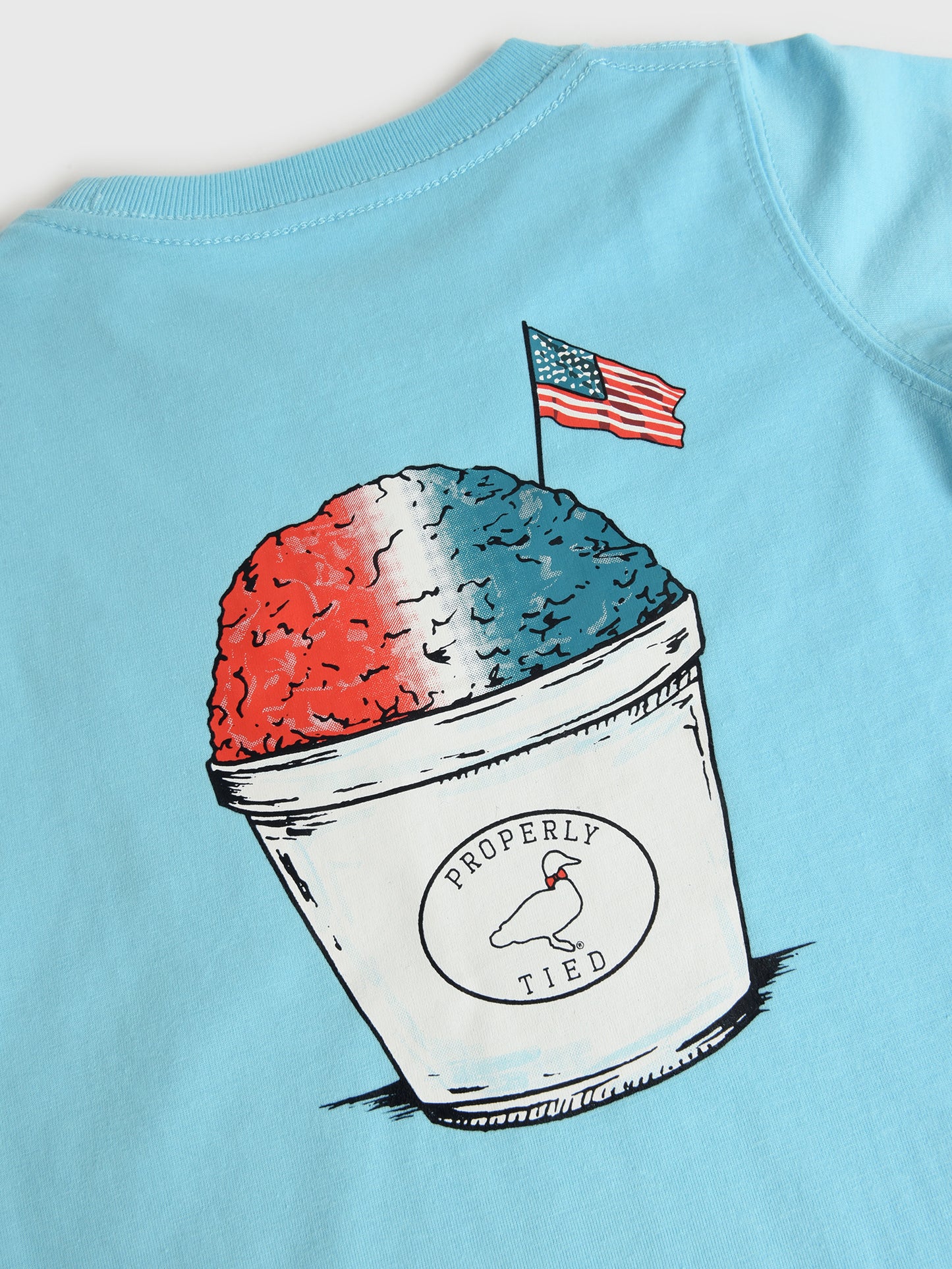 This patriotic tee is made from soft cotton and features a red, white, and blue snow cone graphic.