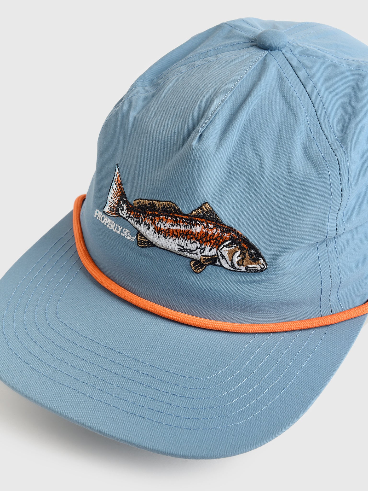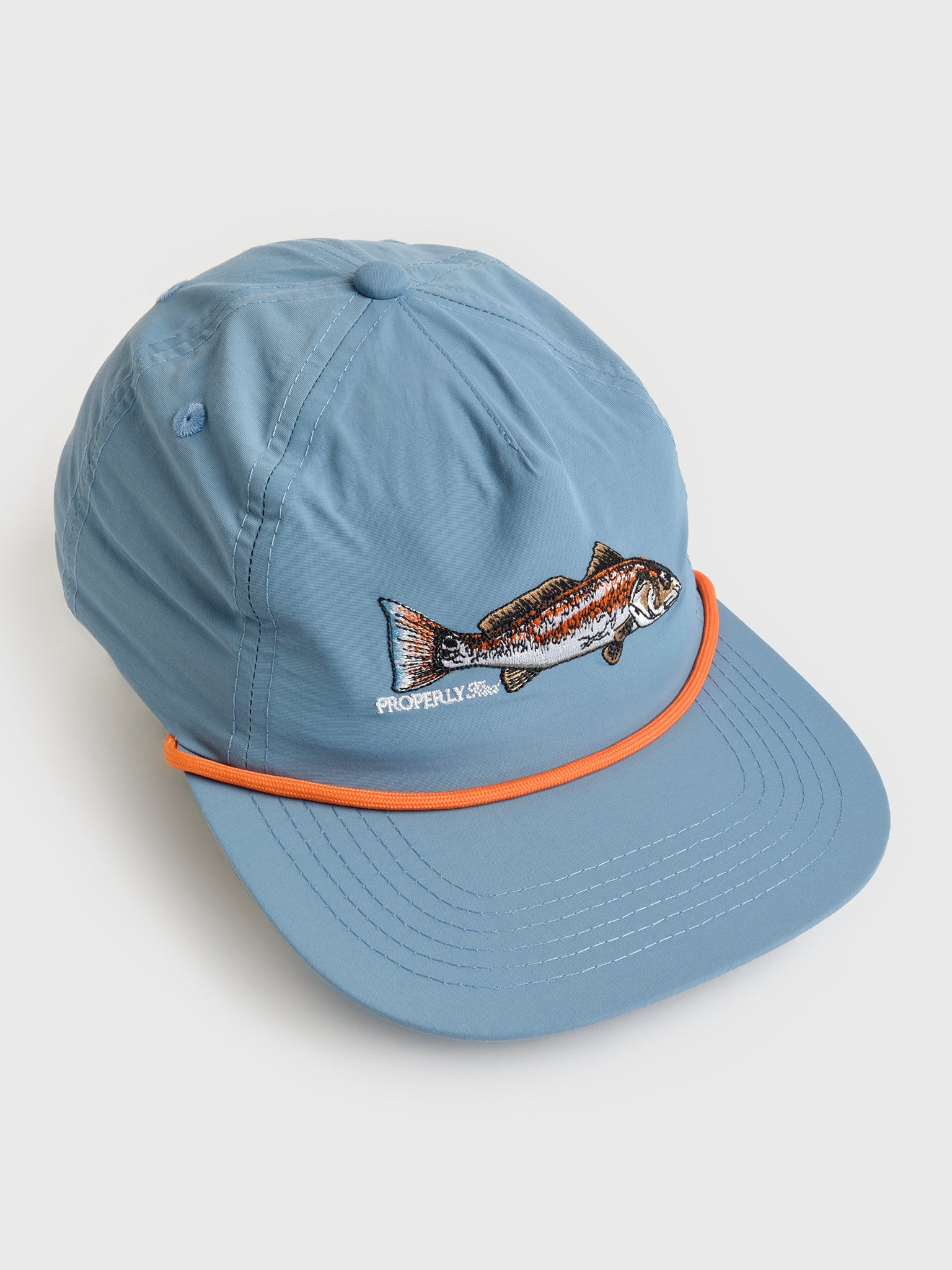 A breathable hat made from lightweight nylon with an embroidered redfish graphic.