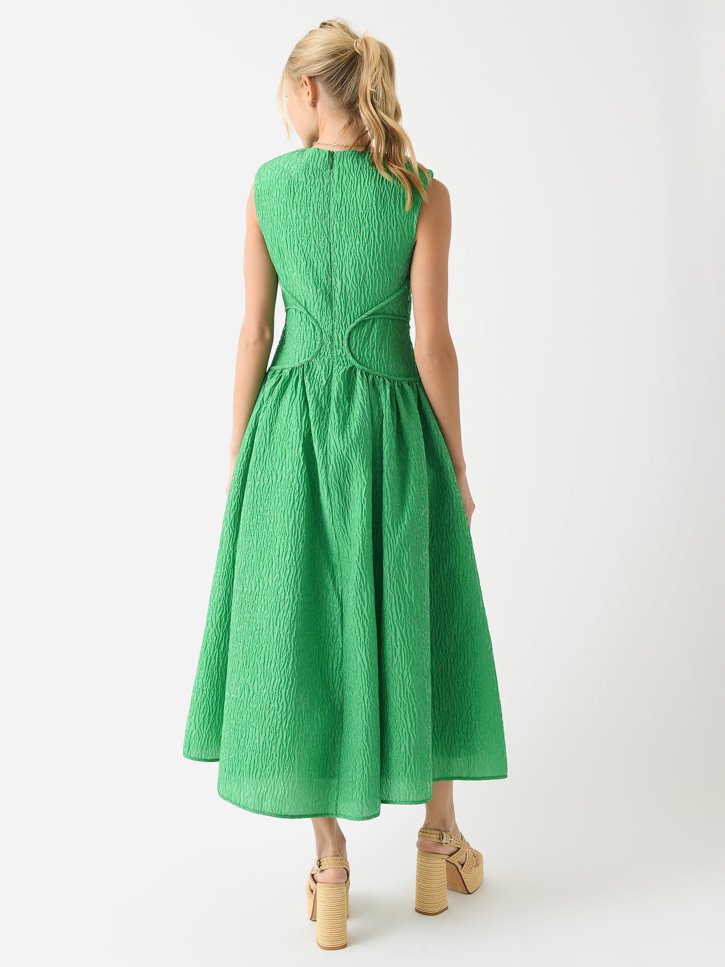This flattering dress features a cinched bodice and piping details for extra dimension that flows into a full skirt.