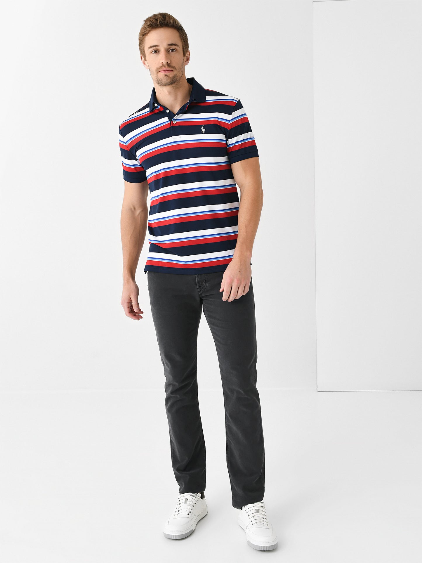 - Model is wearing size Large polo.