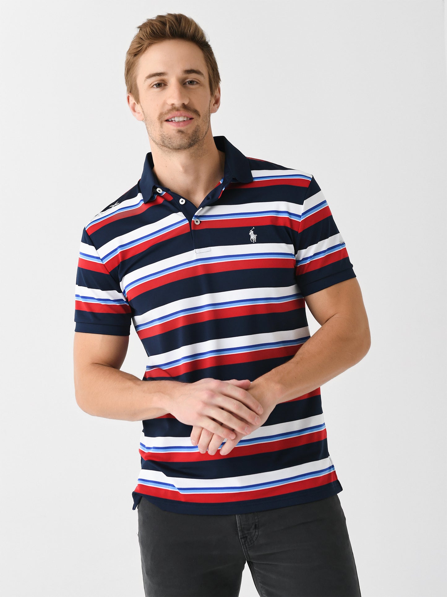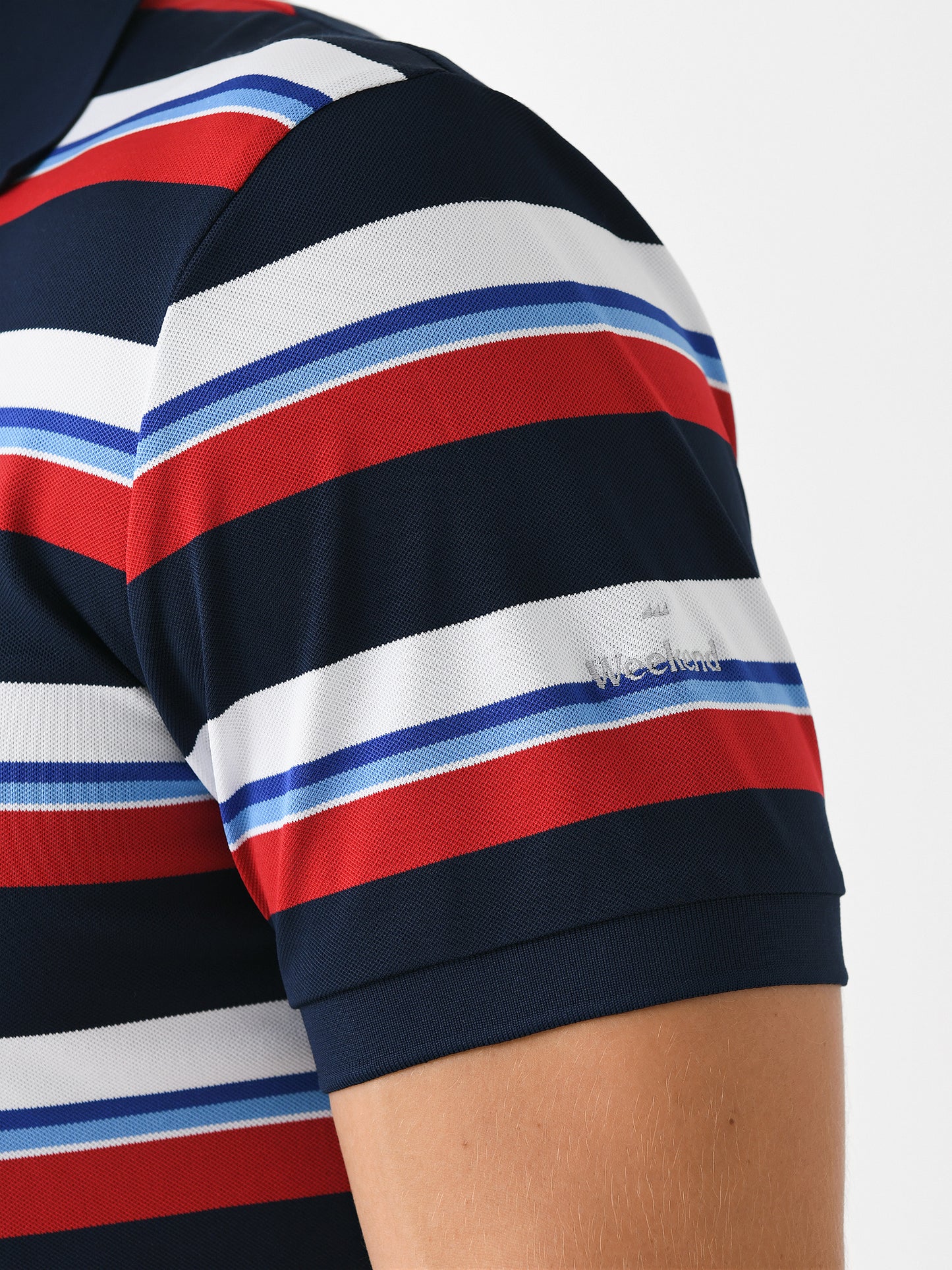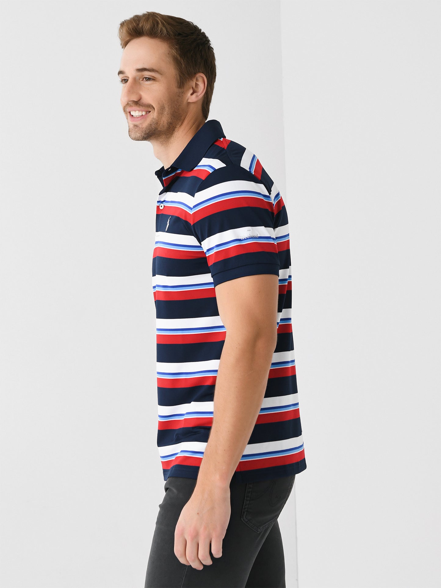A soft performance polo with a striped print and custom Weekend sleeve embroidery.