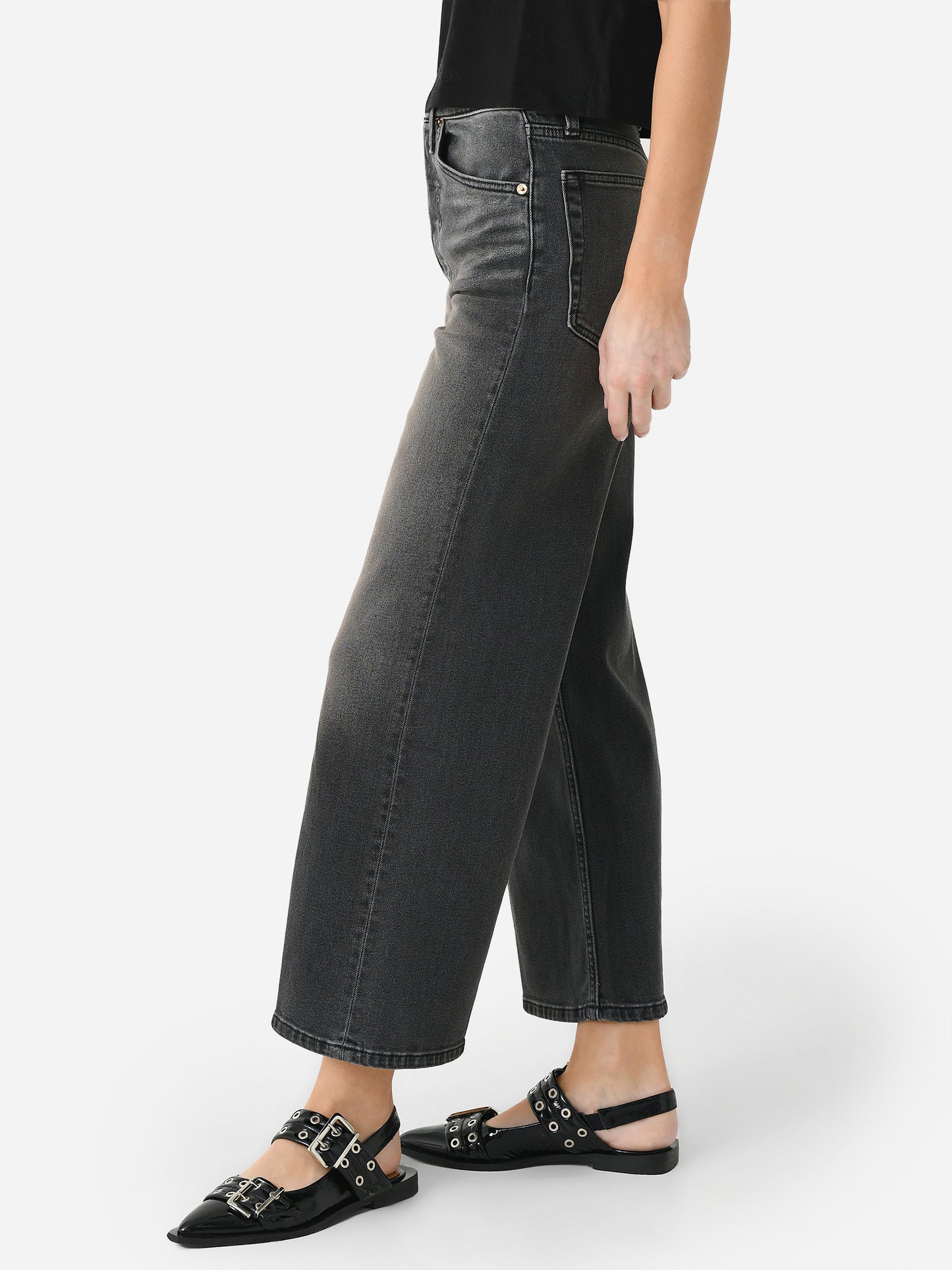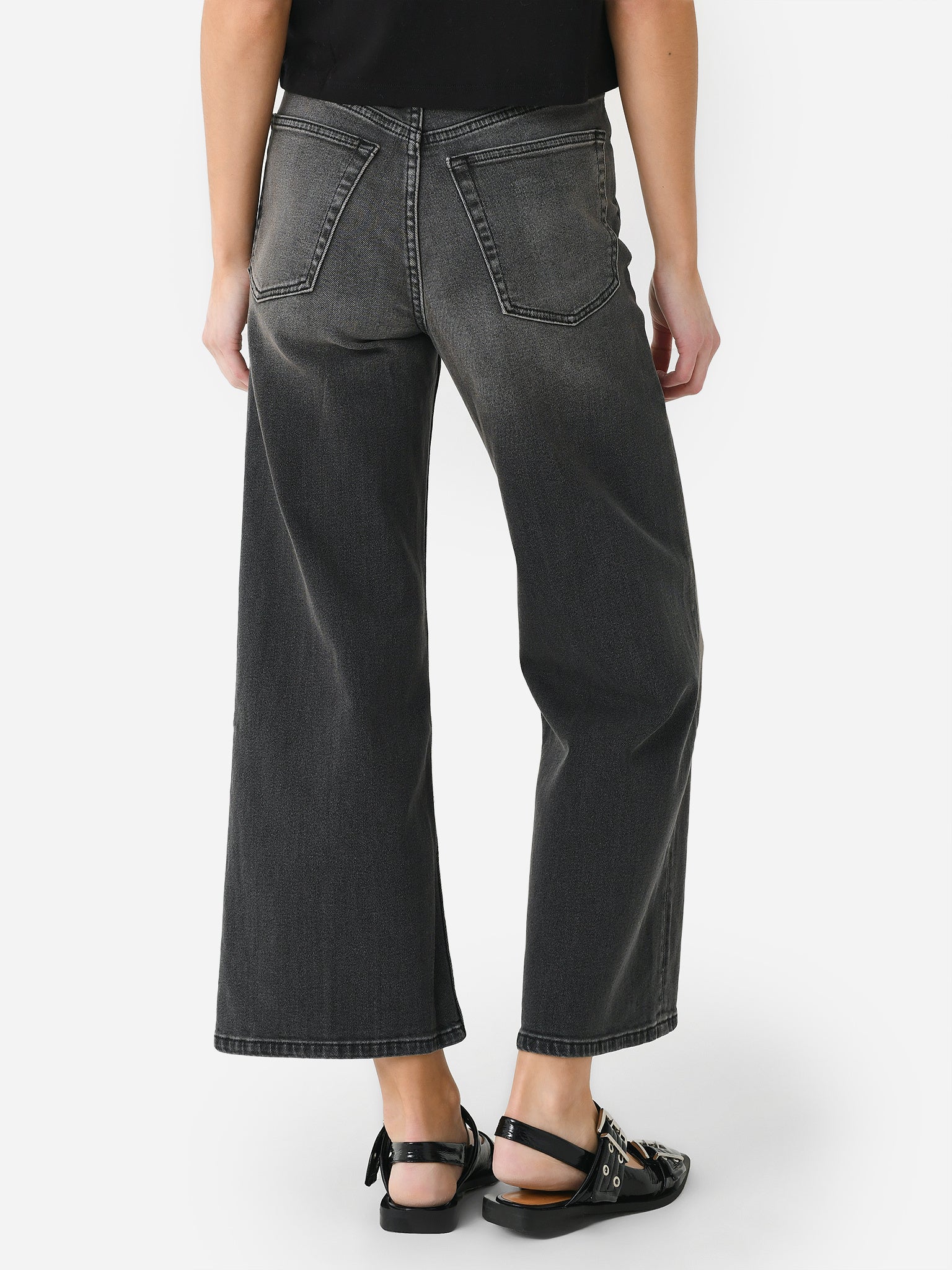A faded black stretch denim jean with a cropped, wide-leg silhouette.