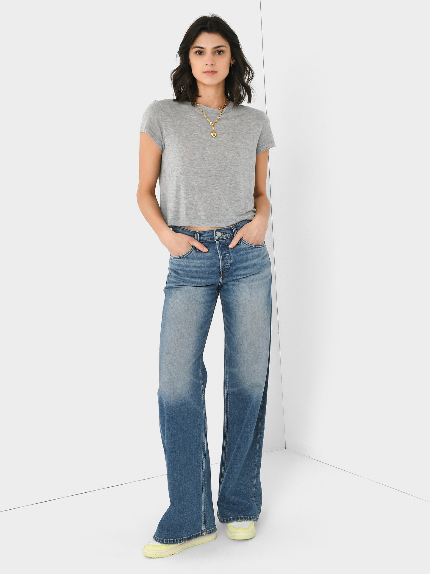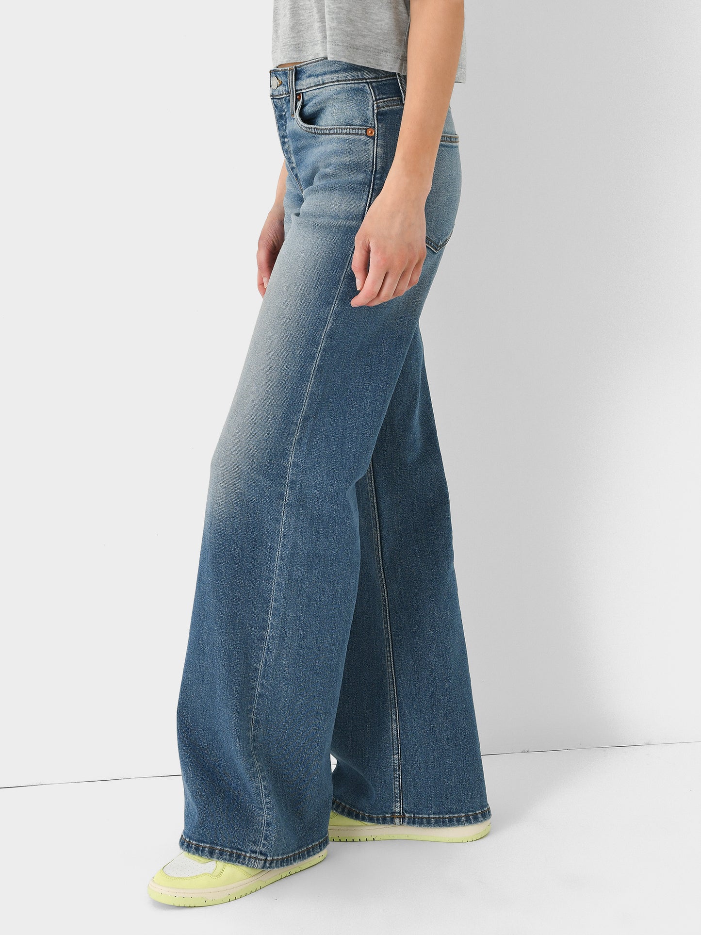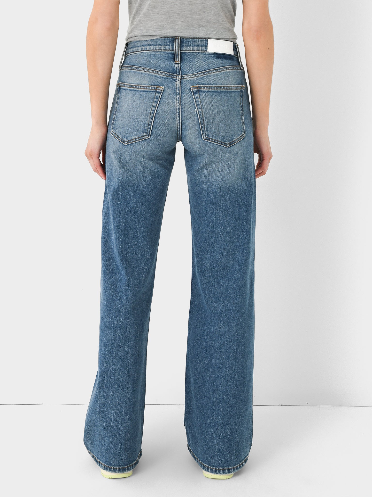 A mid-rise stretch denim jean with a wide-leg silhouette with faded details.